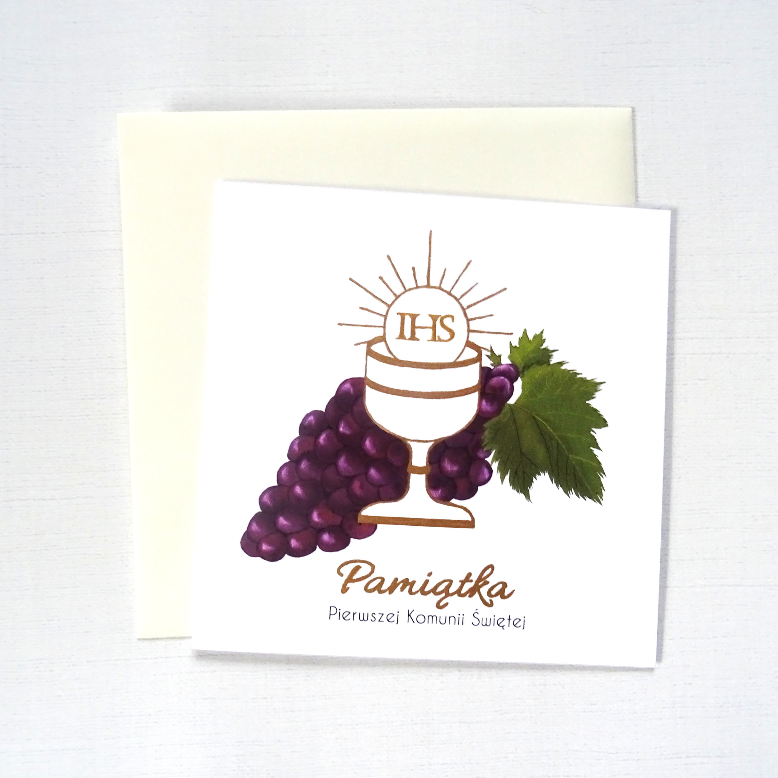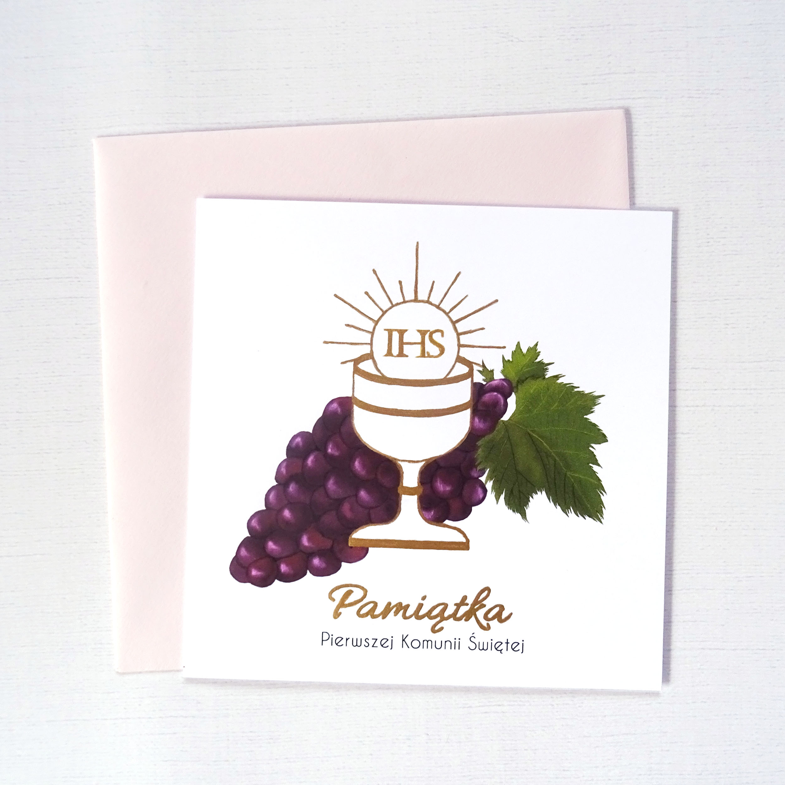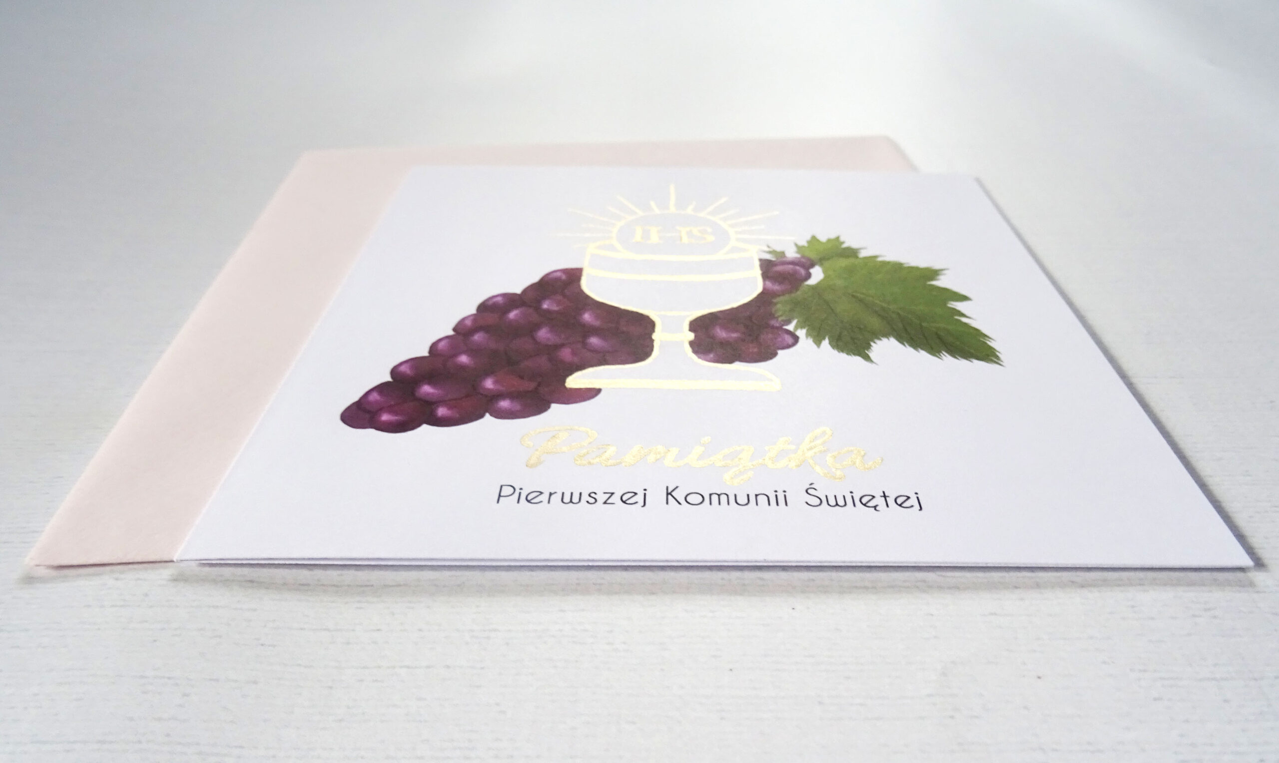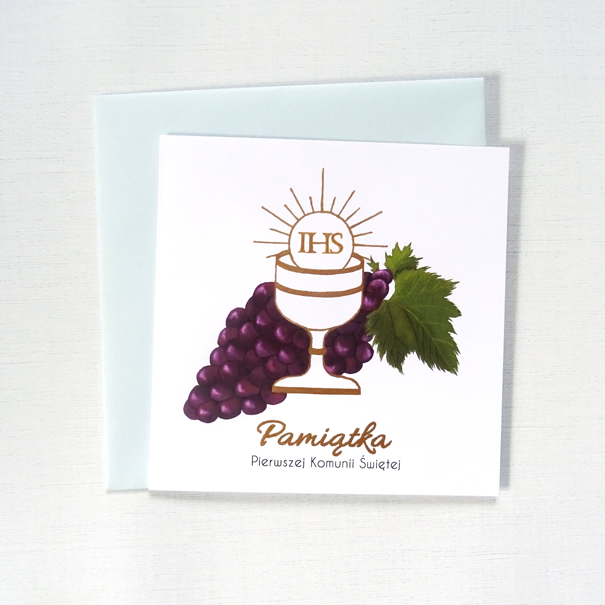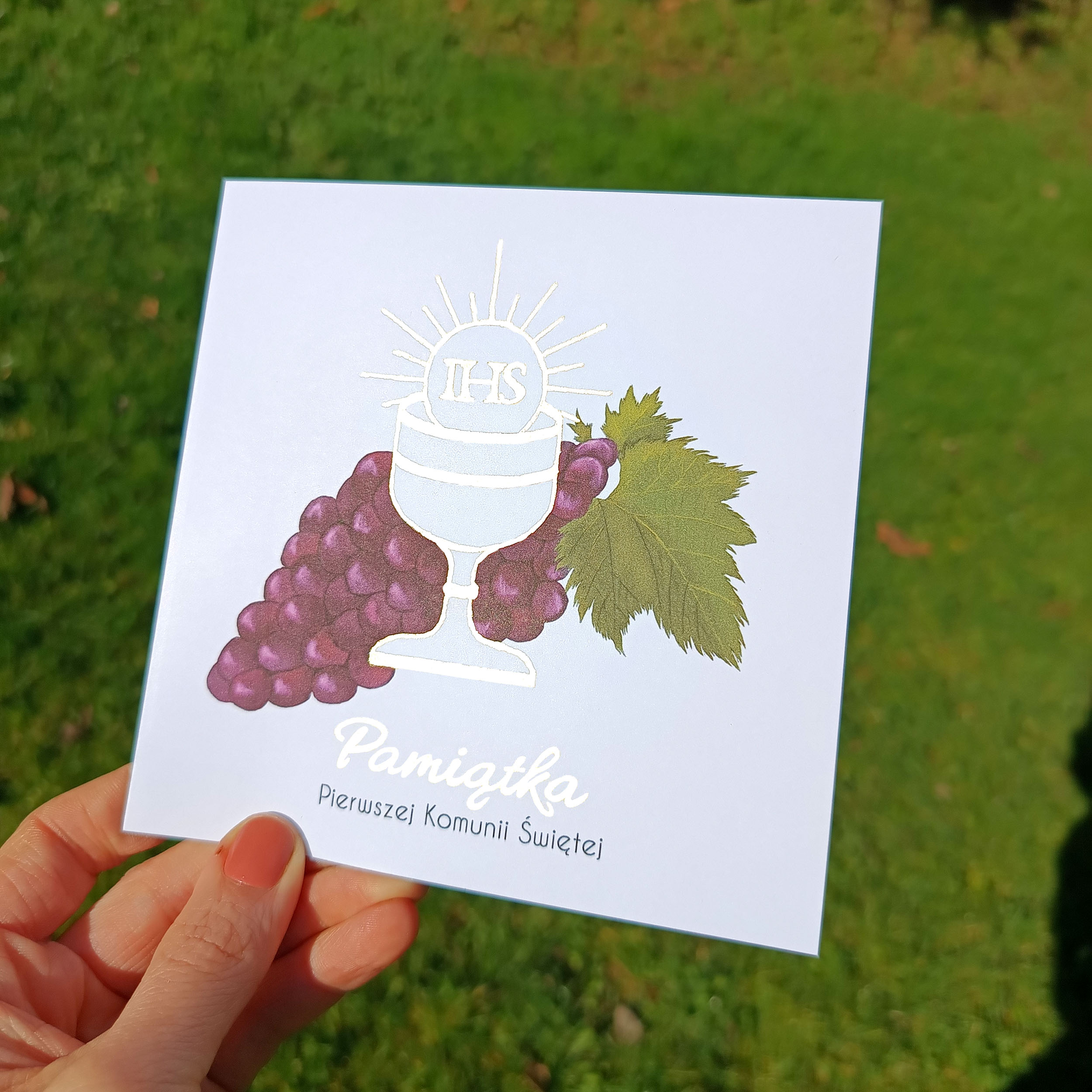 Kartka komunijna, wyjątkowa Pamiątka Pierwszej Komunii Świętej, z ręcznie zdobionym złotym kielichem, hostią i winogronem to piękny sposób, by zatrzymać w pamięci jeden z najważniejszych dni w życiu dziecka.