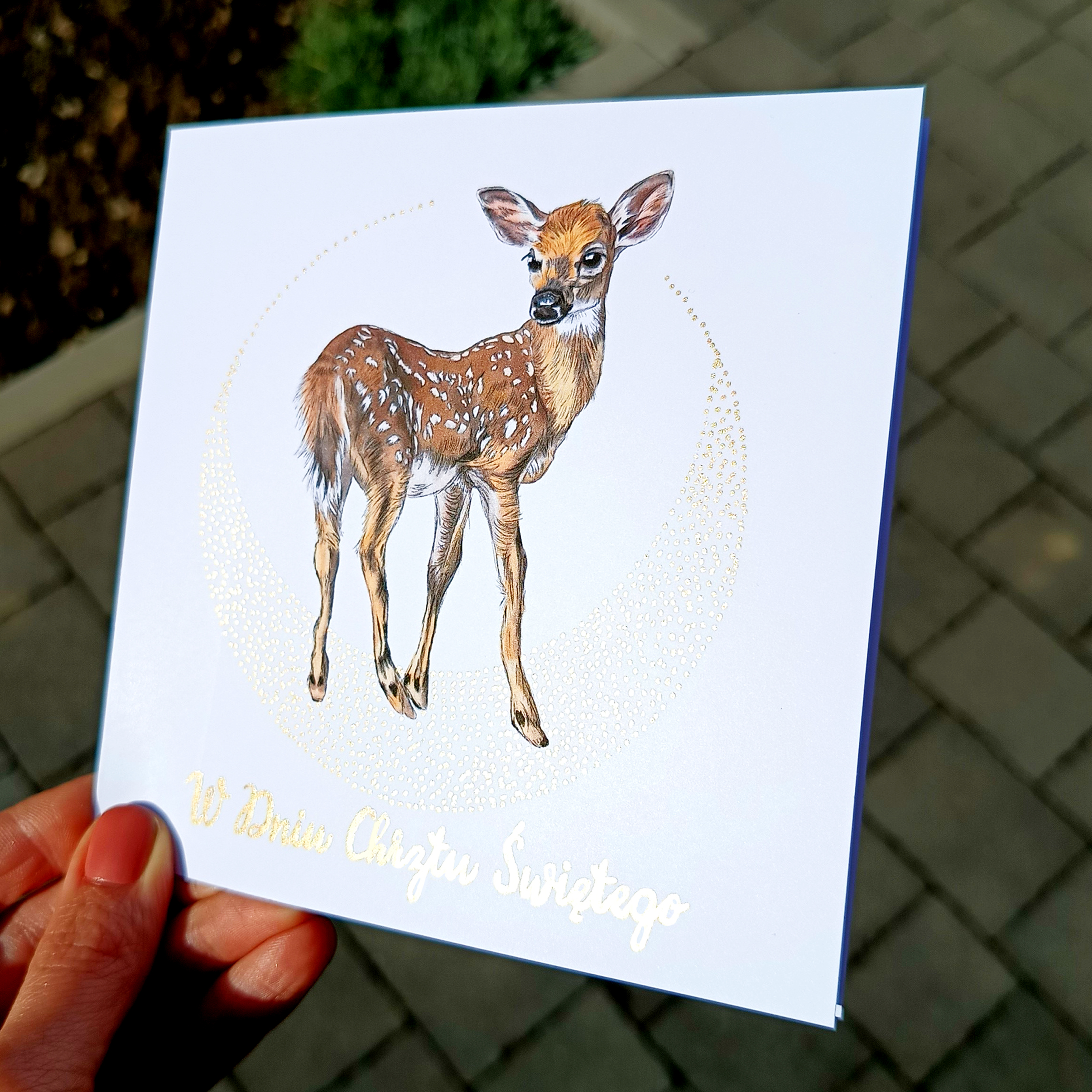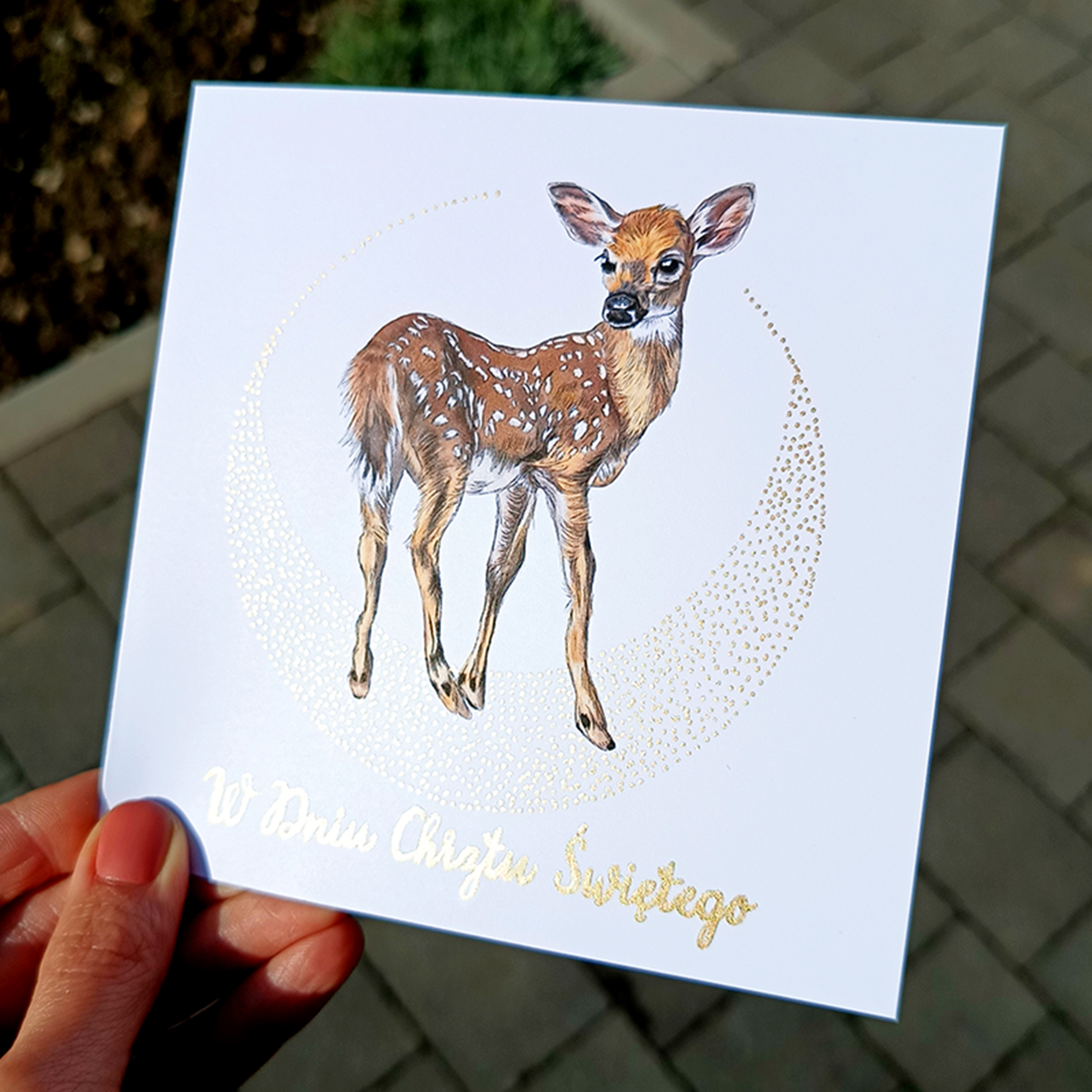 Ilustrację otaczają ręcznie nanoszone, złote kropeczki układające się w delikatny kształt księżyca. Subtelny połysk dodaje kartce elegancji i podkreśla jej wyjątkowy, minimalistyczny charakter.