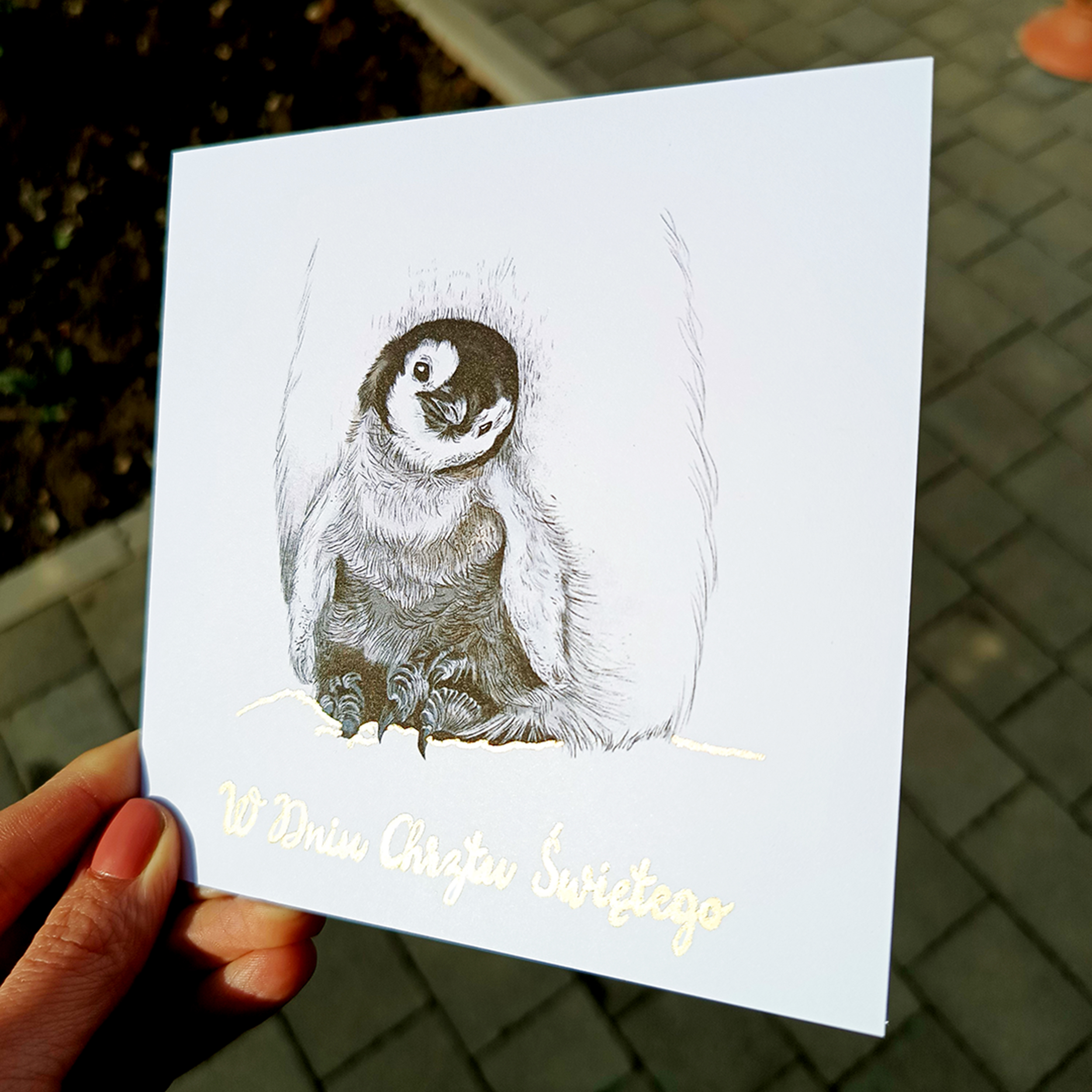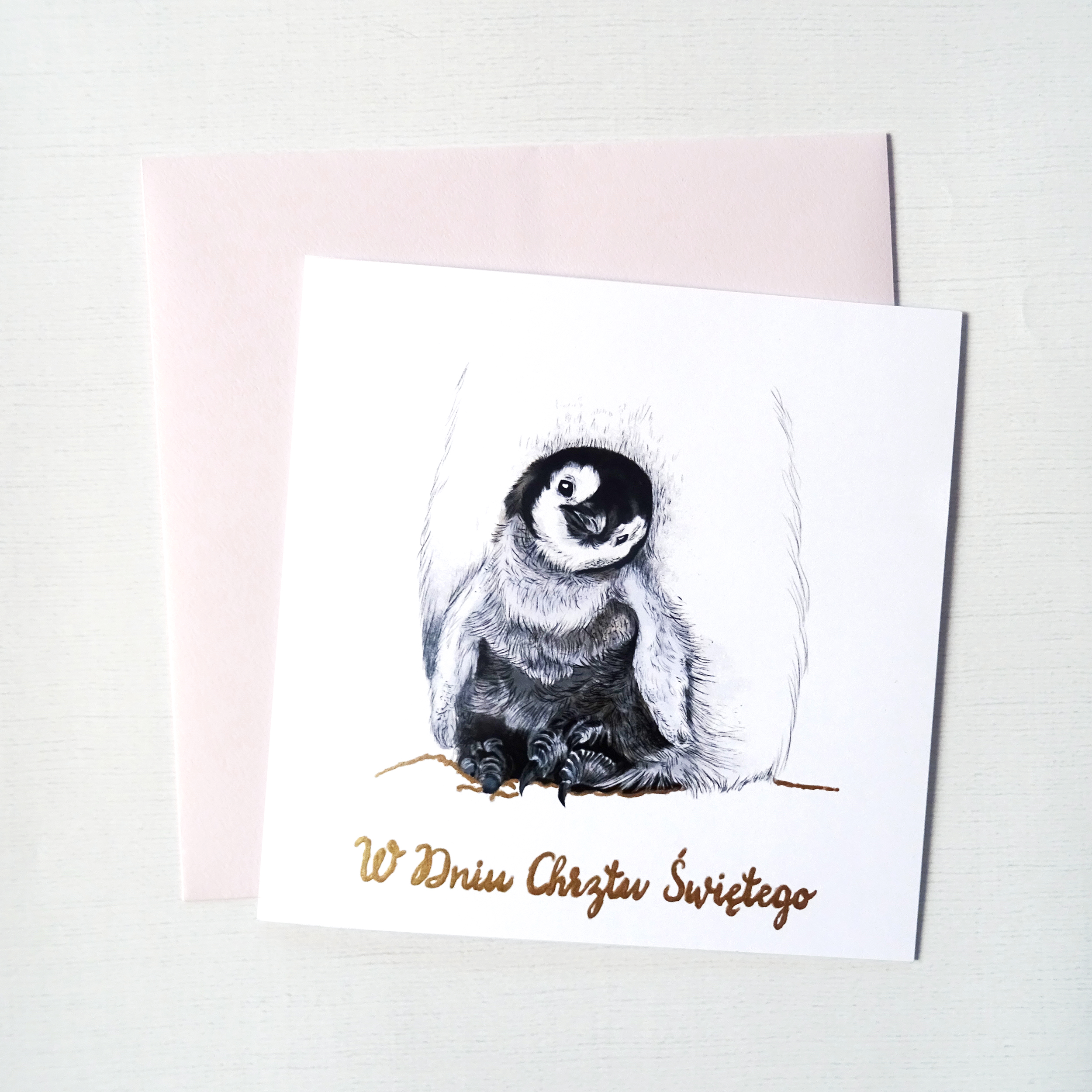 Kartka na Chrzest Święty z pingwinkiem to ręcznie zdobiona kartka z delikatnymi złotymi detalami, idealna jako elegancka i symboliczna pamiątka Chrztu Świętego.