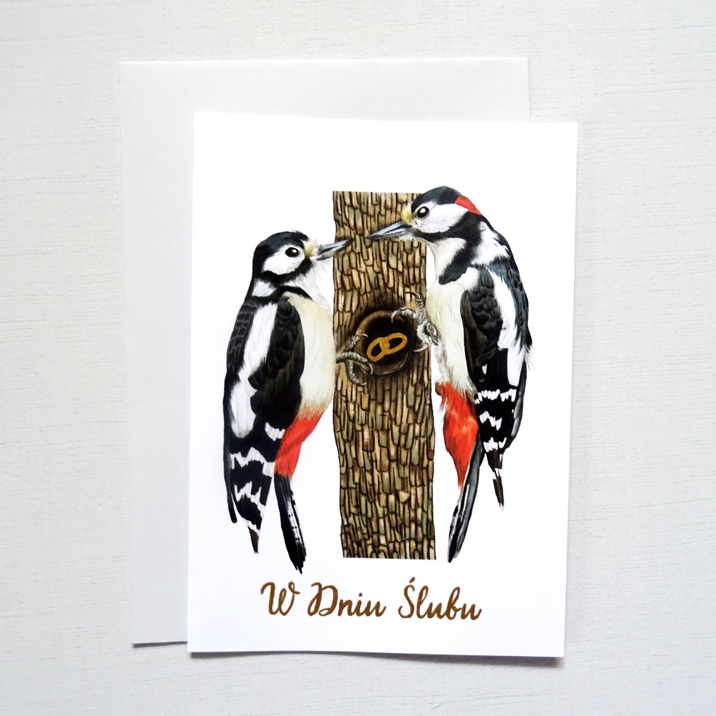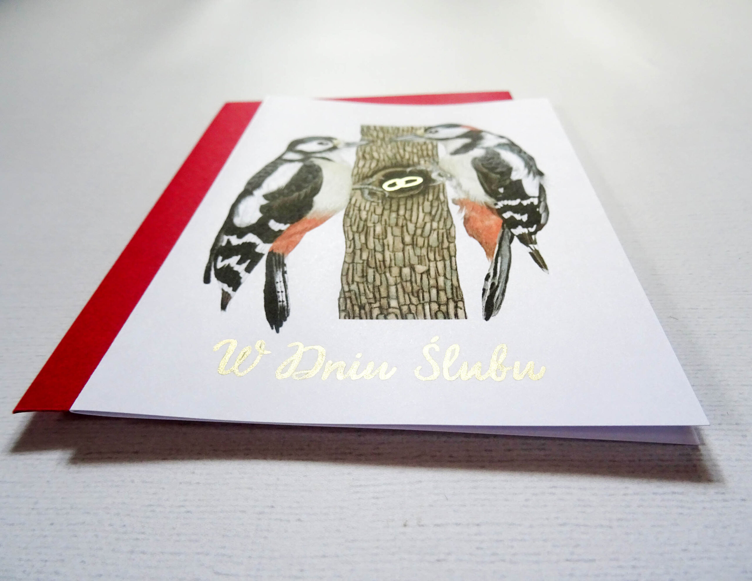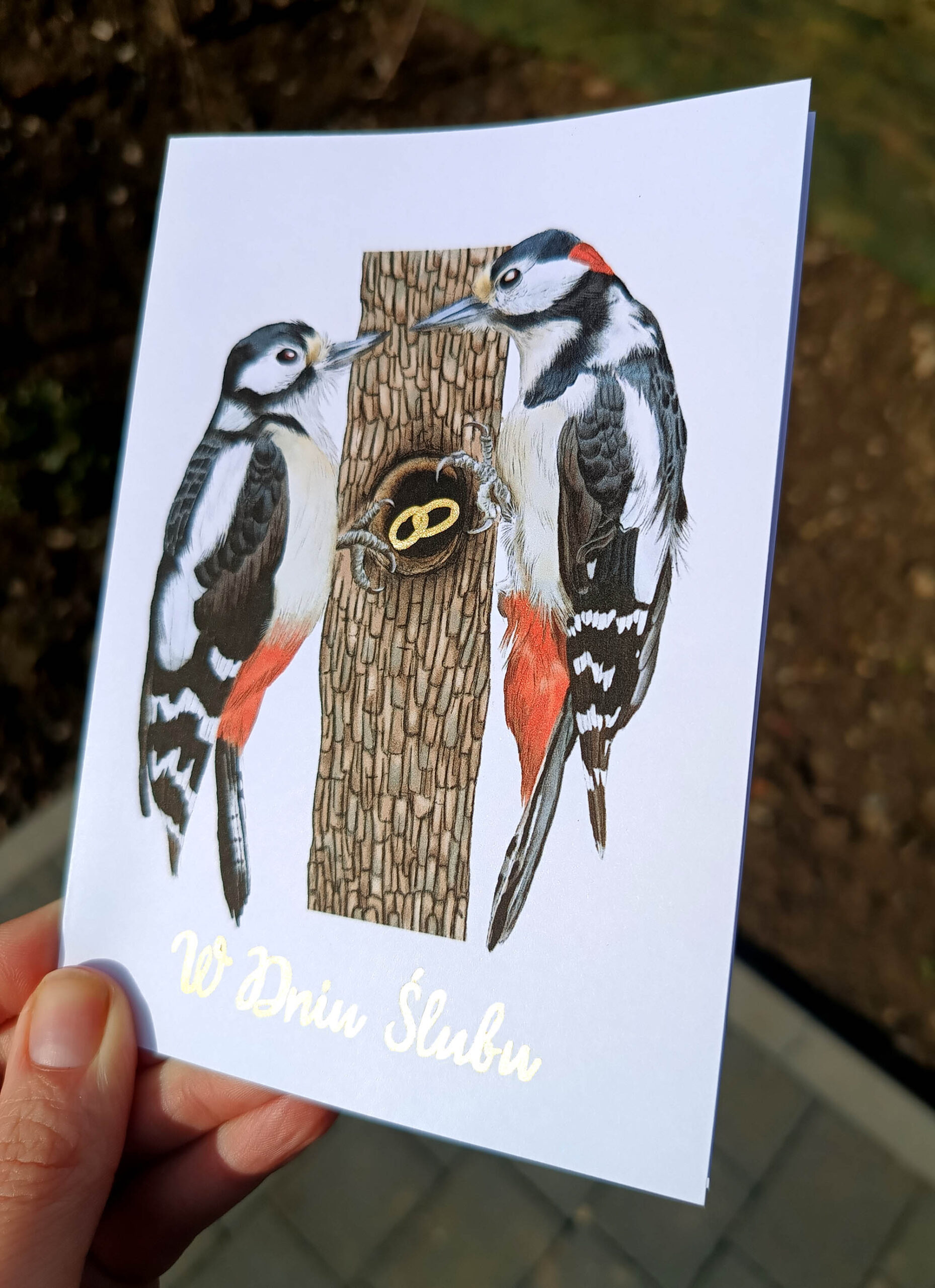 Na kartce widoczna jest para dzięciołów spotykających się przy dziupli – ich wspólnym domu. W jej wnętrzu znajdują się obrączki zdobione ręcznie złotymi detalami, subtelnie połyskujące w świetle. Złoty napis „W Dniu Ślubu” nadaje całości elegancji i podkreśla wyjątkowy charakter uroczystości.