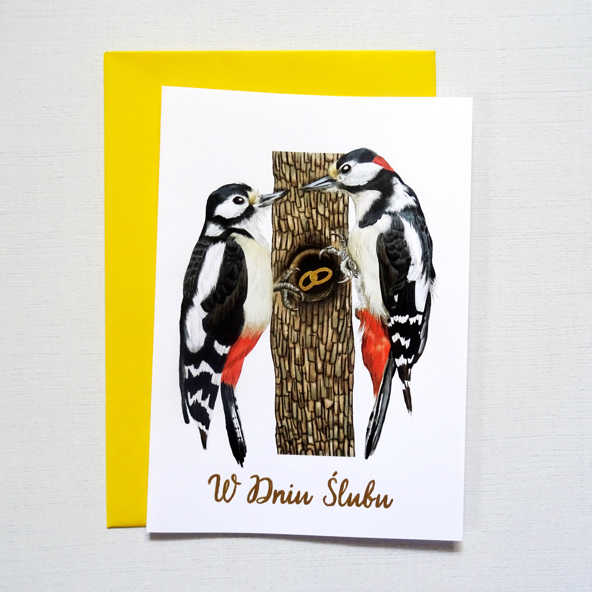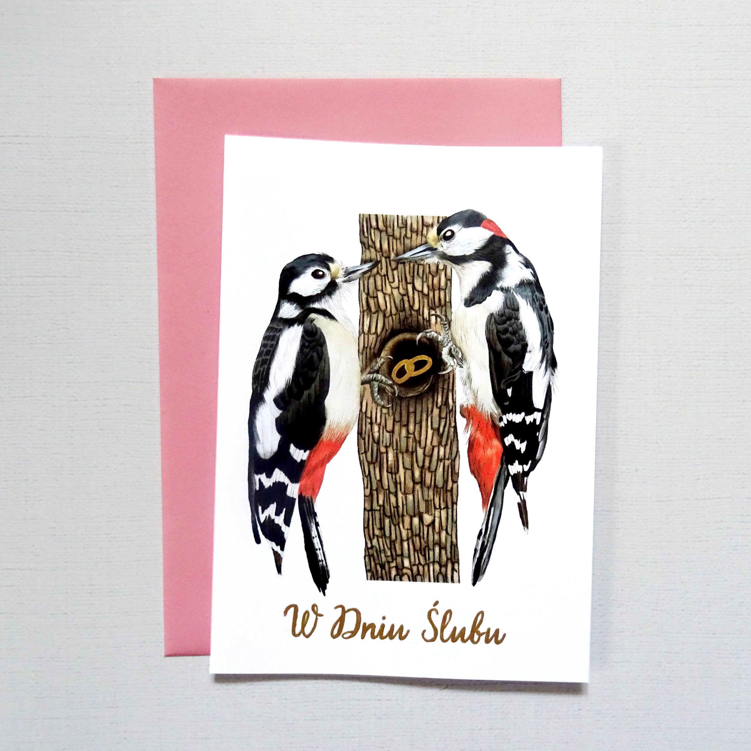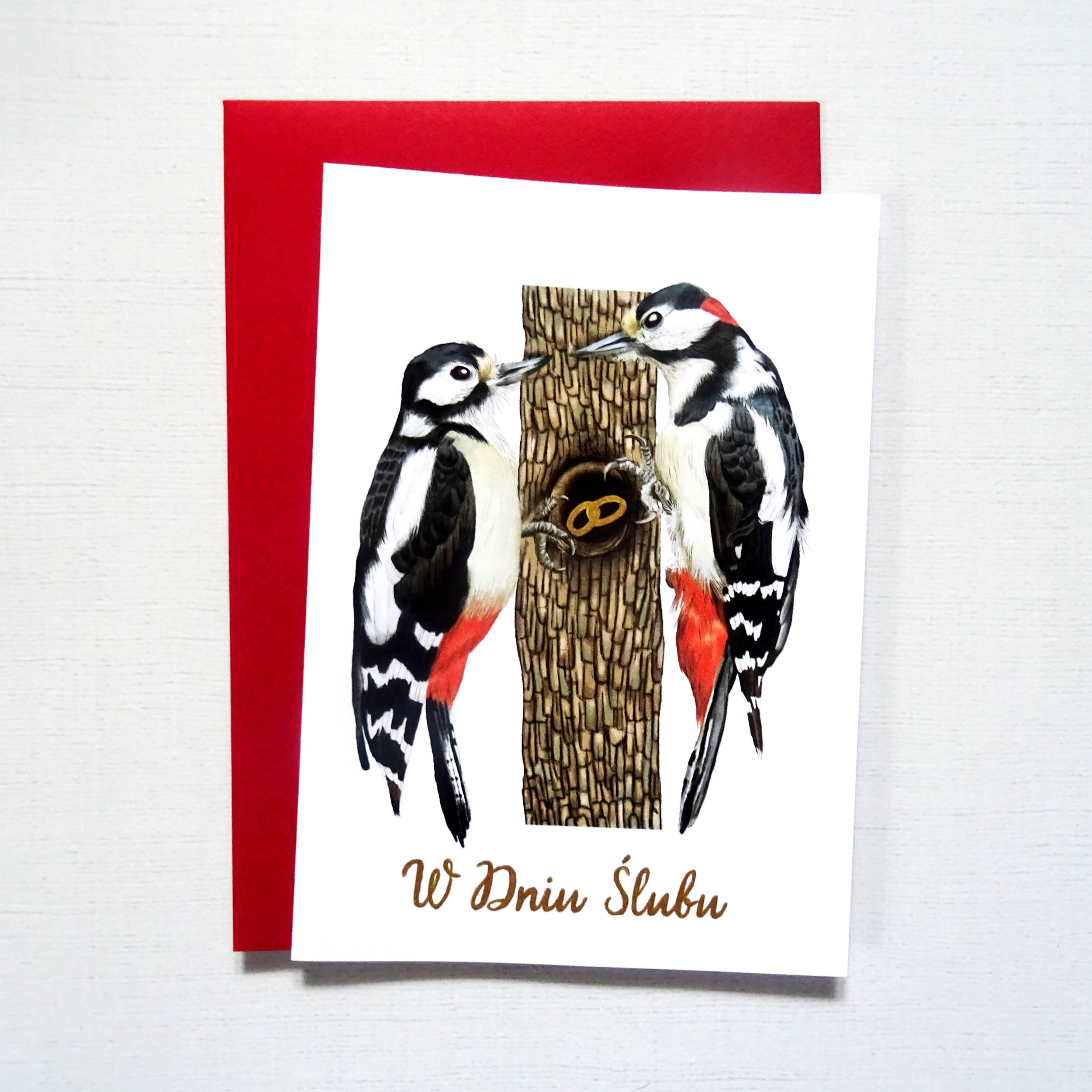 Na kartce widoczna jest para dzięciołów spotykających się przy dziupli – ich wspólnym domu. W jej wnętrzu znajdują się obrączki zdobione ręcznie złotymi detalami, subtelnie połyskujące w świetle. Złoty napis „W Dniu Ślubu” nadaje całości elegancji i podkreśla wyjątkowy charakter uroczystości.