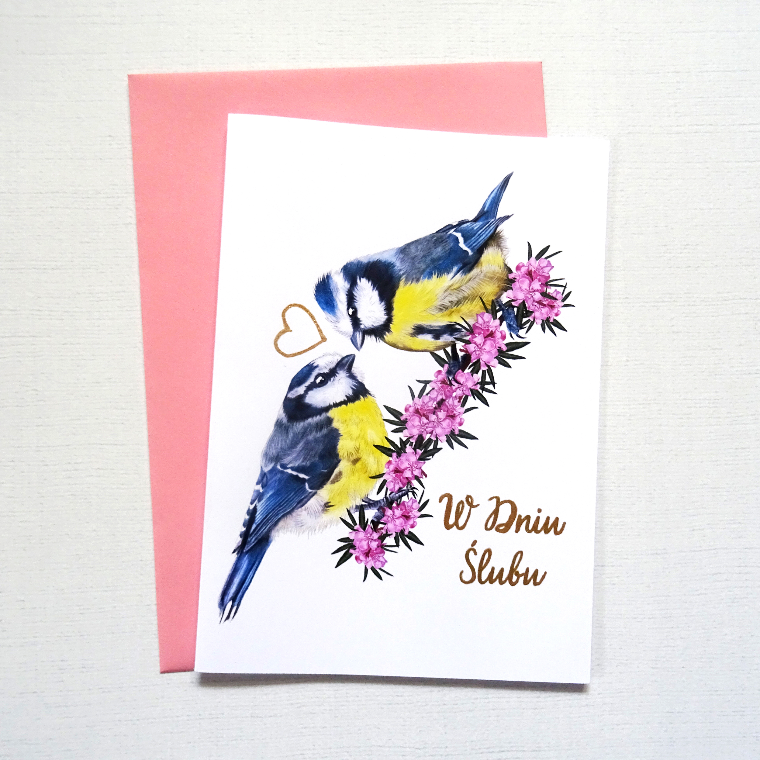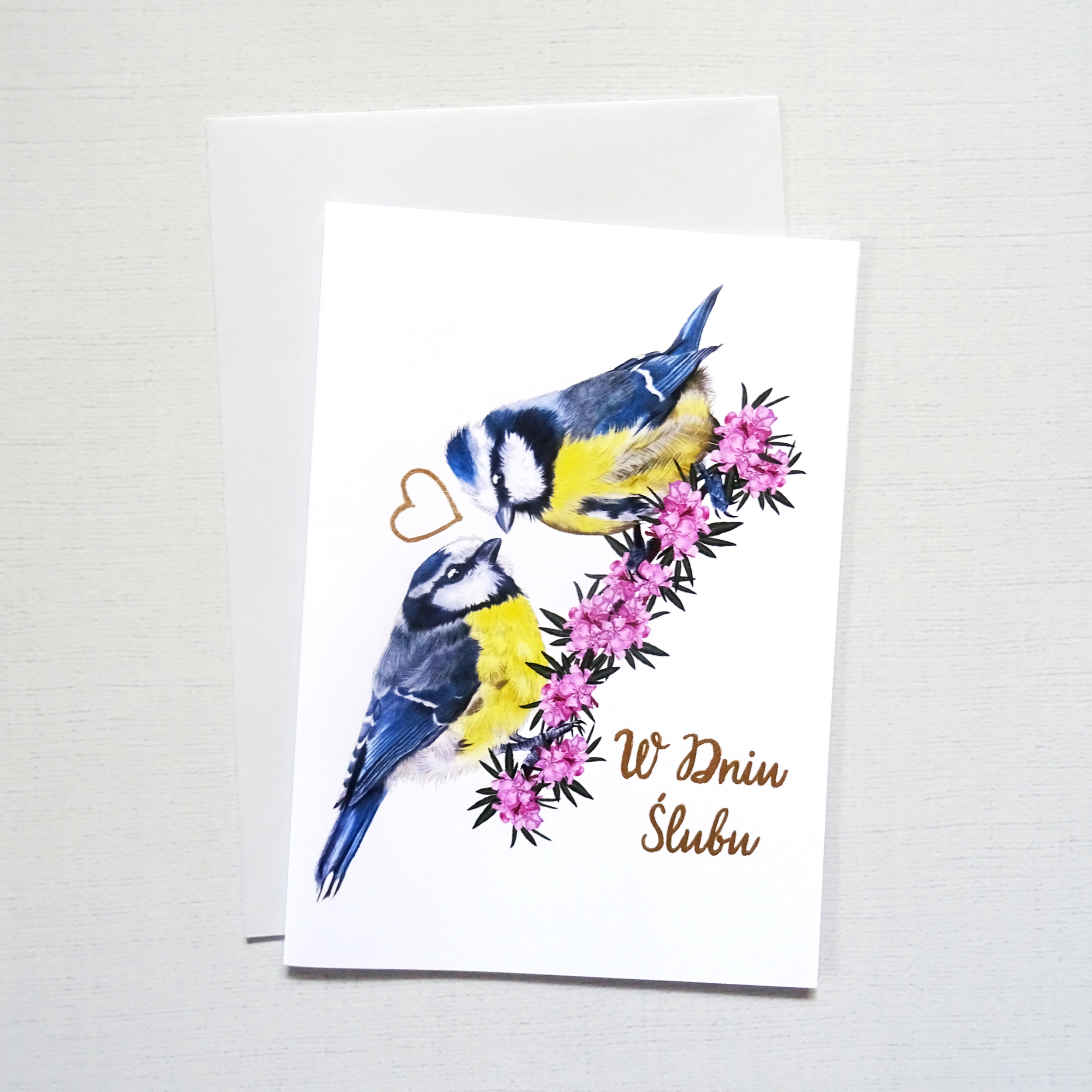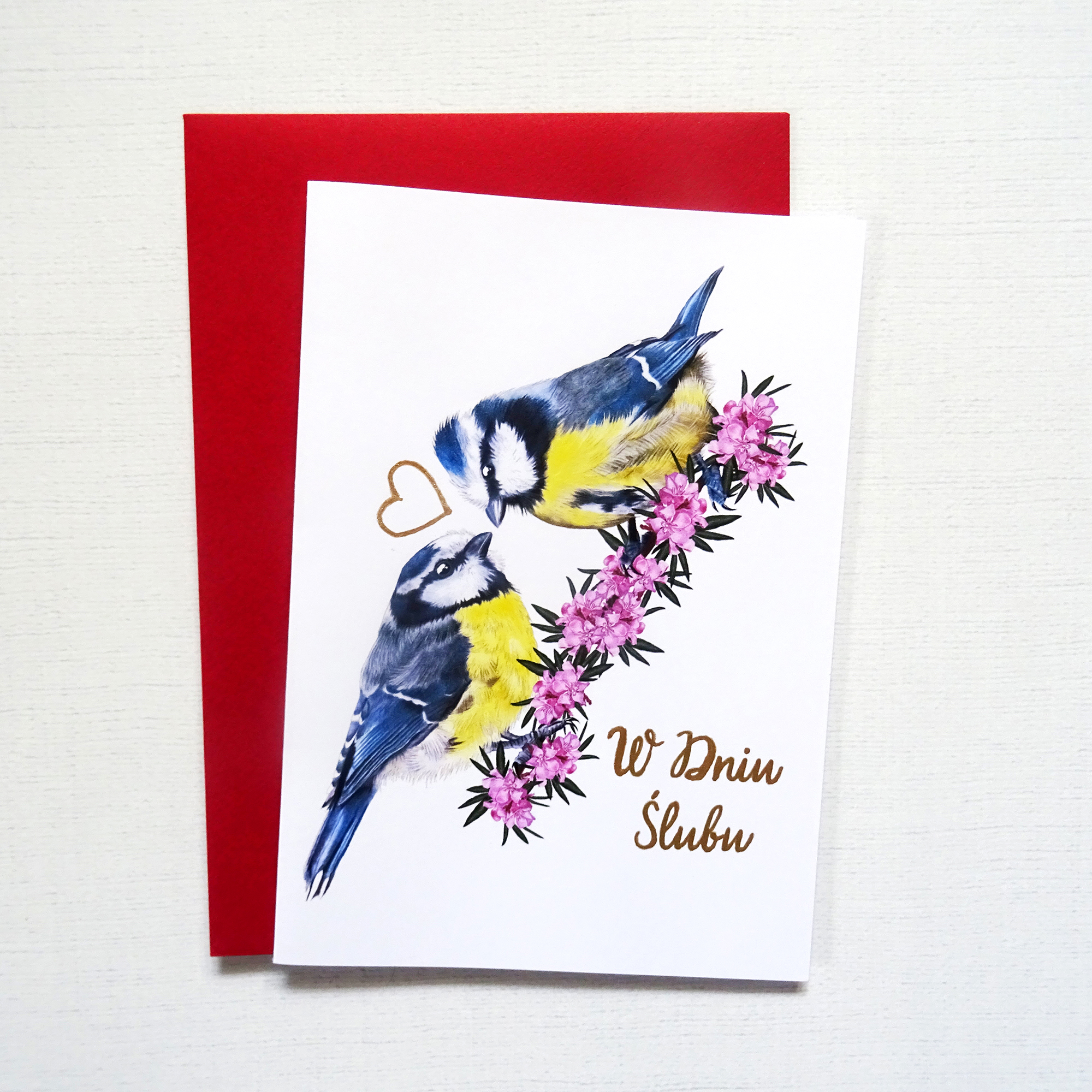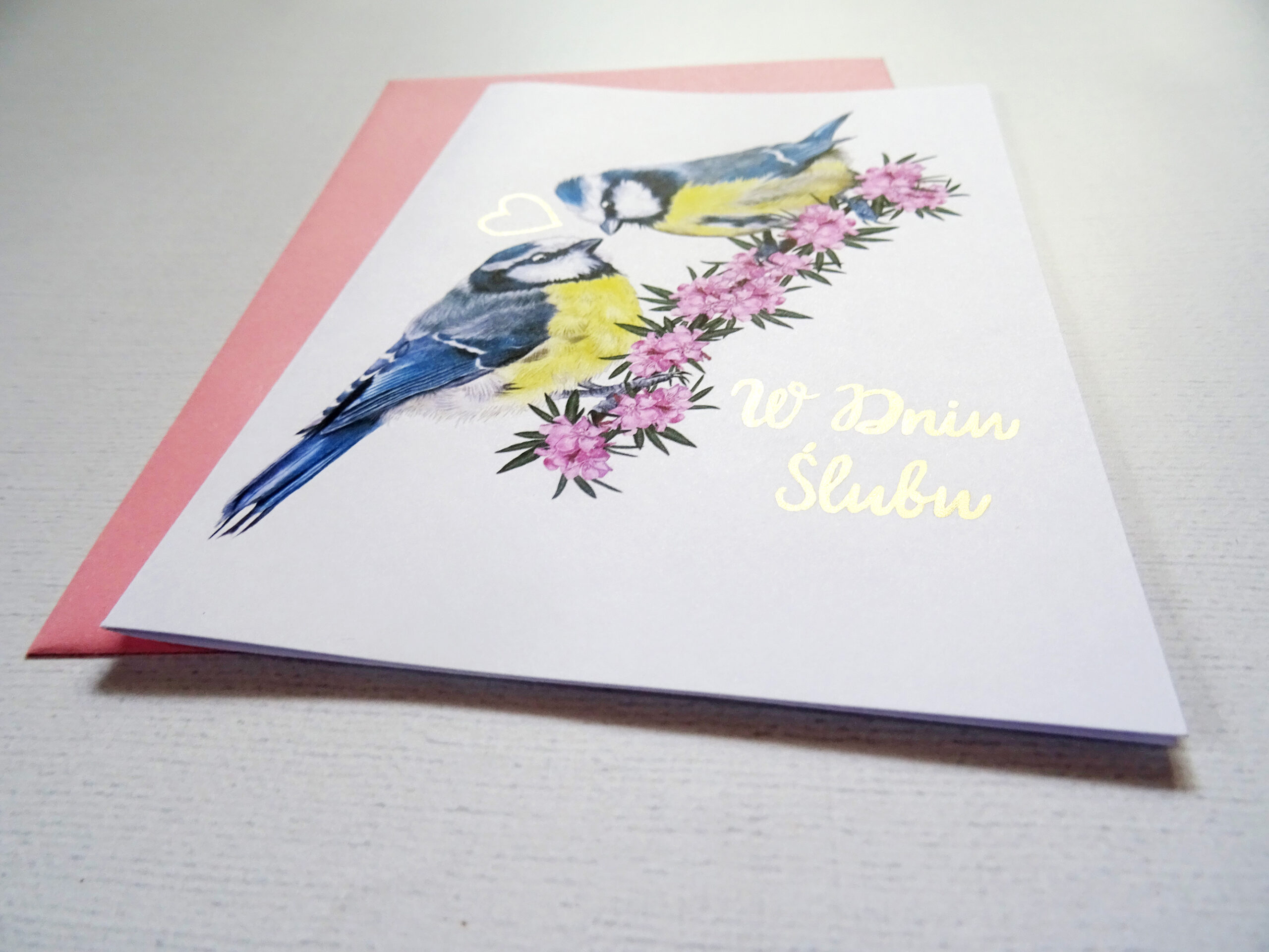 Pomiędzy ptakami znajduje się subtelne, ręcznie zdobione złote serce, które delikatnie mieni się w świetle. Ten drobny, ale wyjątkowy detal nadaje kartce elegancji i sprawia, że każda sztuka ma unikalny charakter.
