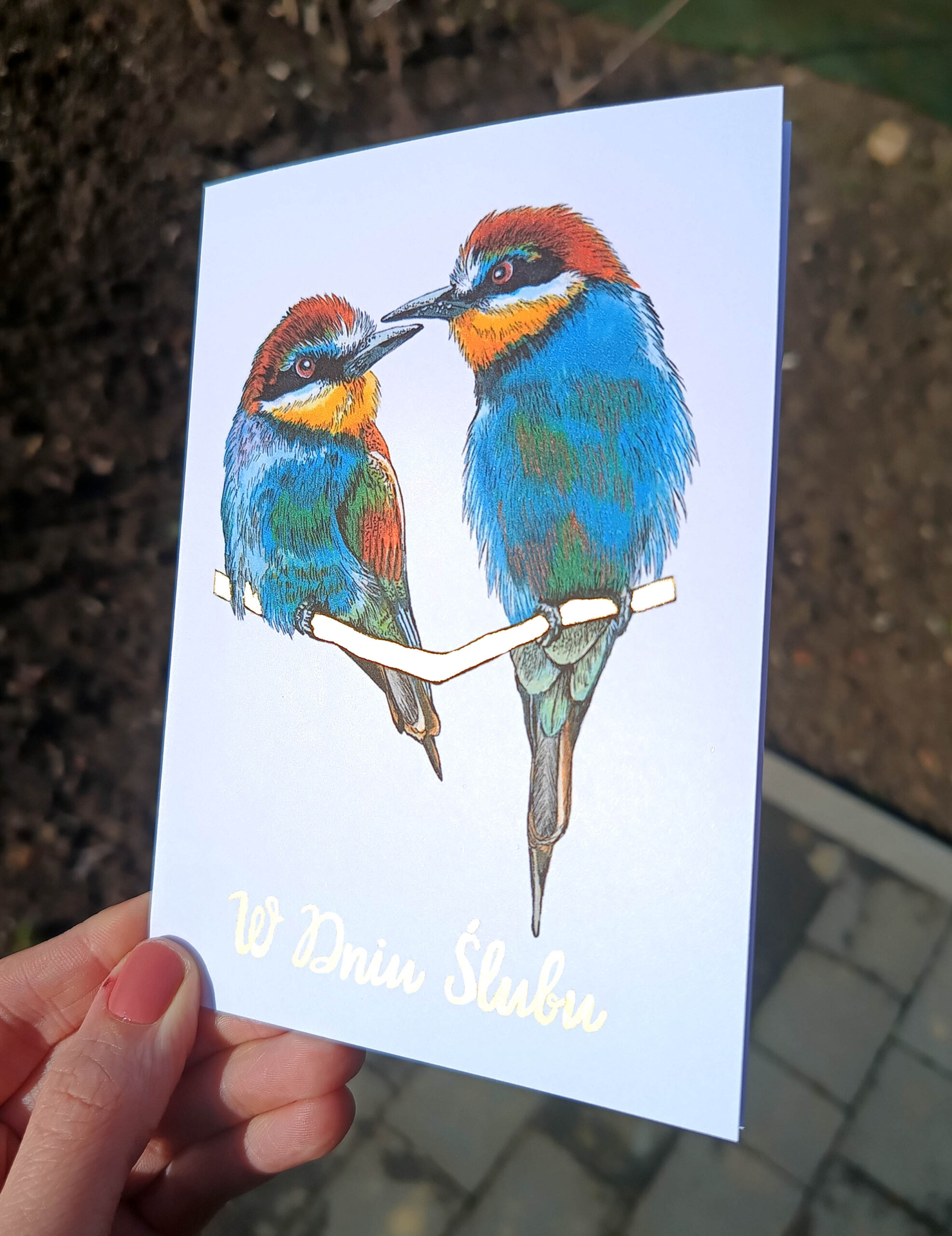 Ilustracja: Zakochana Para Żołn – motyw ptaków w kartce ślubnej