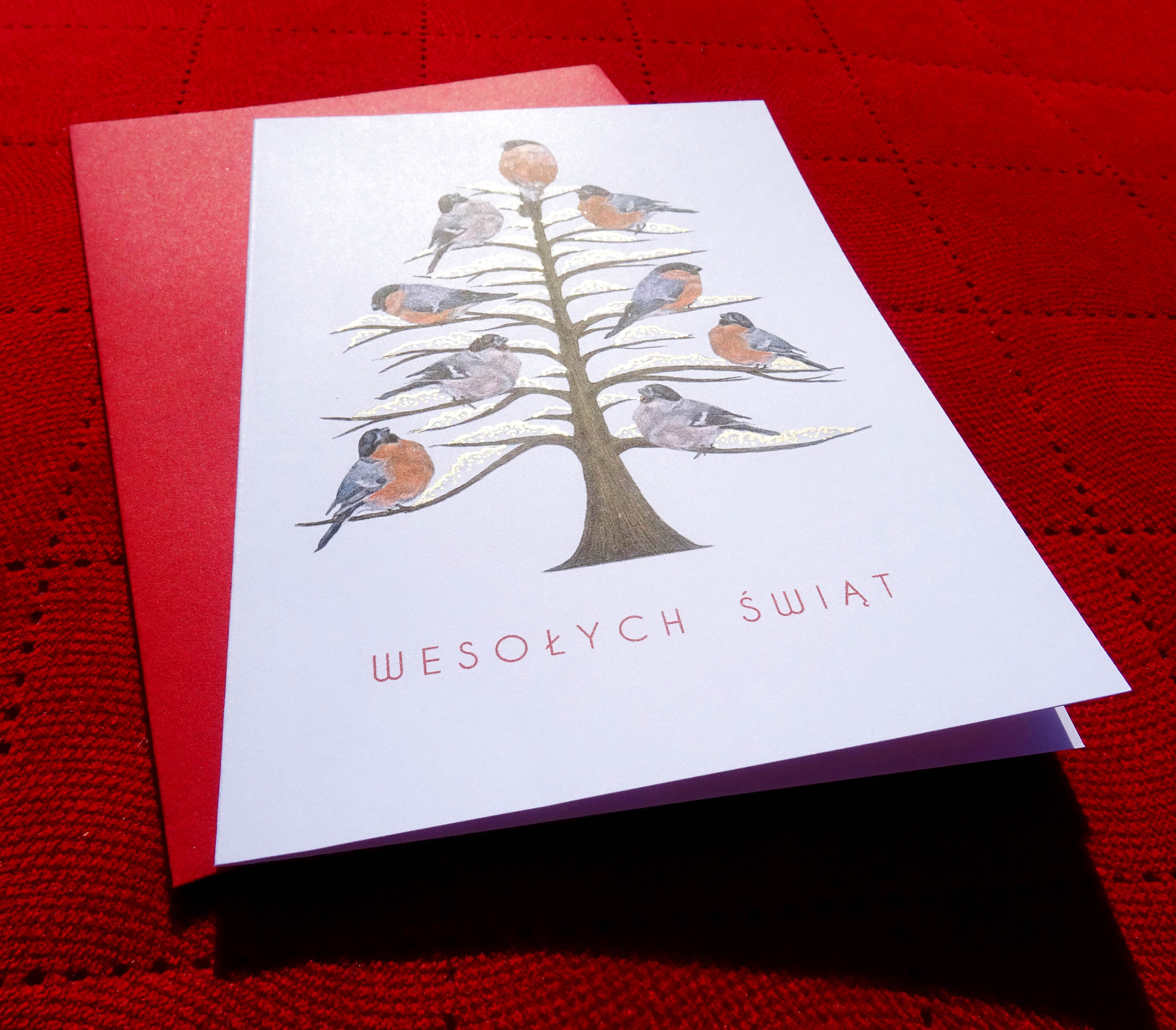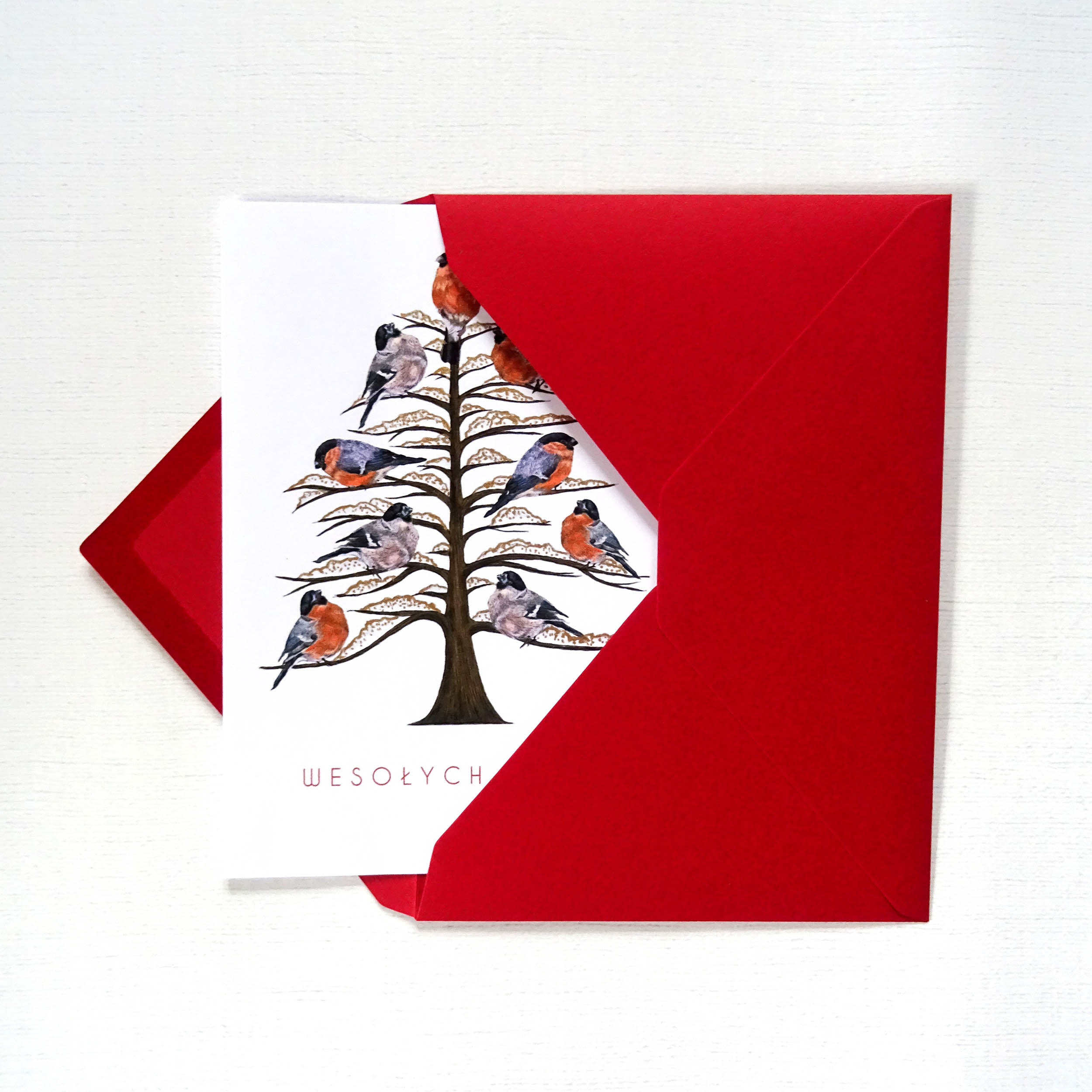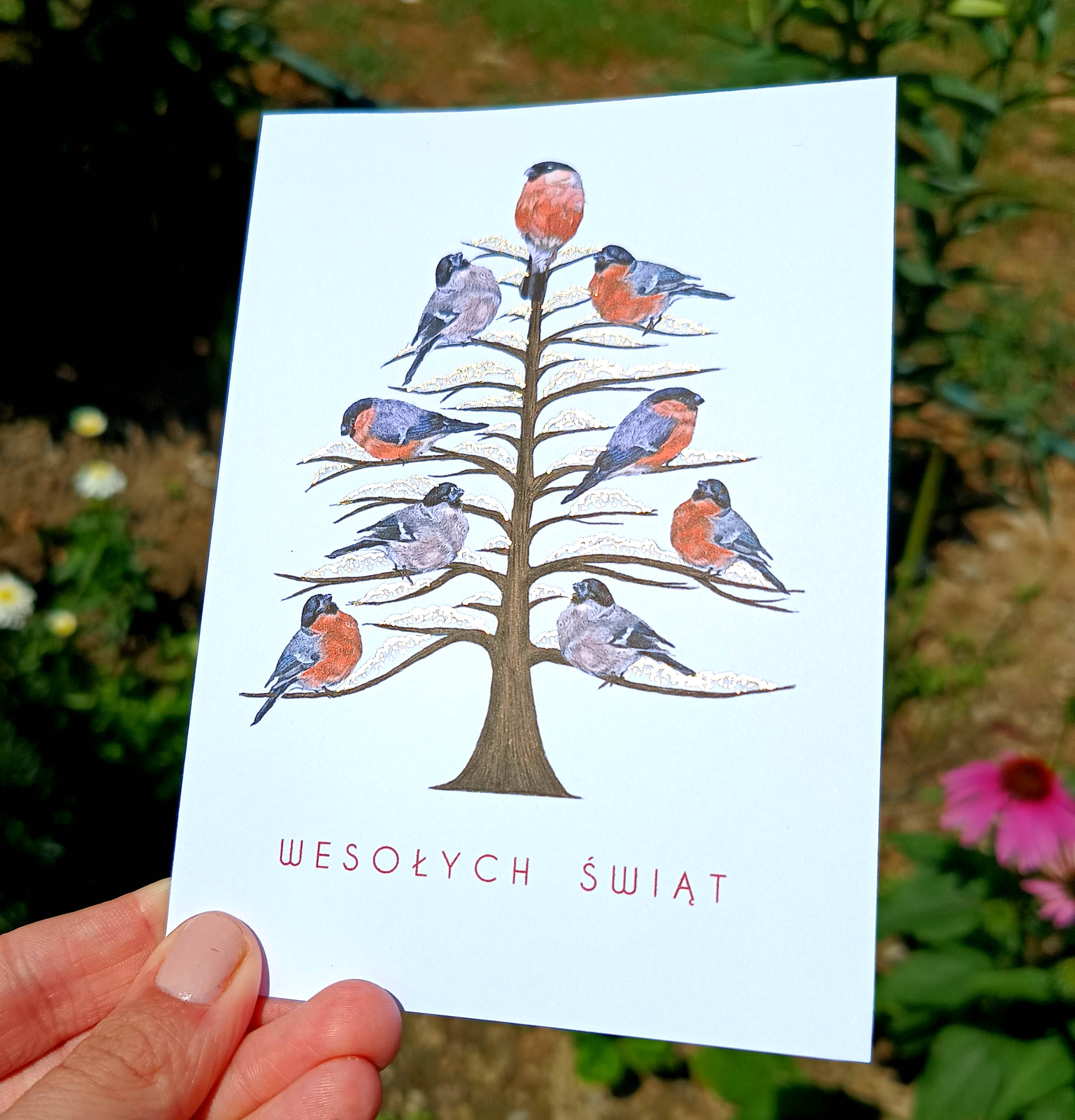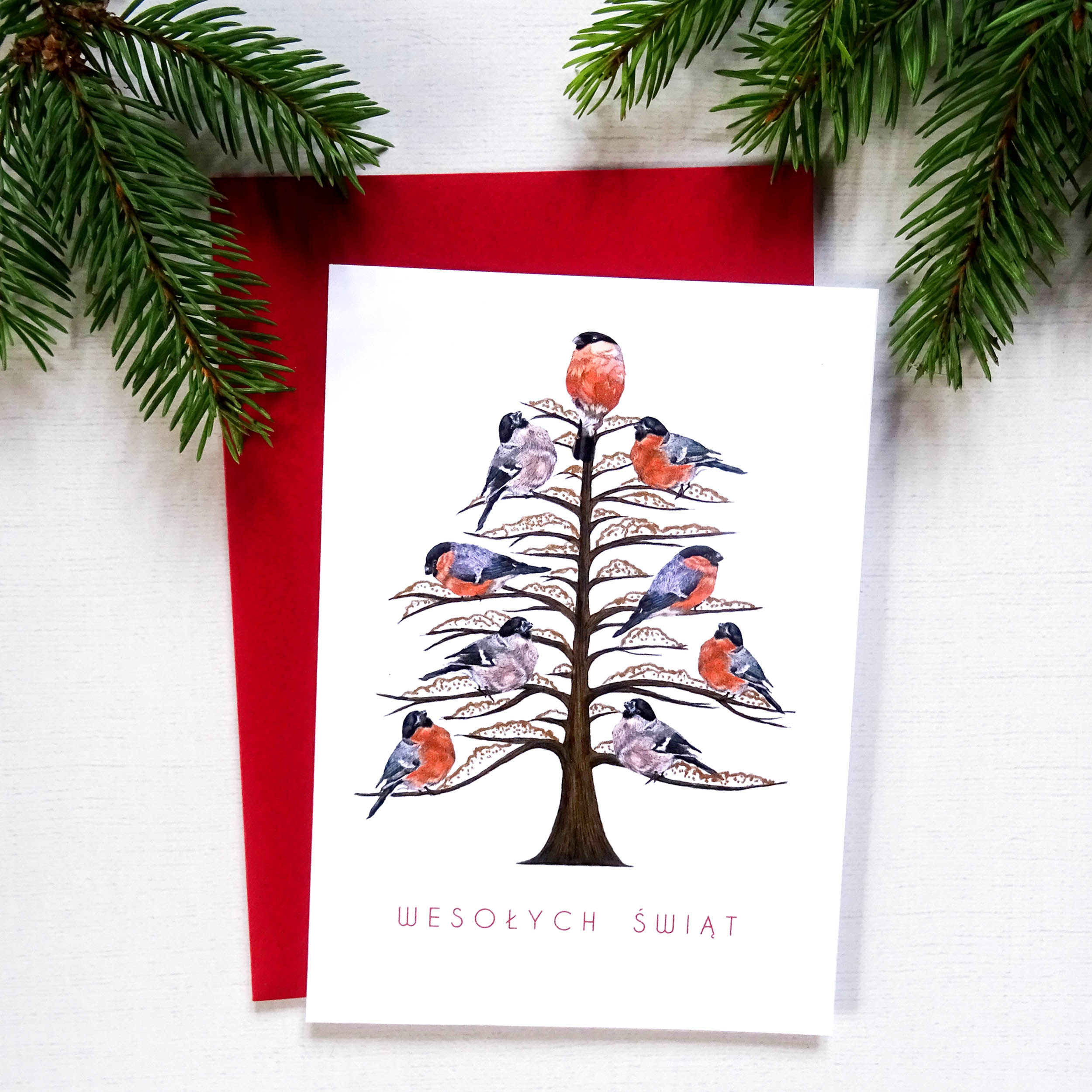 Ręcznie ilustrowana kartka świąteczna z Choinką i Gilami – Artystyczna kartka bożonarodzeniowa