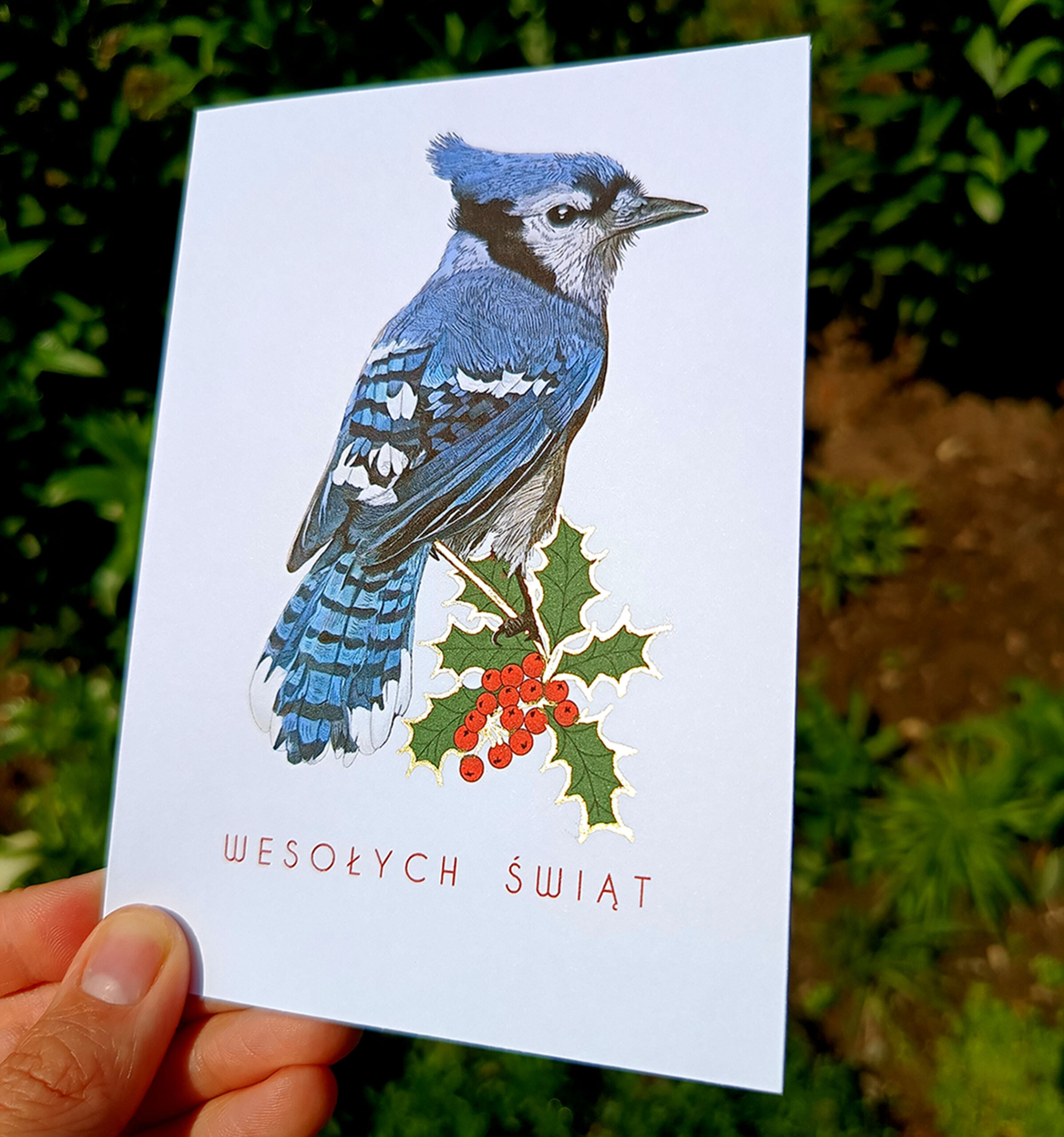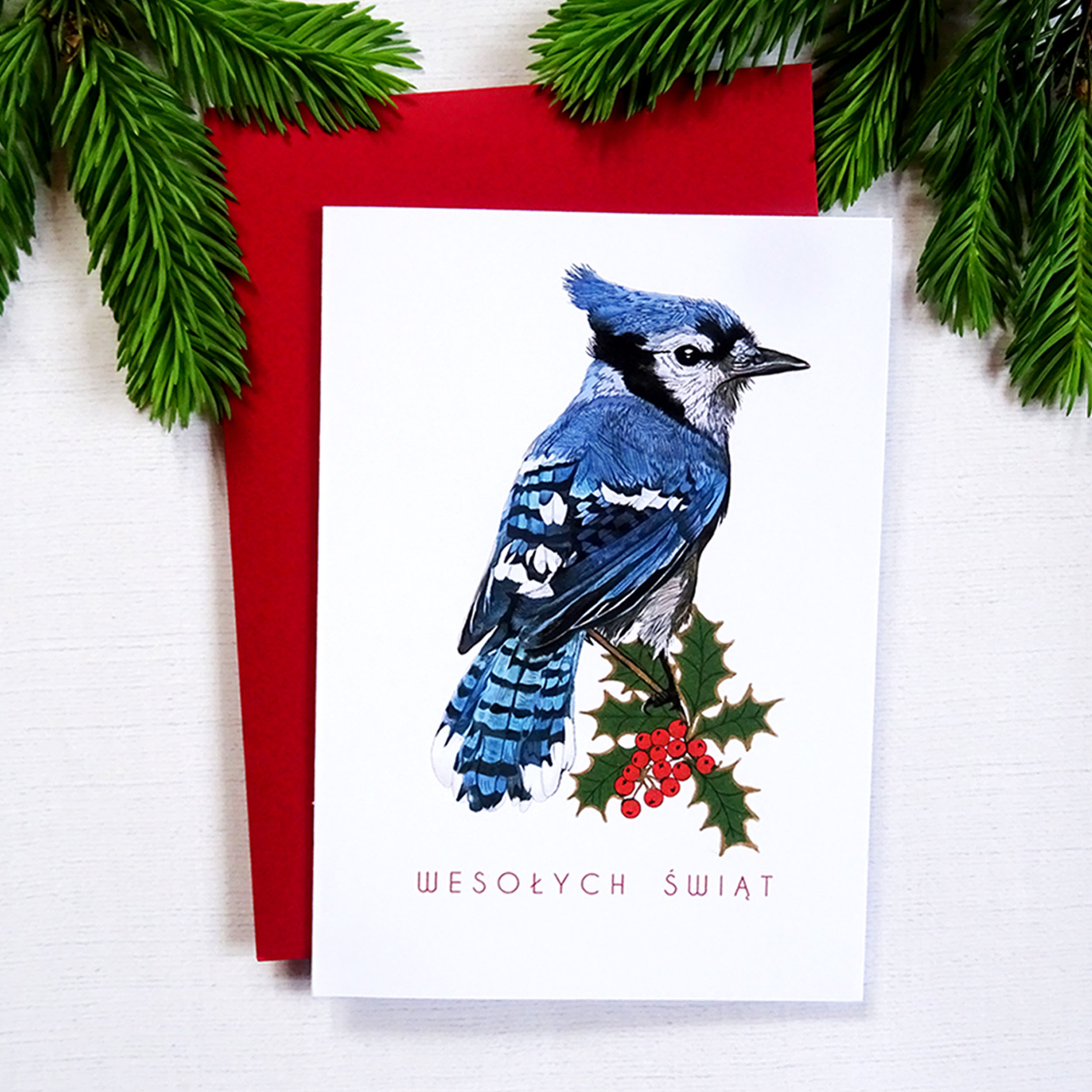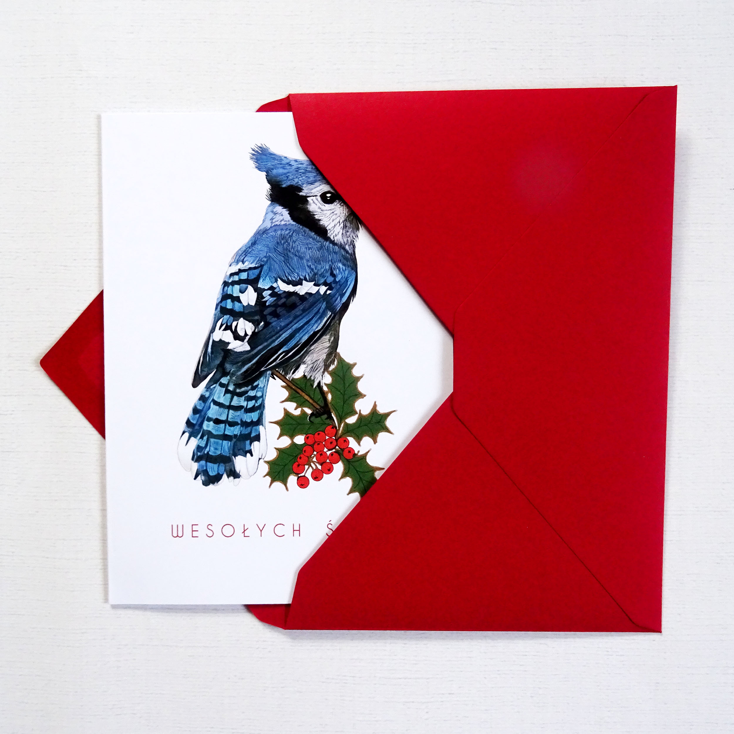 Elegancka kartka świąteczna z Modrosójką – idealna na prezent bożonarodzeniowy