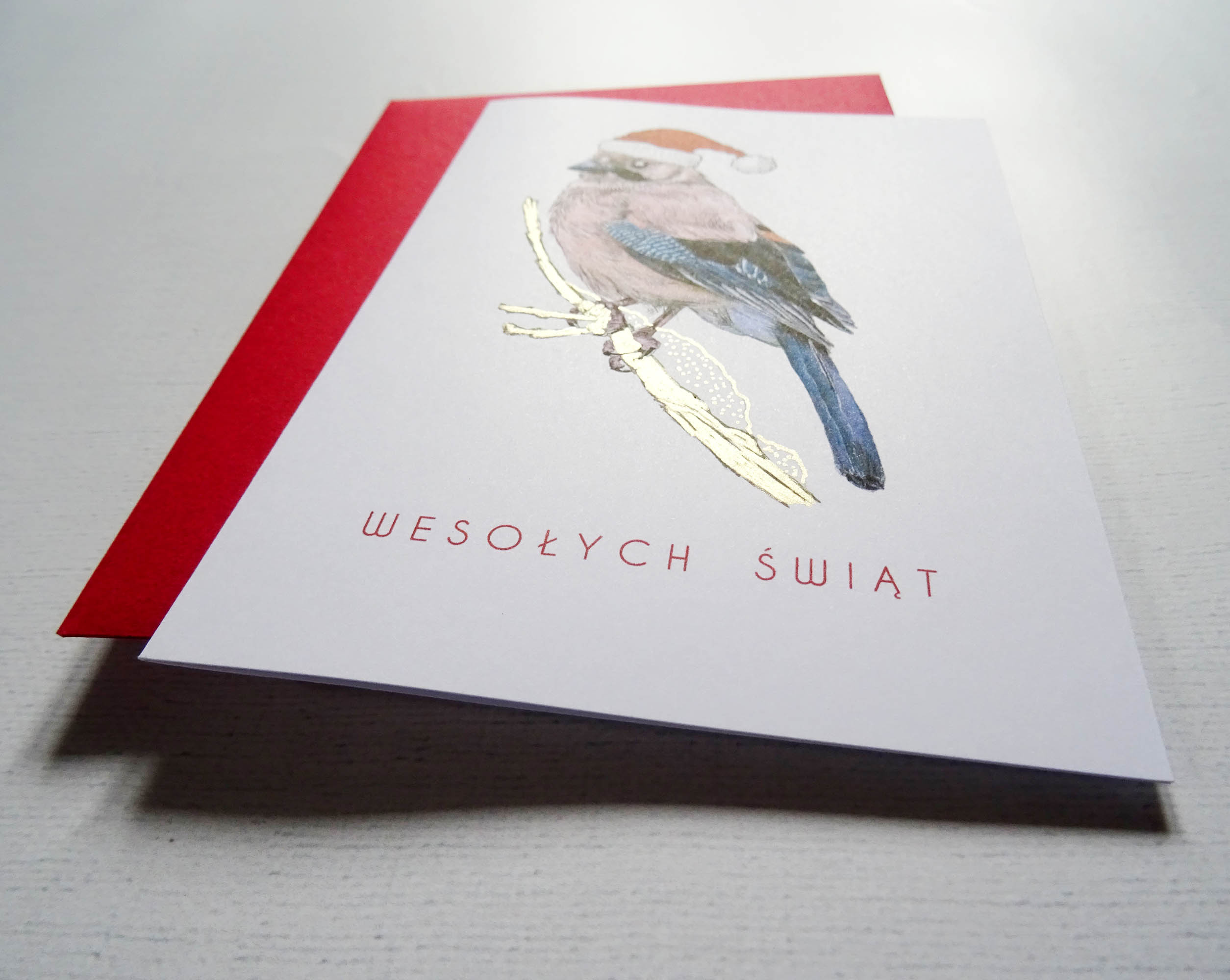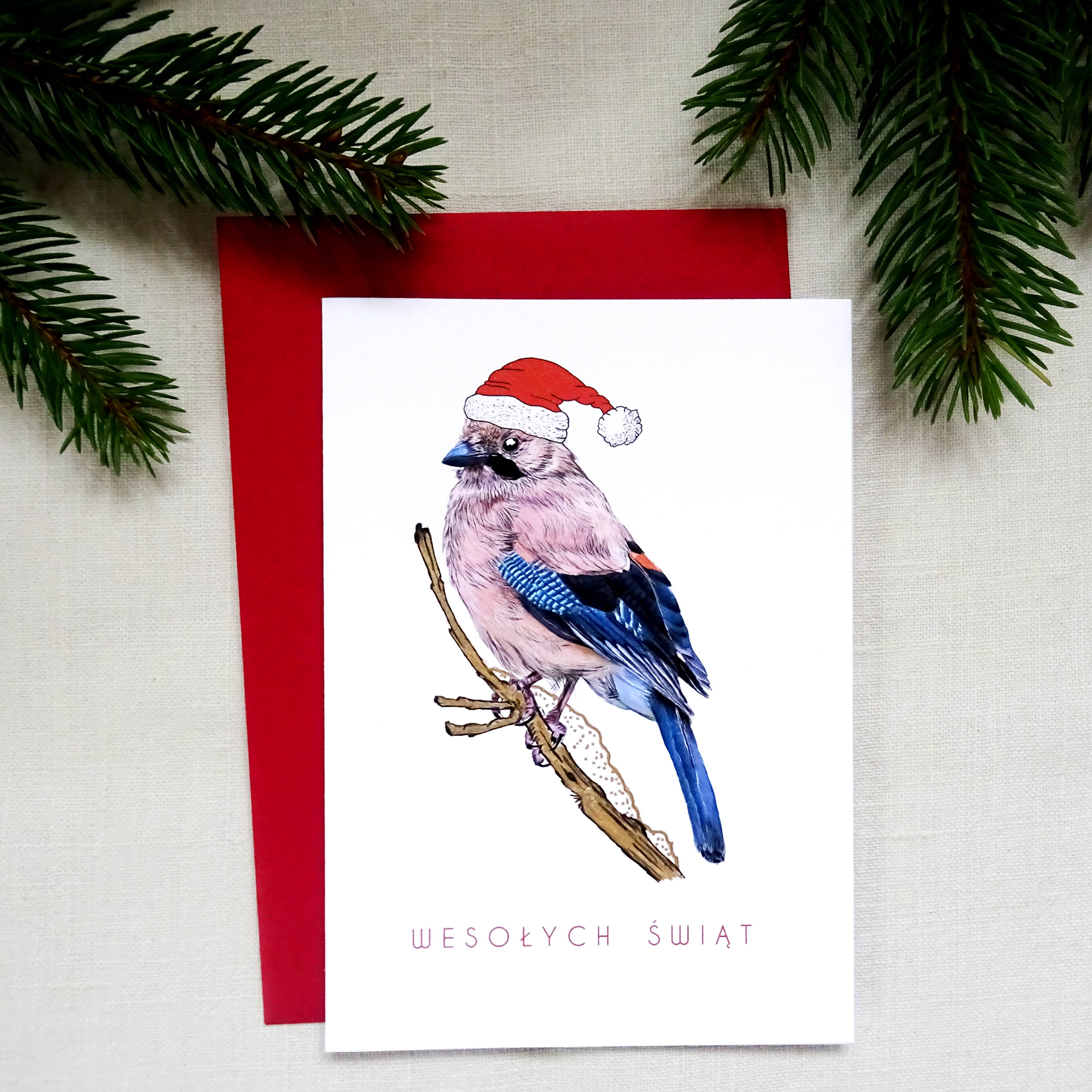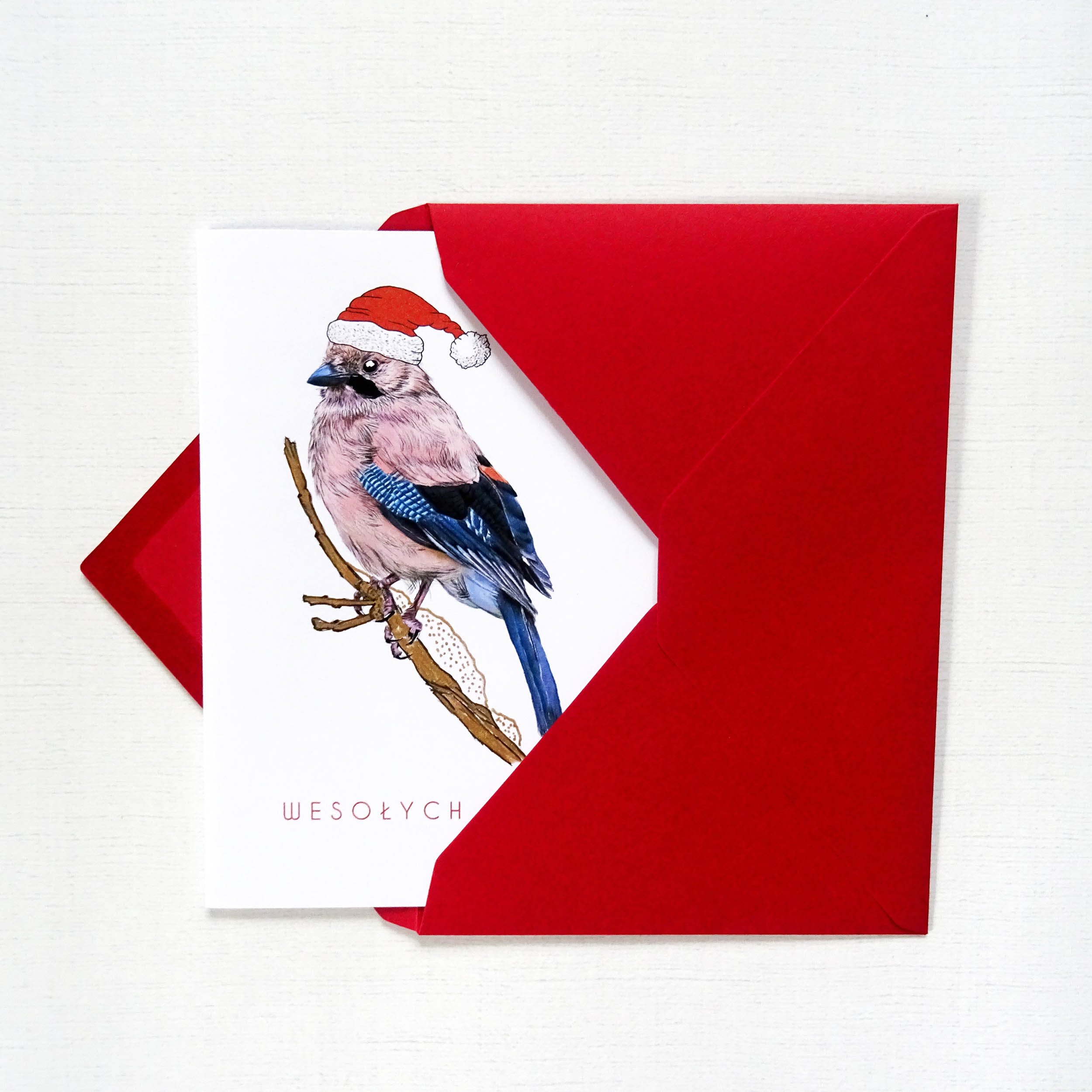 Kartka Świąteczna z Sójką – Ilustrowana Kartka Bożonarodzeniowa z Czerwoną Kopertą w Zestawie