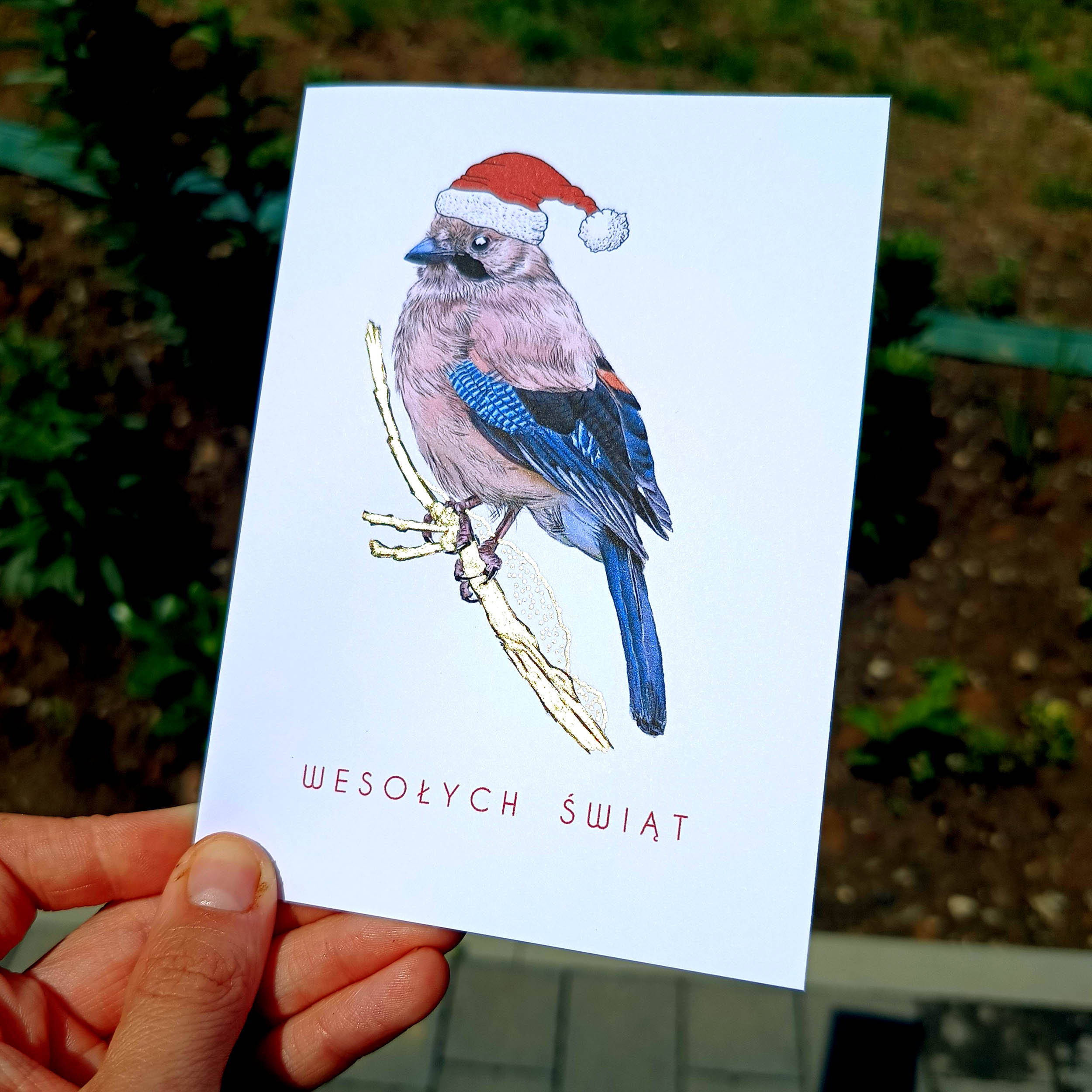Ilustracja została wykonana z pasją i przeniesiona na wysokiej jakości biały papier o gramaturze 250 gsm, dzięki czemu kartka jest trwała, elegancka i przyjemna w dotyku. Delikatne złote akcenty mienią się w świetle, dodając jej wyjątkowego charakteru i tworząc efekt ręcznego zdobienia. Każdy egzemplarz to małe dzieło sztuki, które wprowadza magię natury w świąteczny klimat.