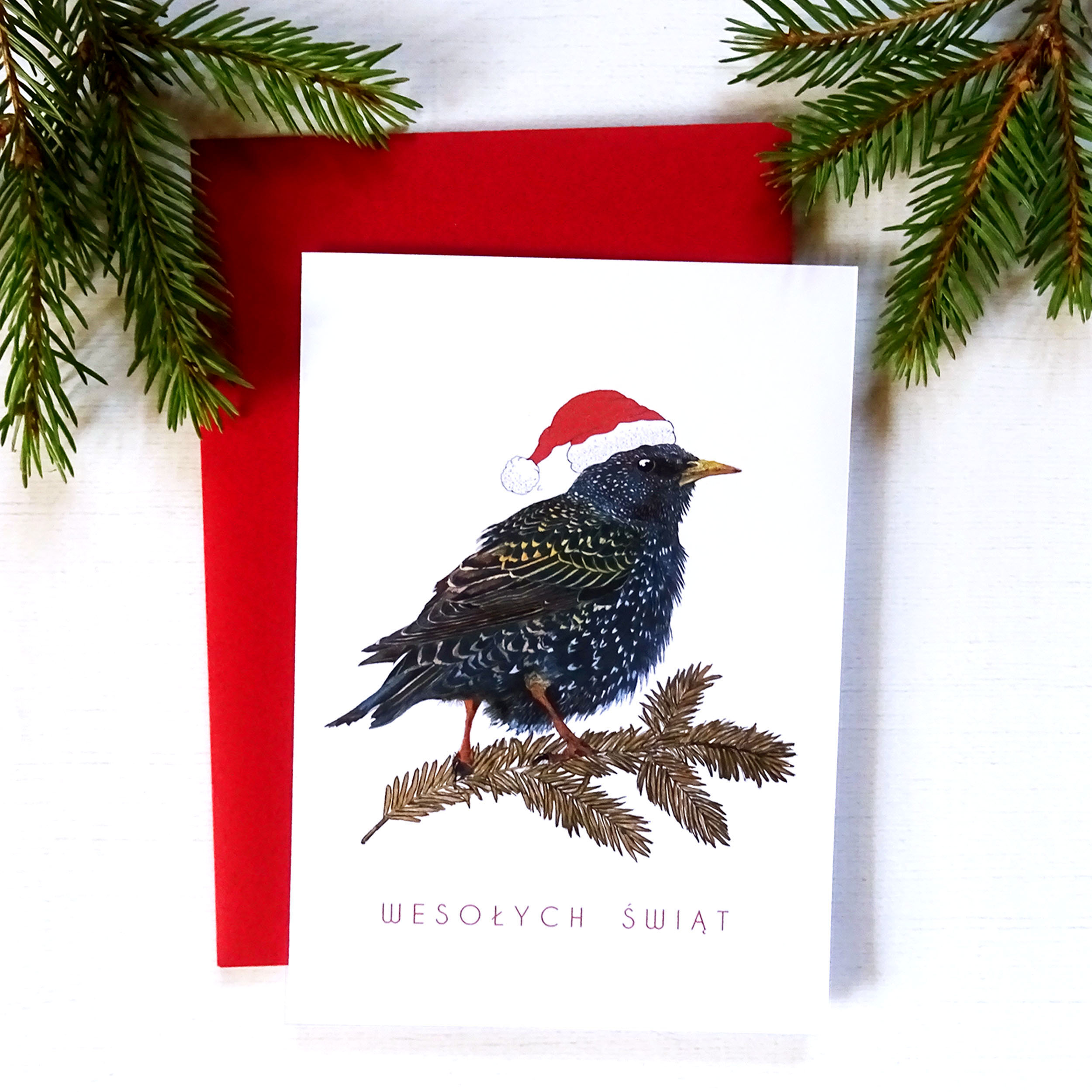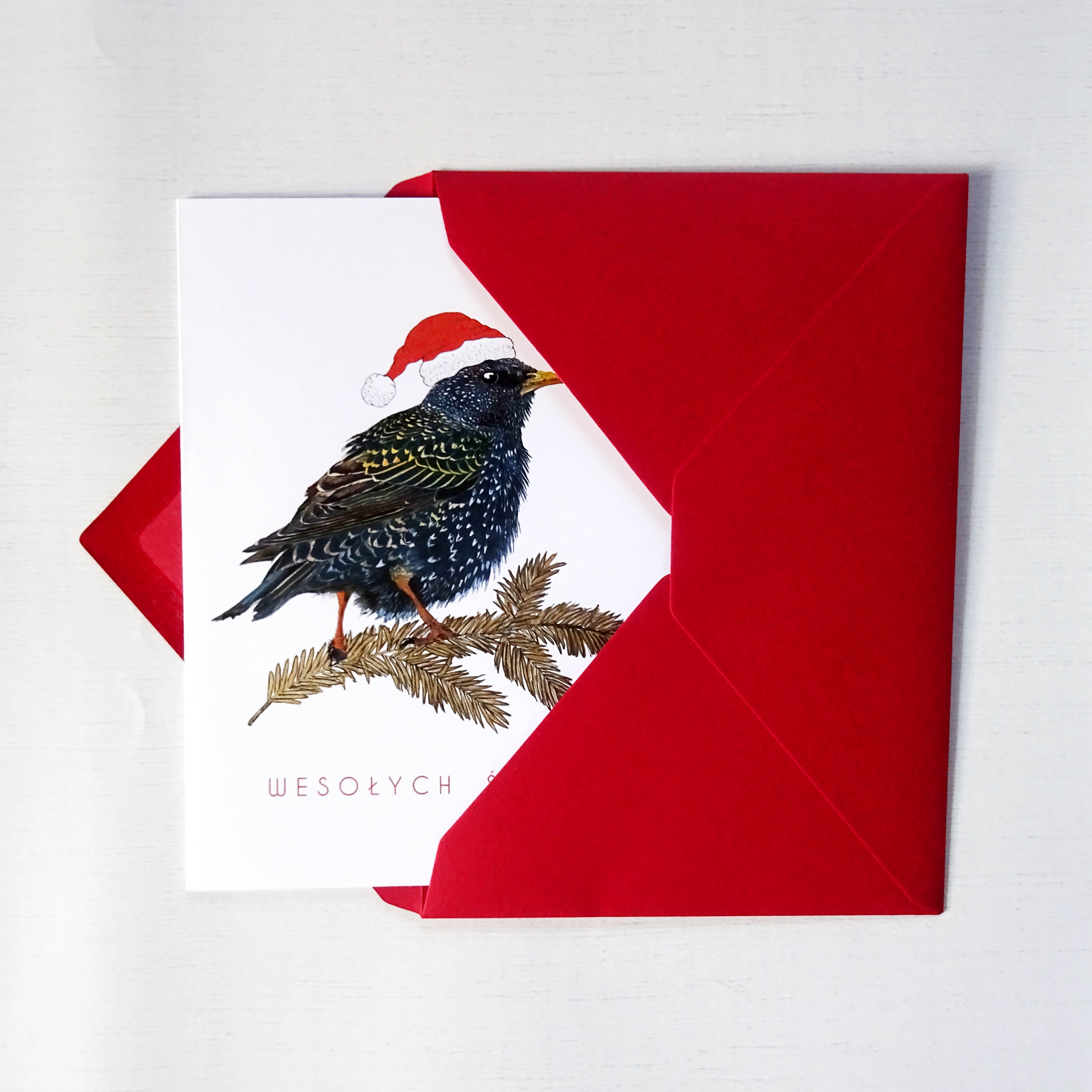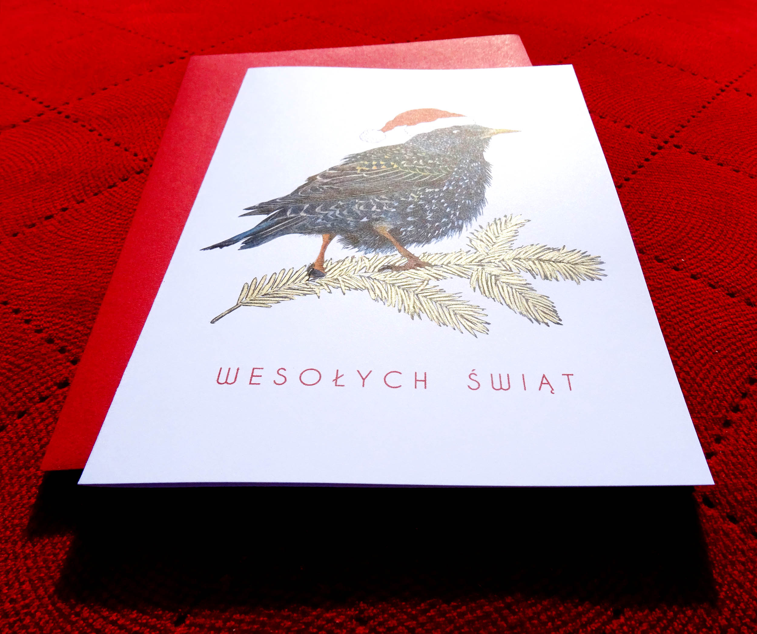 Kartka Świąteczna ze Szpakiem | Ilustrowana Kartka Bożonarodzeniowa | Złote Detale i Czerwona Koperta