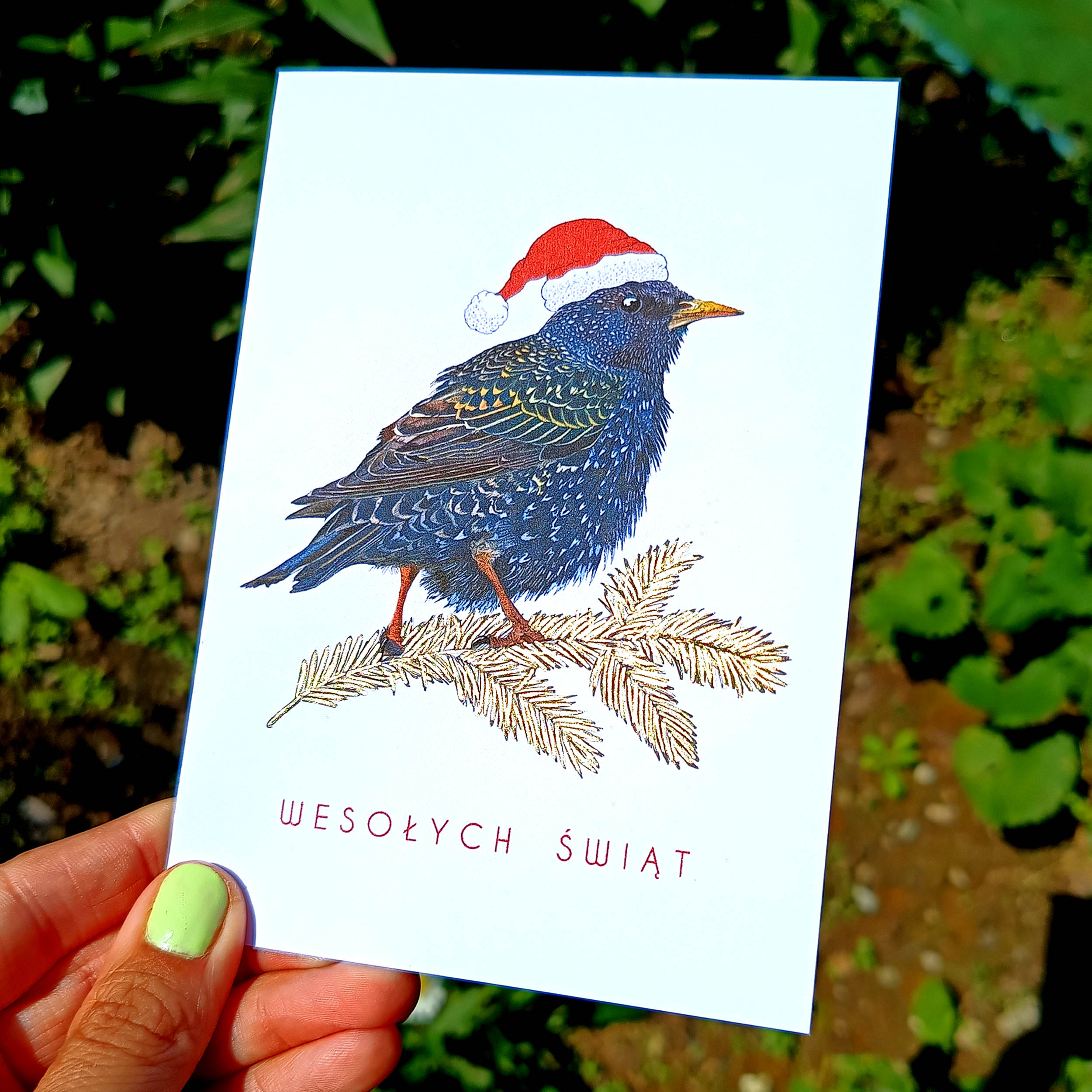 Ilustracja szpaka została wykonana z dbałością o każdy szczegół, by oddać jego piękne, mieniące się pióra. Kartka wydrukowana jest na wysokiej jakości, gładkim papierze o gramaturze 250 gsm, co zapewnia eleganckie wykończenie i trwałość. Idealna dla miłośników przyrody, ptaków i estetycznych kartek świątecznych.