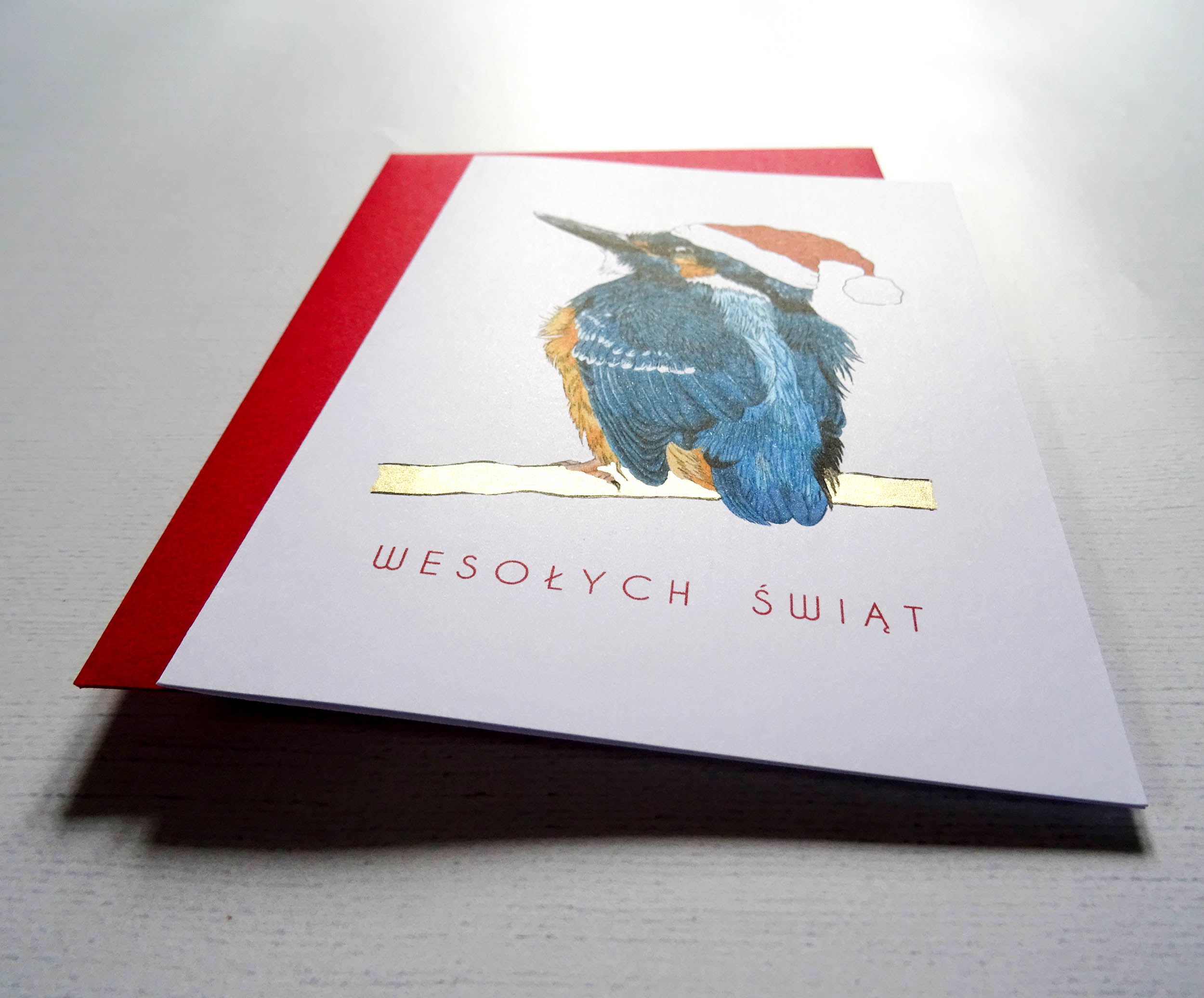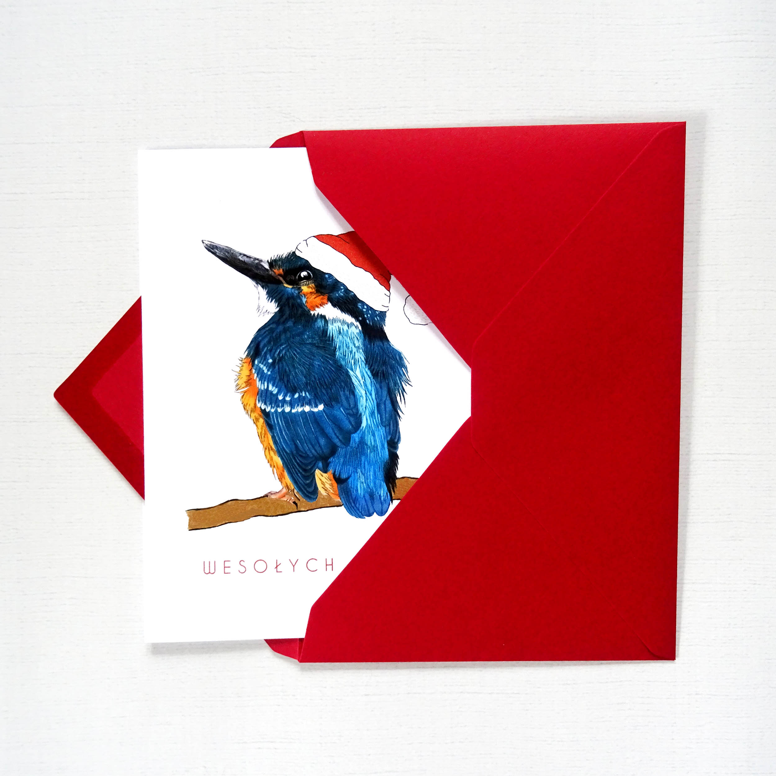 Kartka Świąteczna z Zimorodkiem – Złote Detale i Czerwona Koperta