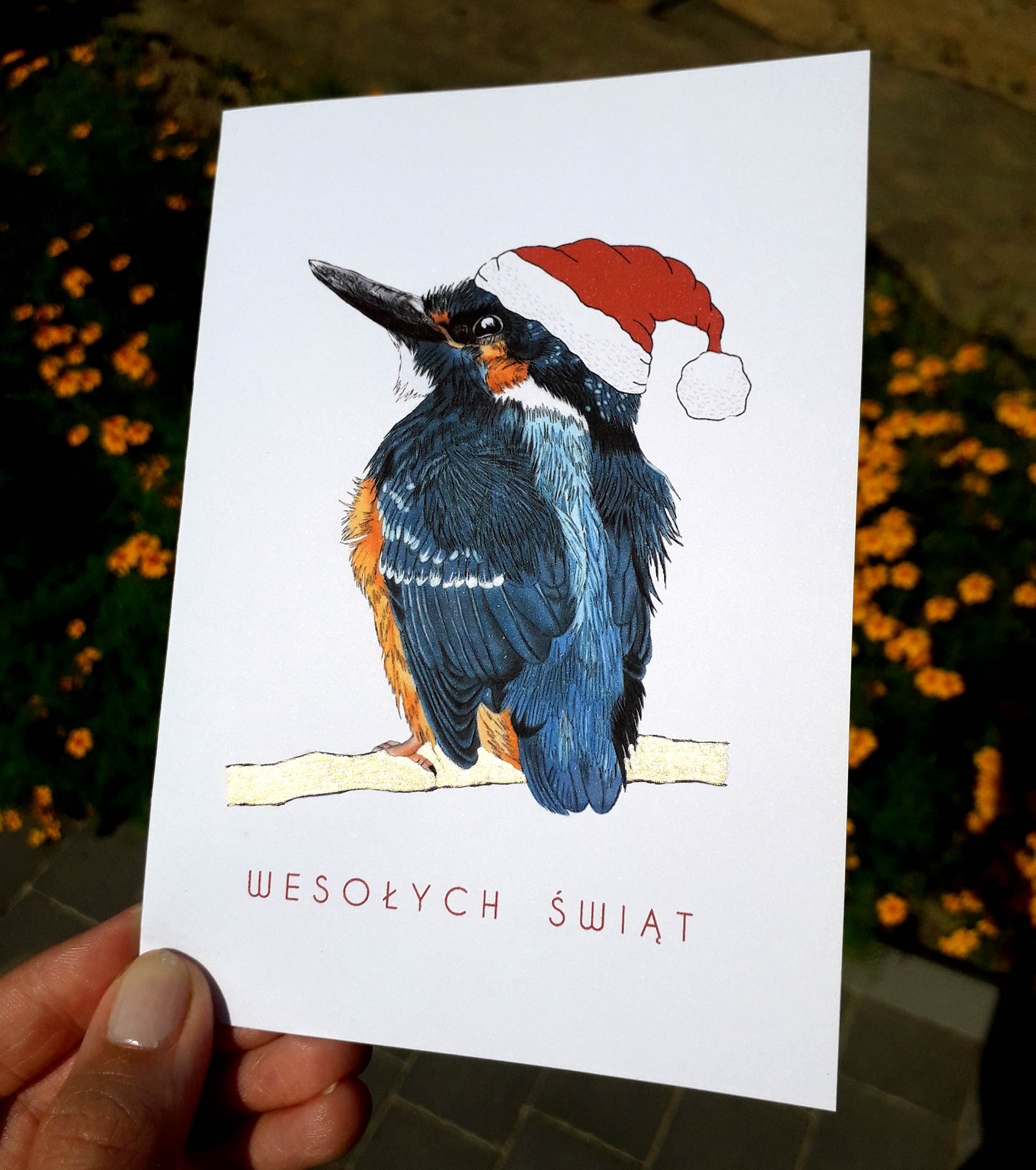 Zimorodek w mikołajkowej czapeczce, siedzący na gałązce, to motyw pełen ciepła, radości i uroku. Kartka została zaprojektowana z myślą o miłośnikach przyrody i ręcznie tworzonych ilustracji. Każdy egzemplarz jest wyjątkowy — złote akcenty nanoszone są ręcznie, dzięki czemu kartka staje się małym, niepowtarzalnym dziełem sztuki.