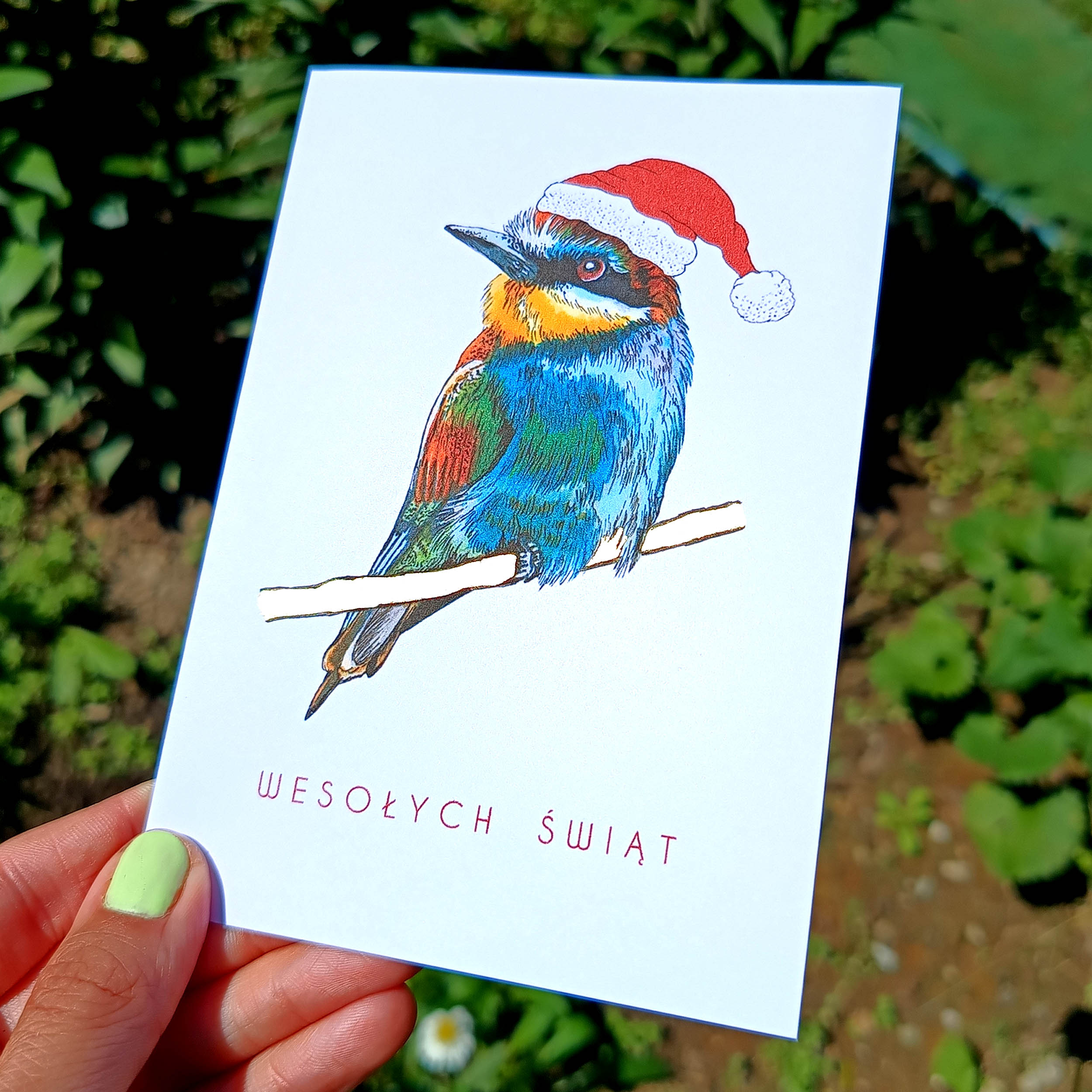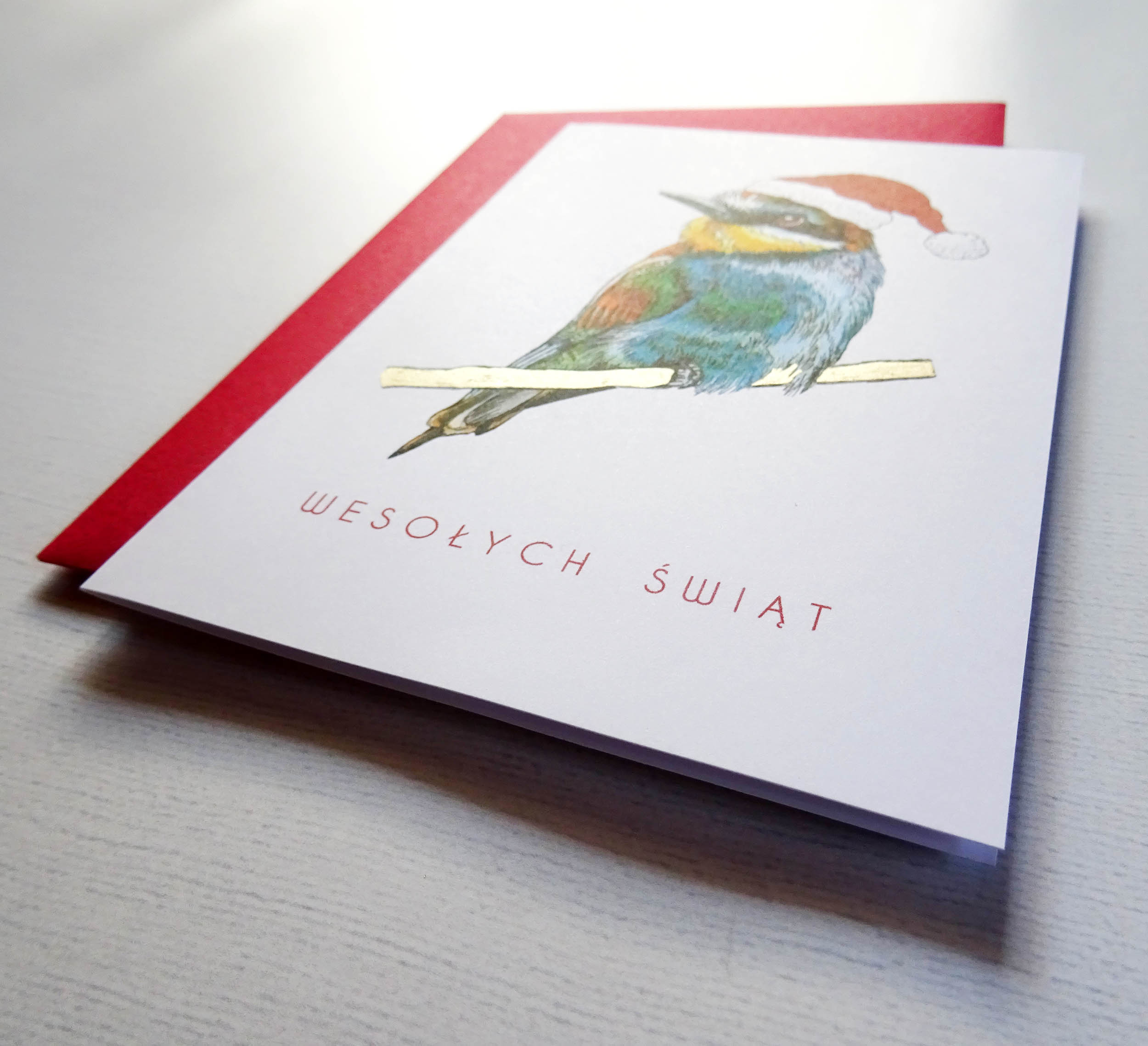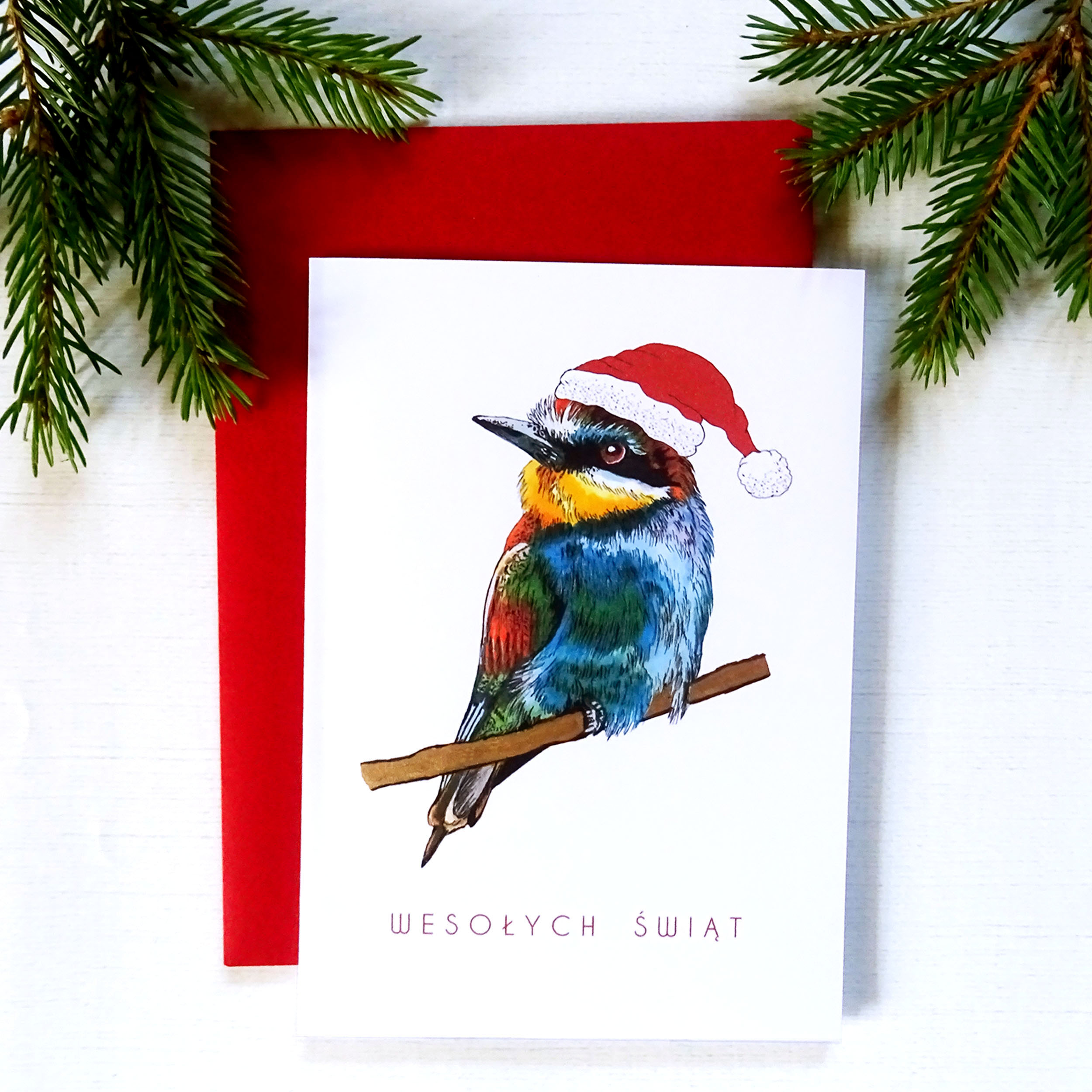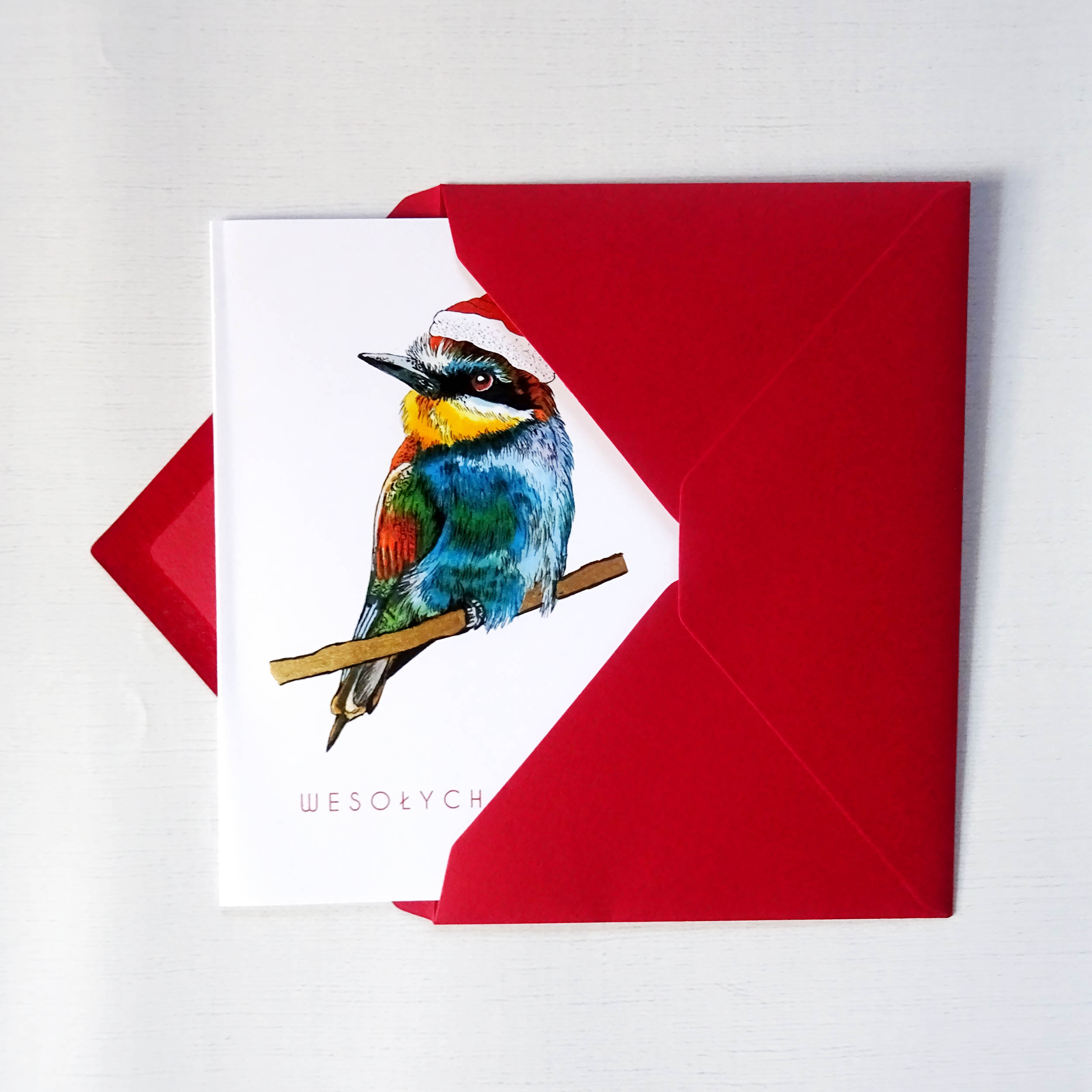 Kartka Świąteczna z Kolorową Żołną – Złote Detale i Czerwona Koperta