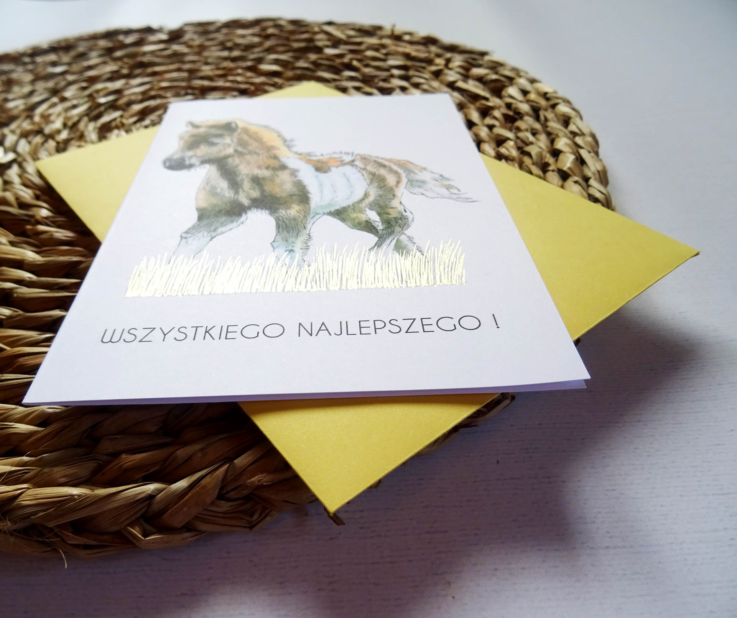 Kartka została wydrukowana na gładkim, białym papierze o gramaturze 250 gsm, co sprawia, że jest solidna i przyjemna w dotyku. Każdy egzemplarz zawiera ręcznie zdobione złote detale, które pięknie mienią się w świetle dziennym, dodając kartce wyjątkowego charakteru.