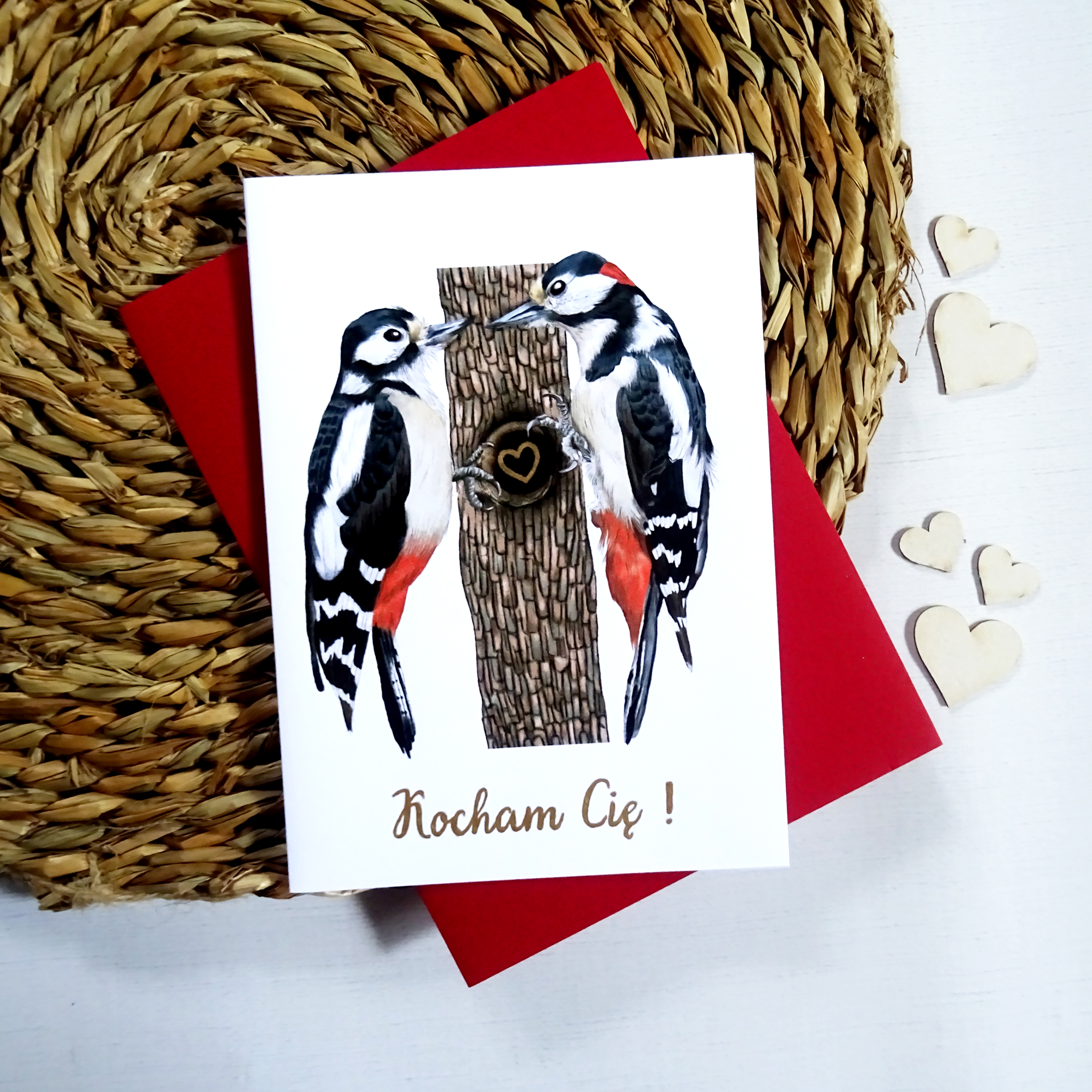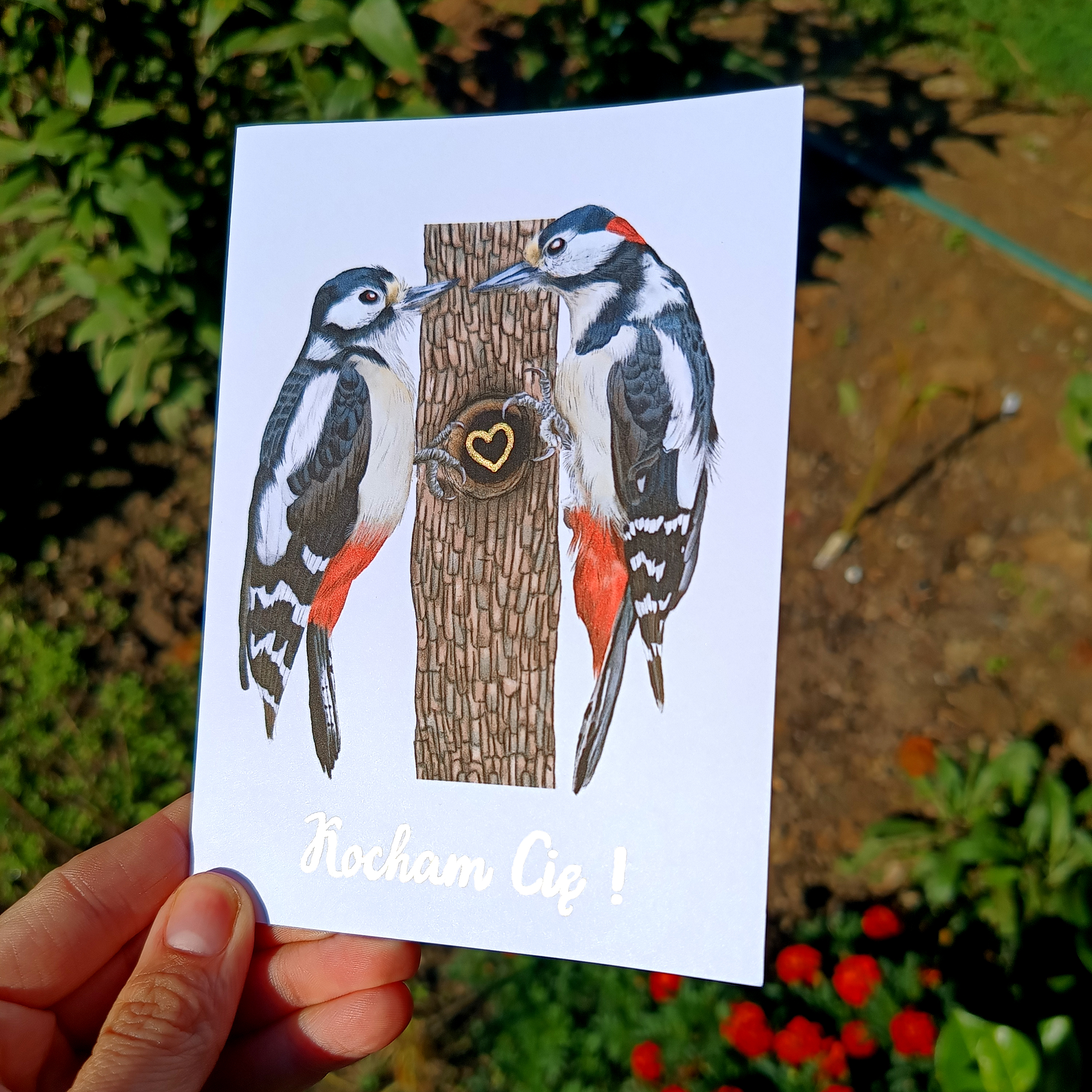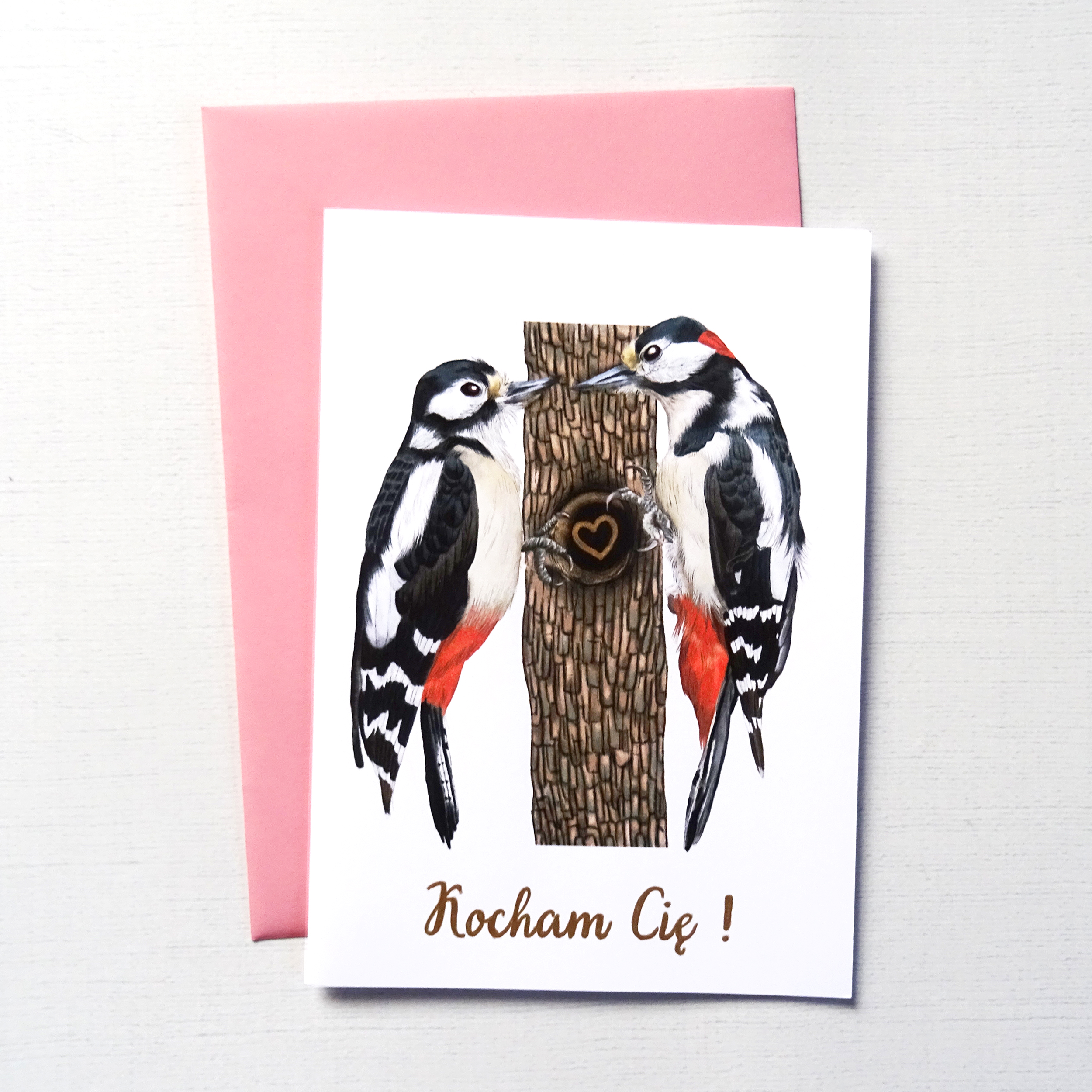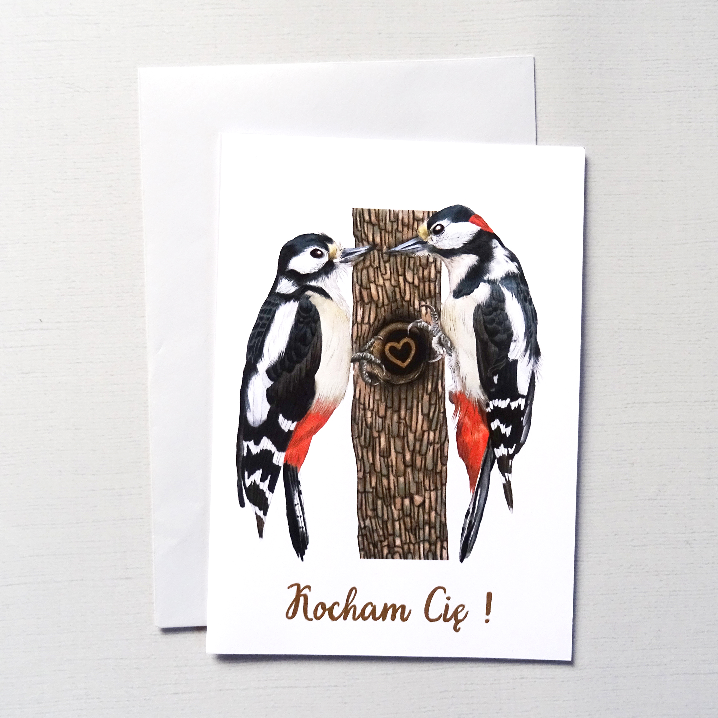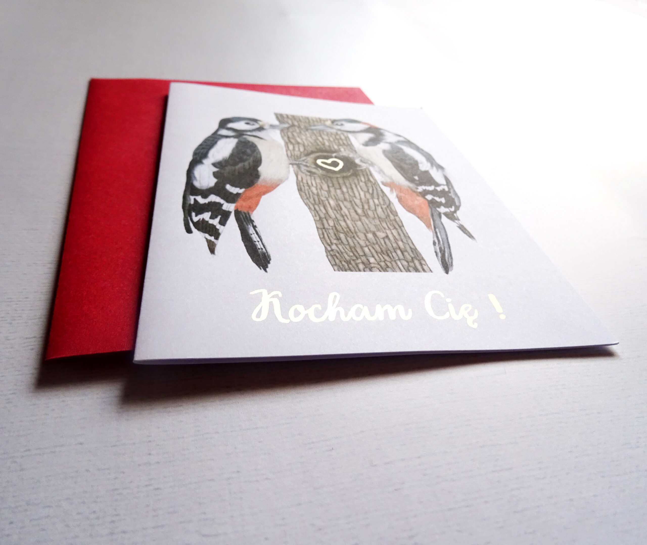 Kartka Walentynkowa z Dzięciołami i złotym sercem – wyjątkowa kartka miłosna, idealny prezent dla ukochanej