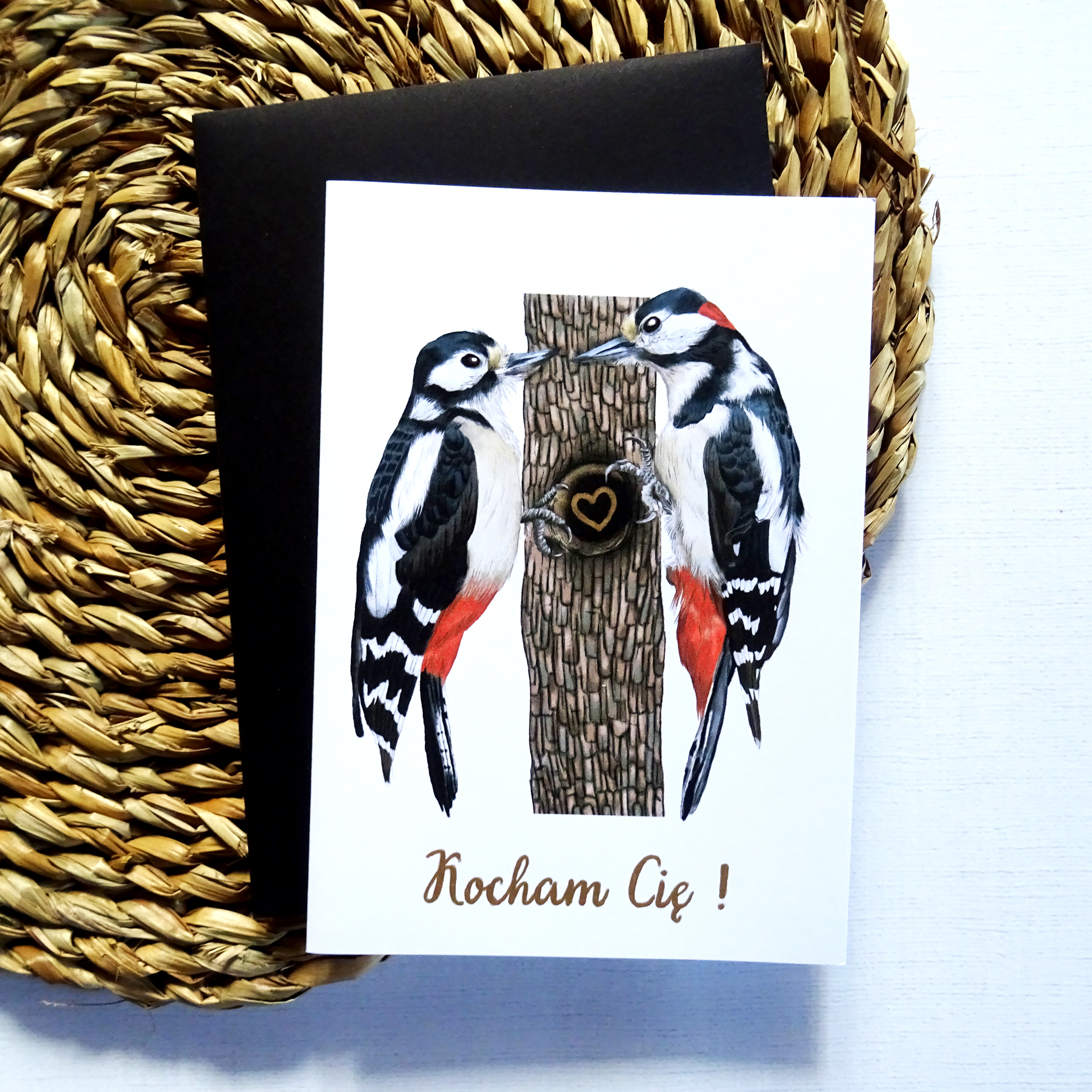 Na okładce znajdują się dwa dzięcioły ustawione naprzeciw siebie, co tworzy subtelny, pełen czułości klimat. Ilustracja przyciąga uwagę detalami i naturalnością, dzięki czemu kartka prezentuje się niezwykle elegancko.