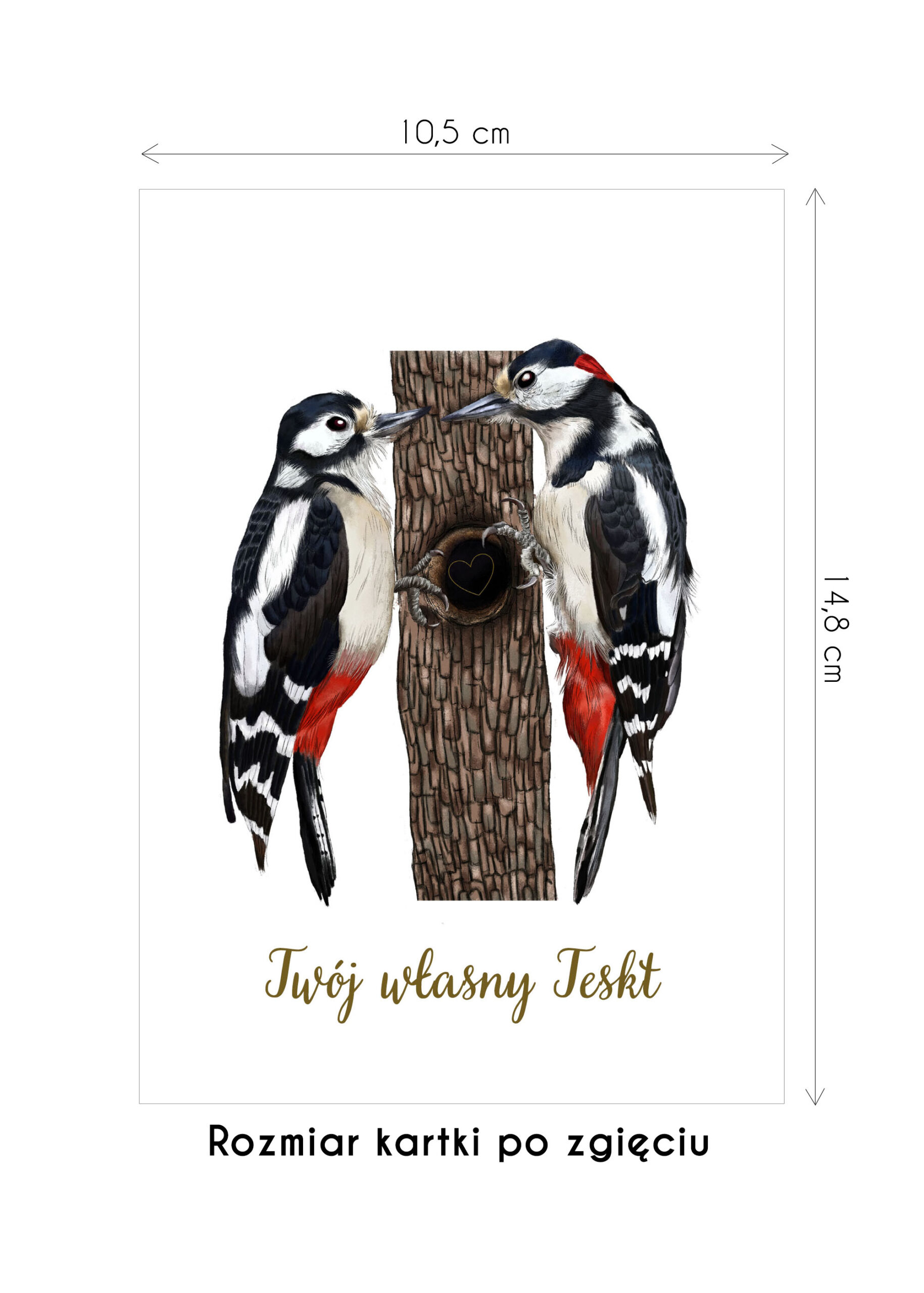 Kartka przedstawia ręcznie ilustrowaną parę Dzięciołów – samca i samicy, która drukowana jest na białym, gładkim papierze (250 gsm). Po złożeniu kartka ma wymiary 10,5 x 14,8 cm – idealny rozmiar na prezent.