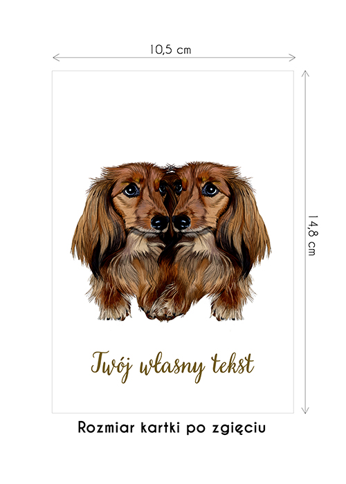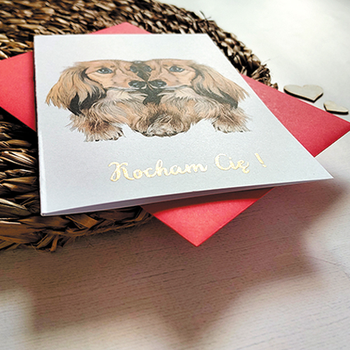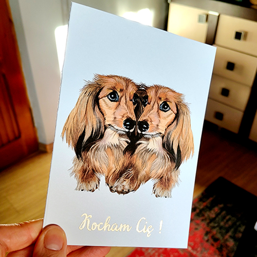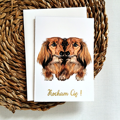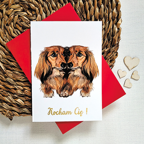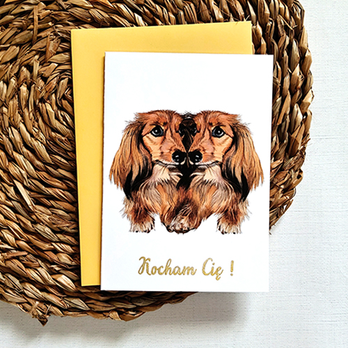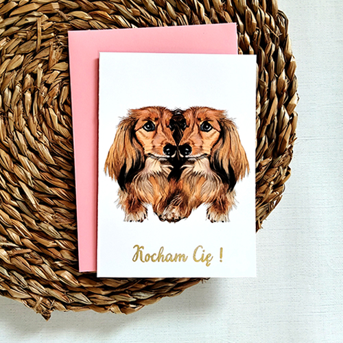 Kartka walentynkowa z Jamnikami, personalizowana kartka na Walentynki z zakochaną parą piesków wraz z ręcznie zdobionym złotym napisem “Kocham Cię”, który możesz spersonalizować i dodać swój własny. Idealna na prezent pełen emocji i ciepła.