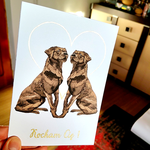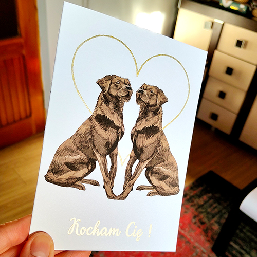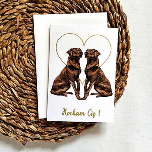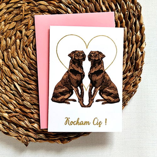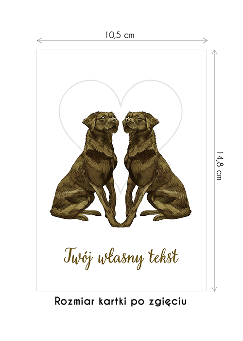 Na froncie kartki znajduje się wzruszająca ilustracja zakochanej pary brązowych labradorów. Psy siedzą naprzeciw siebie, tworząc spokojny, pełen bliskości kadr, który doskonale oddaje prawdziwe uczucie, zaufanie i oddanie.