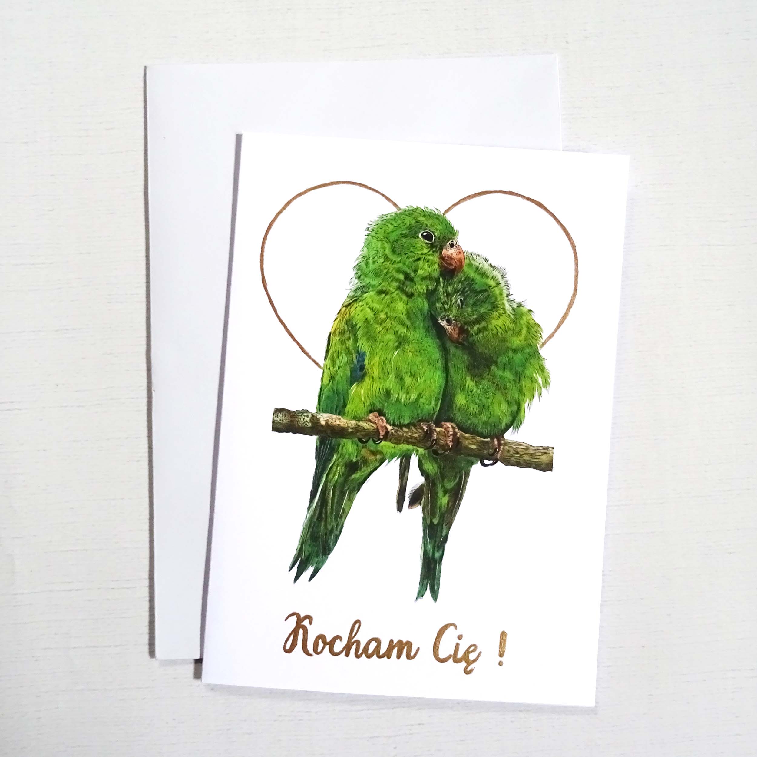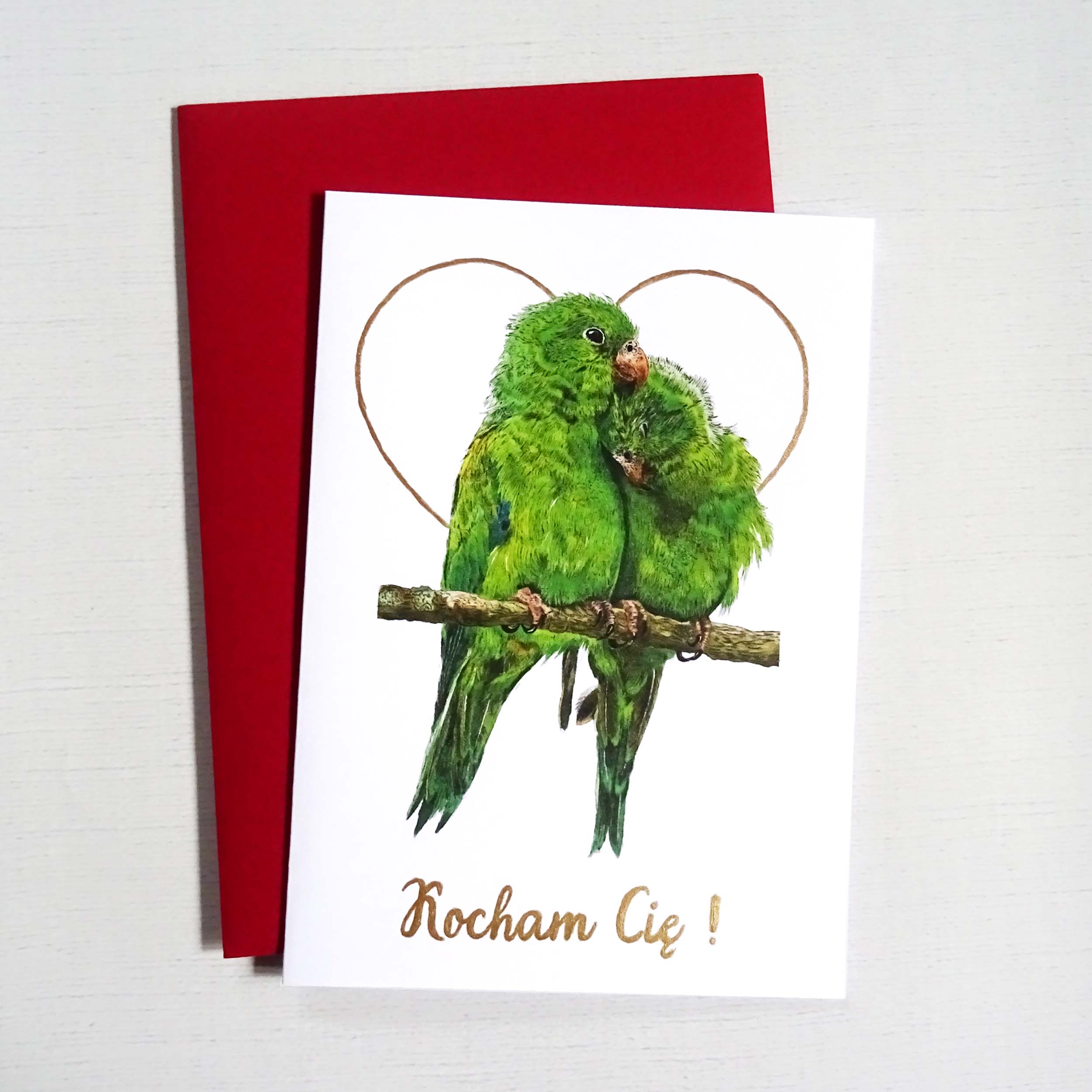 Na okładce znajdują się dwie przytulone papużki, tworzące subtelny obraz bliskości i oddania. Złote, błyszczące serce podkreśla romantyczny charakter kartki, dodając jej elegancji i wyjątkowości.