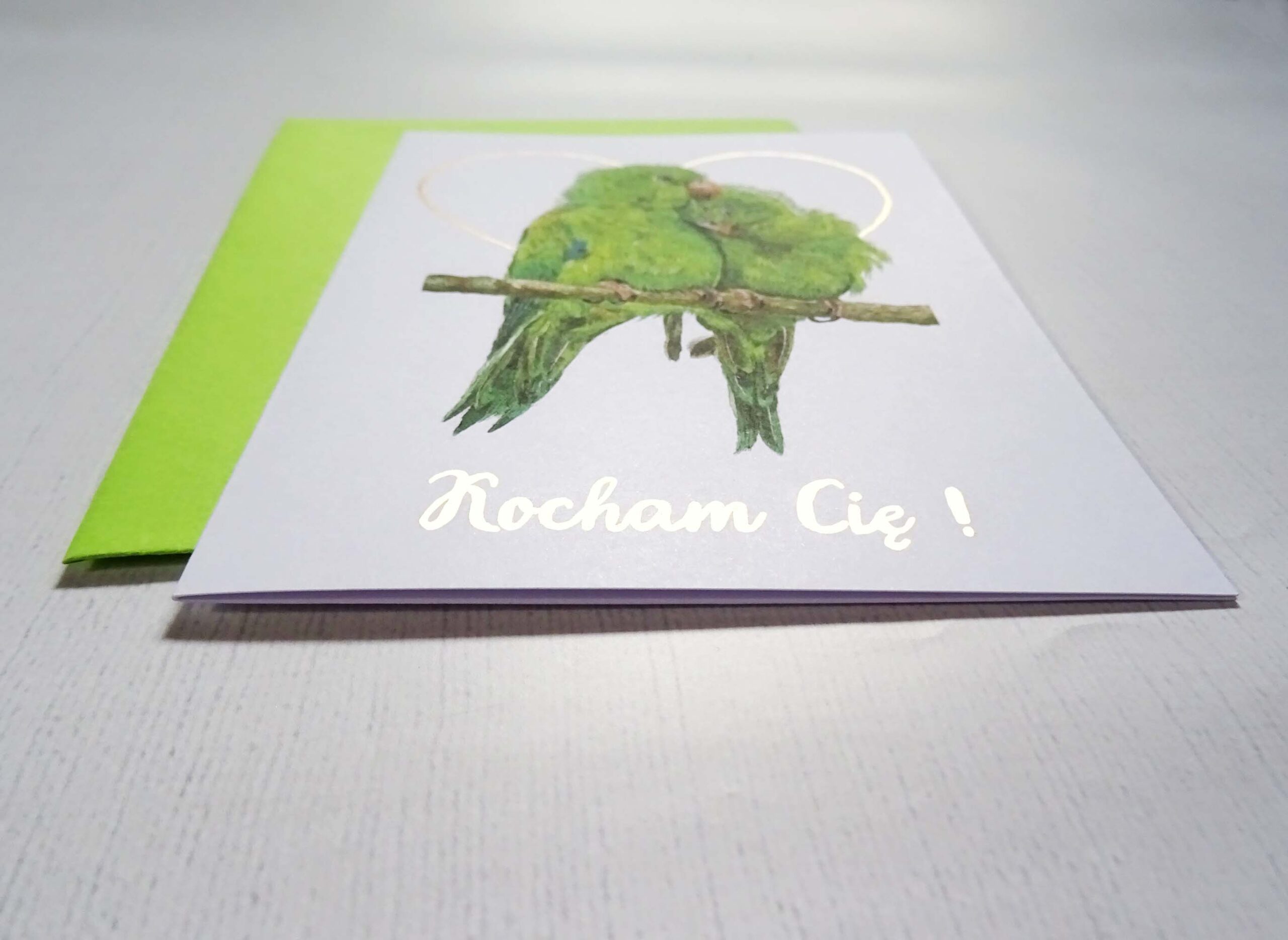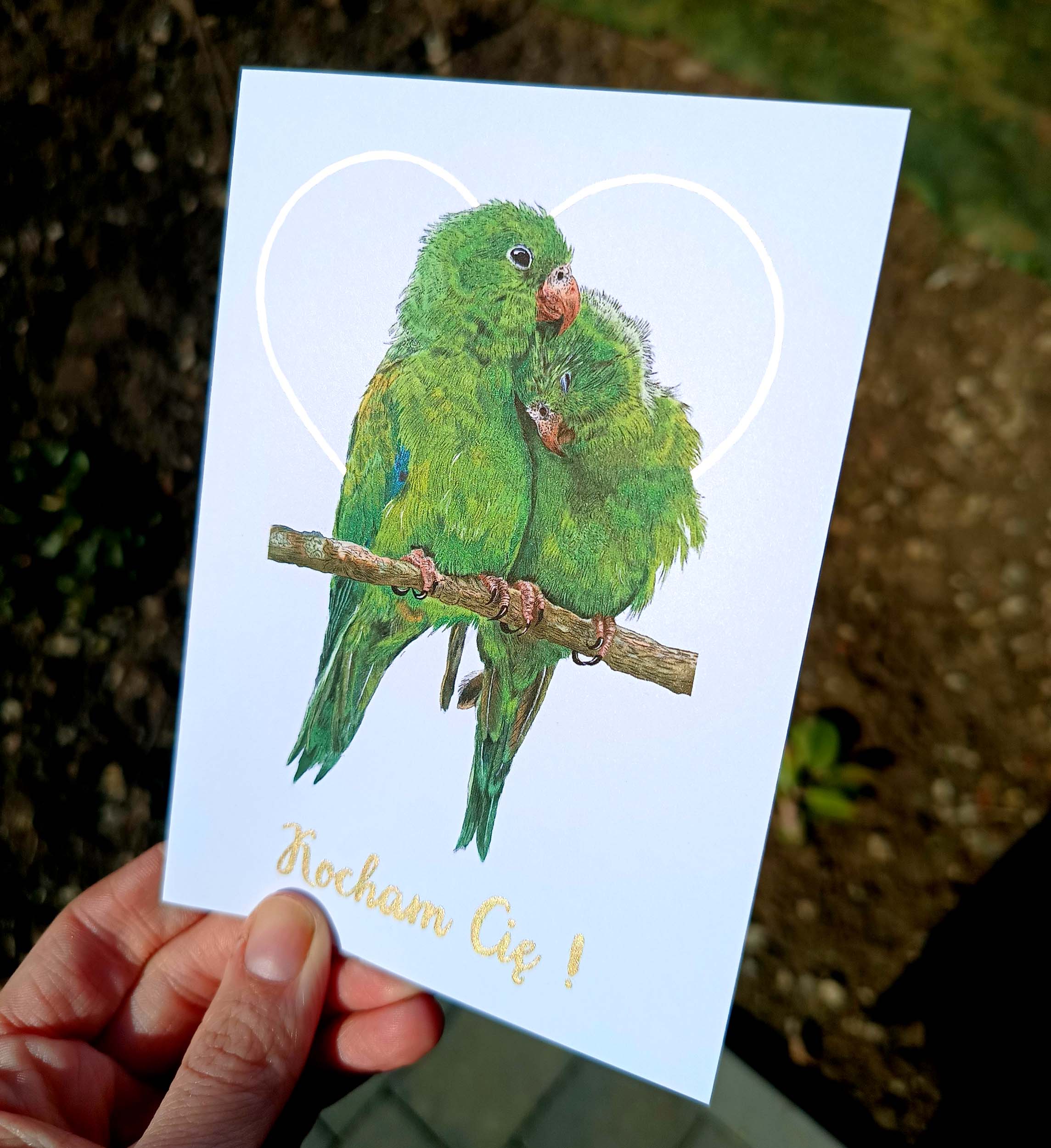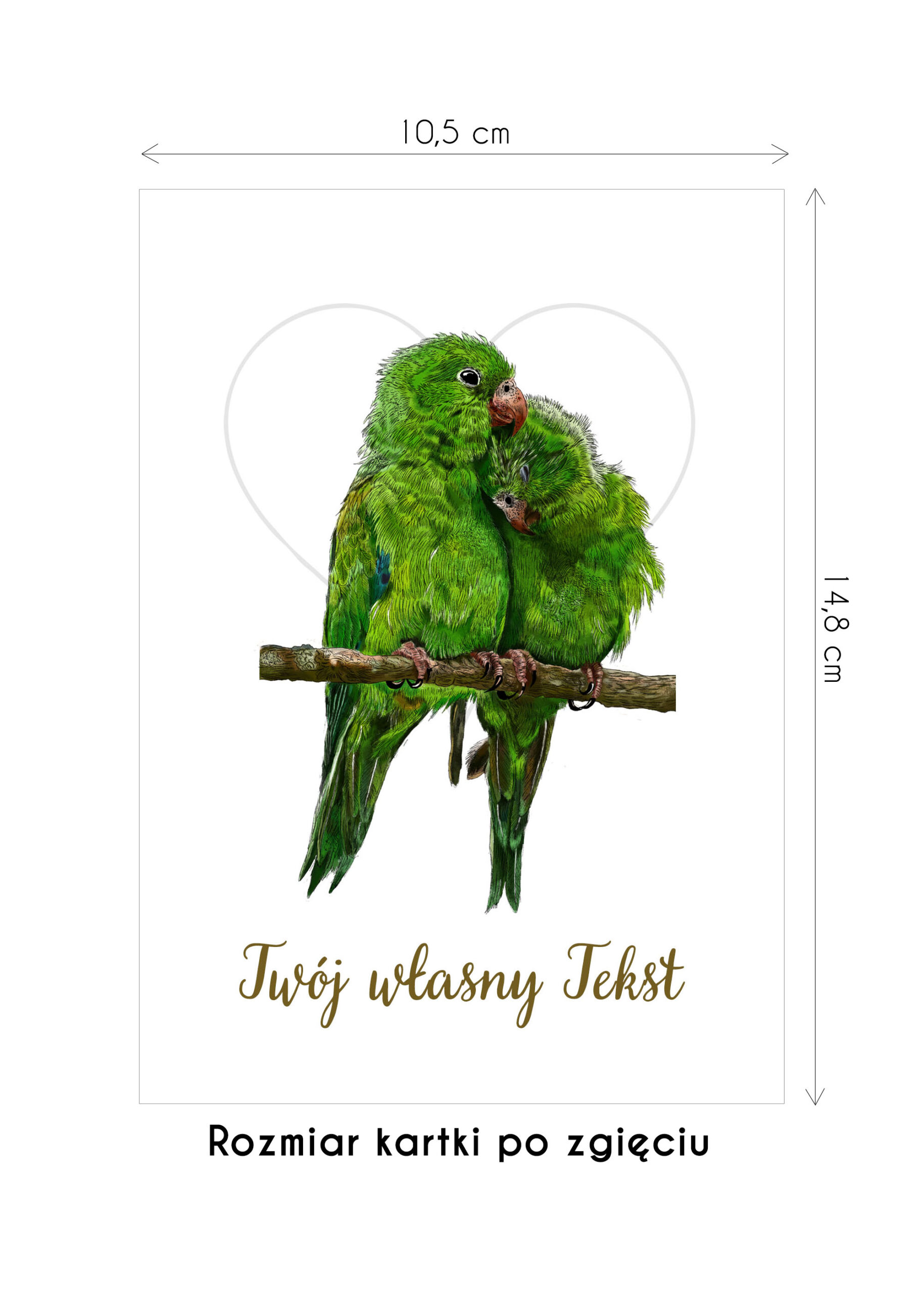 Każde serce zdobione jest indywidualnie złotą, połyskującą farbą, dzięki czemu każda kartka ma swój własny, niepowtarzalny urok. To detal, który naprawdę robi wrażenie. Kartka przedstawia ręcznie ilustrowaną parę Zielonych Papużek Nierozłączek, która drukowana jest na białym, gładkim papierze (250 gsm). Złote detale, rysowane ręcznie, pięknie mienią się w świetle, dodając elegancji Twojej wiadomości. Po złożeniu kartka ma wymiary 10,5 x 14,8 cm – idealny rozmiar na prezent.