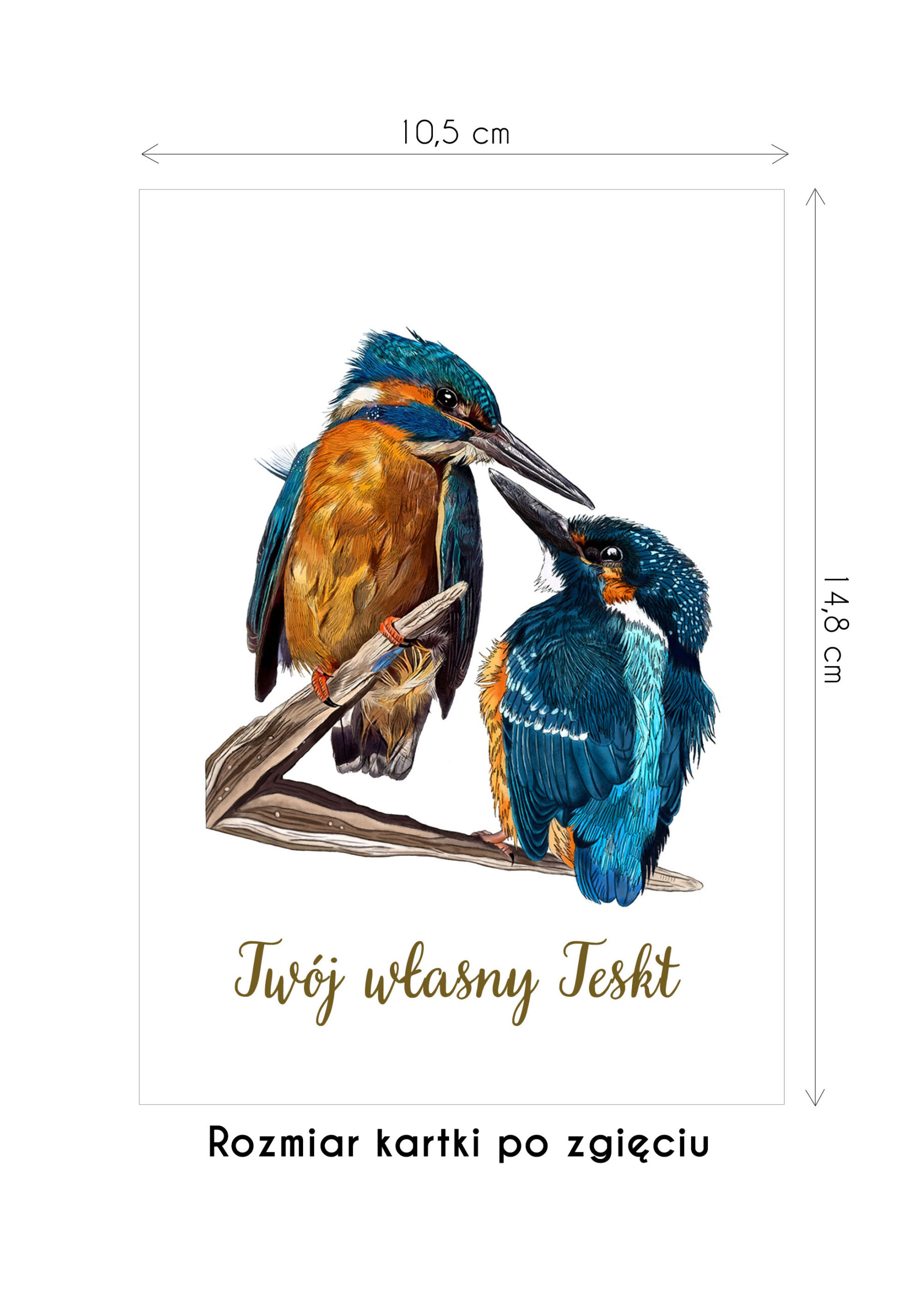Kartka przedstawia ręcznie ilustrowaną parę Zimorodków, która drukowana jest na białym, gładkim papierze (250 gsm). Złote detale, rysowane ręcznie, pięknie mienią się w świetle, dodając elegancji Twojej wiadomości. Po złożeniu kartka ma wymiary 10,5 x 14,8 cm – idealny rozmiar na prezent.