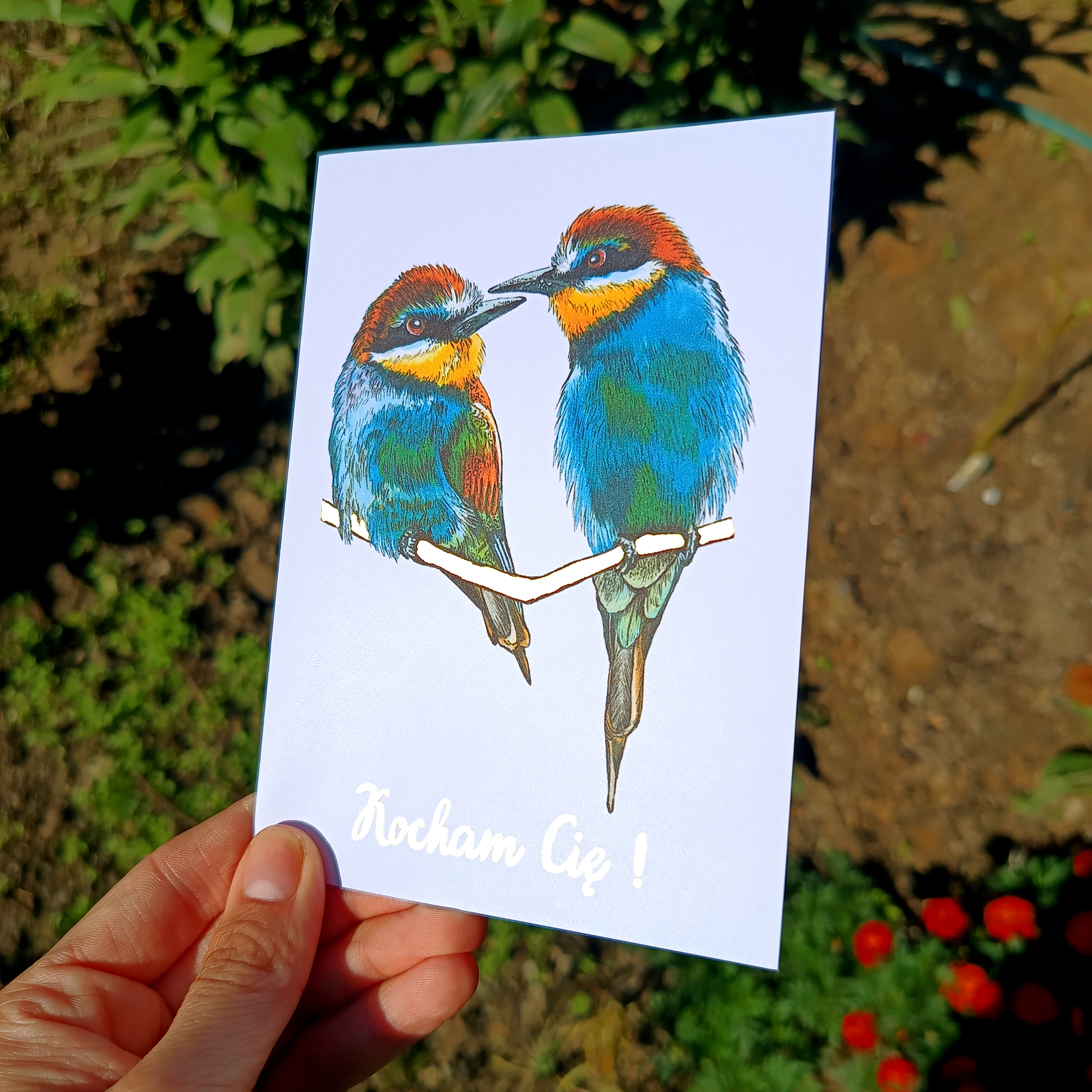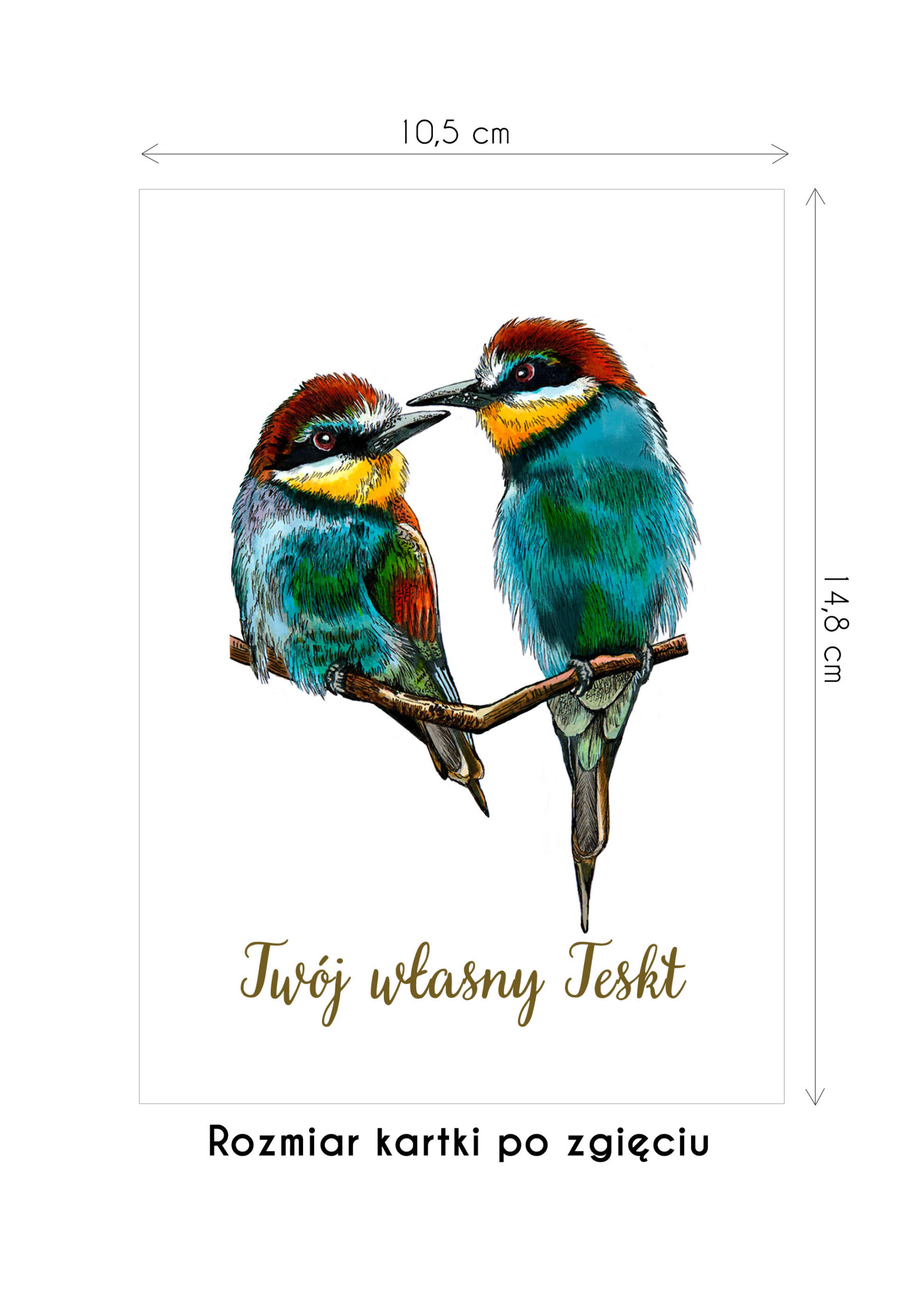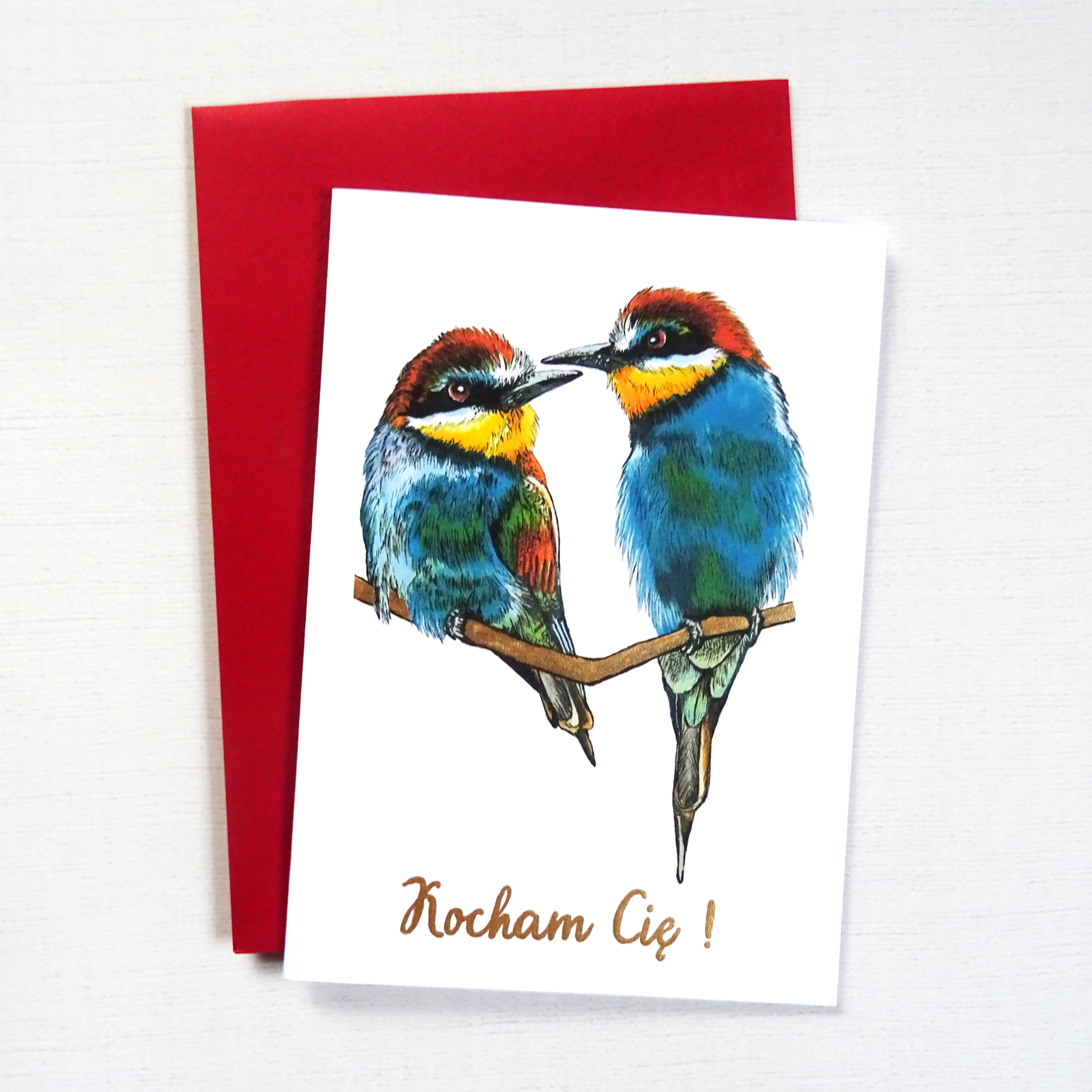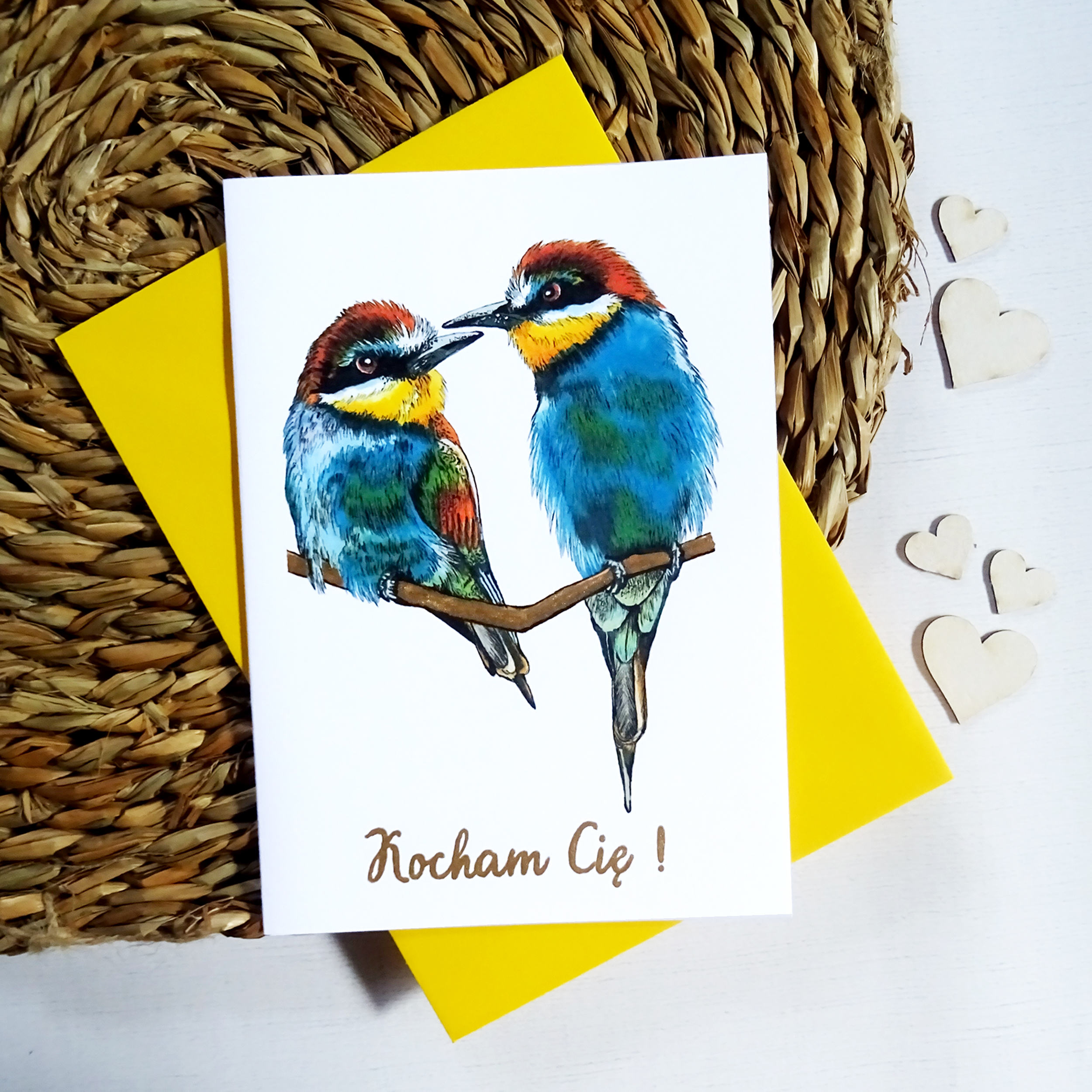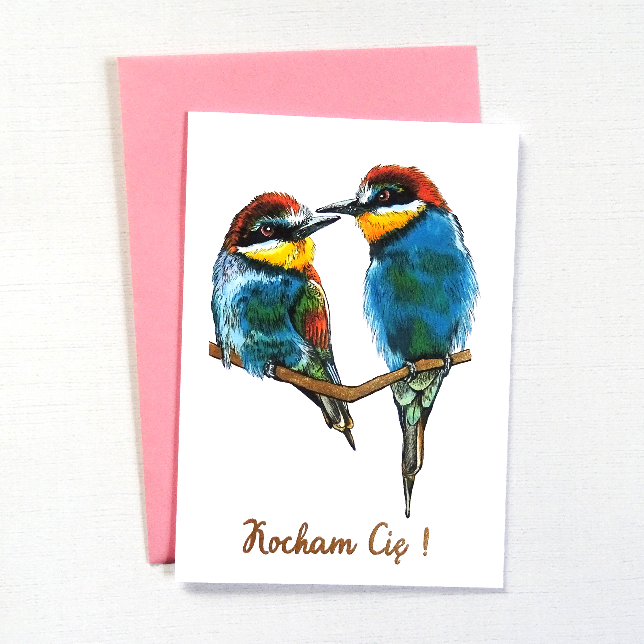 Na okładce znajdują się dwie kolorowe Żołny siedzące na jednej gałązce — symbol bliskości, ciepła i wzajemnego wsparcia. Wzrok ptaków kieruje się ku sobie, tworząc kompozycję pełną harmonii i delikatności. Całość dopełnia złote, błyszczący napis “Kocham Cię”, dodający kartce romantycznego uroku.