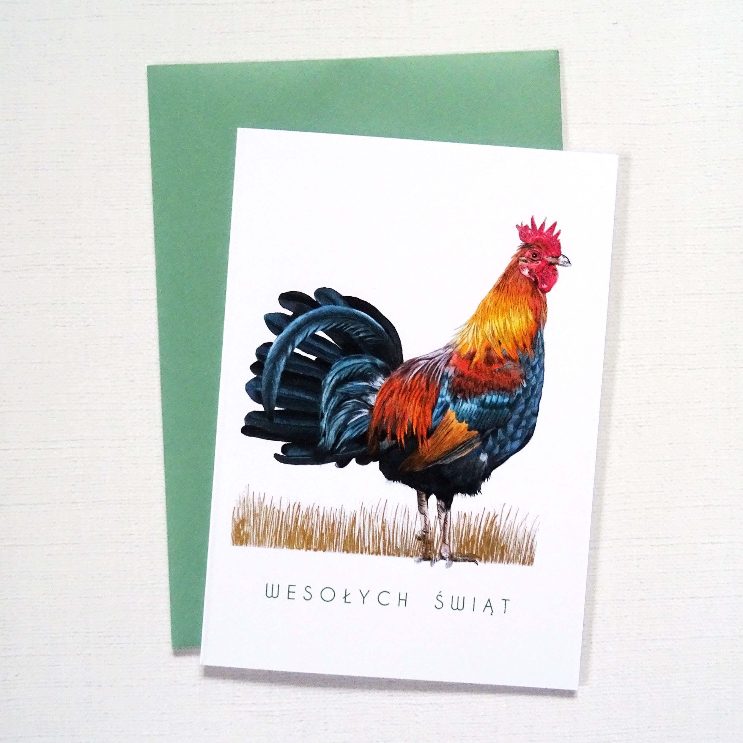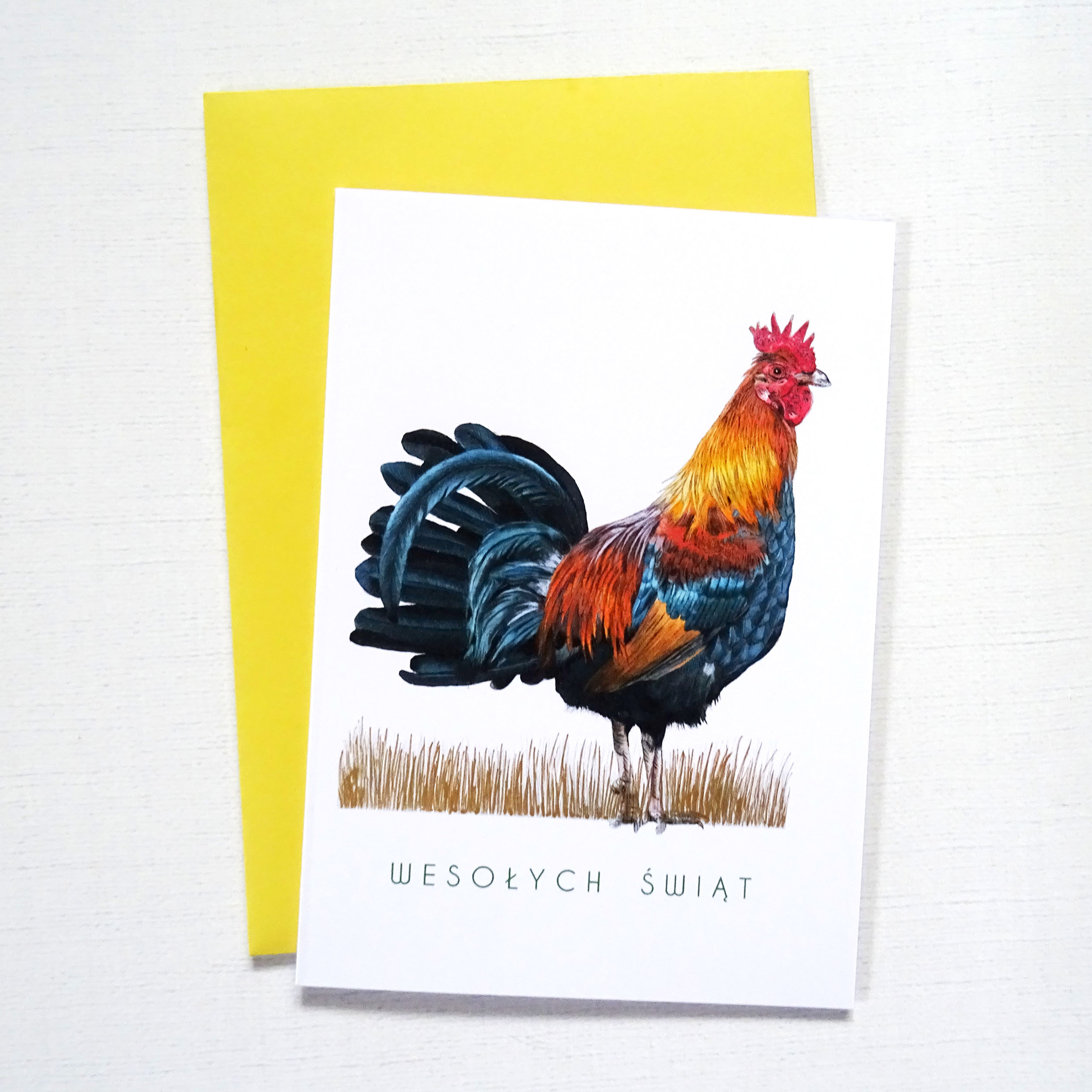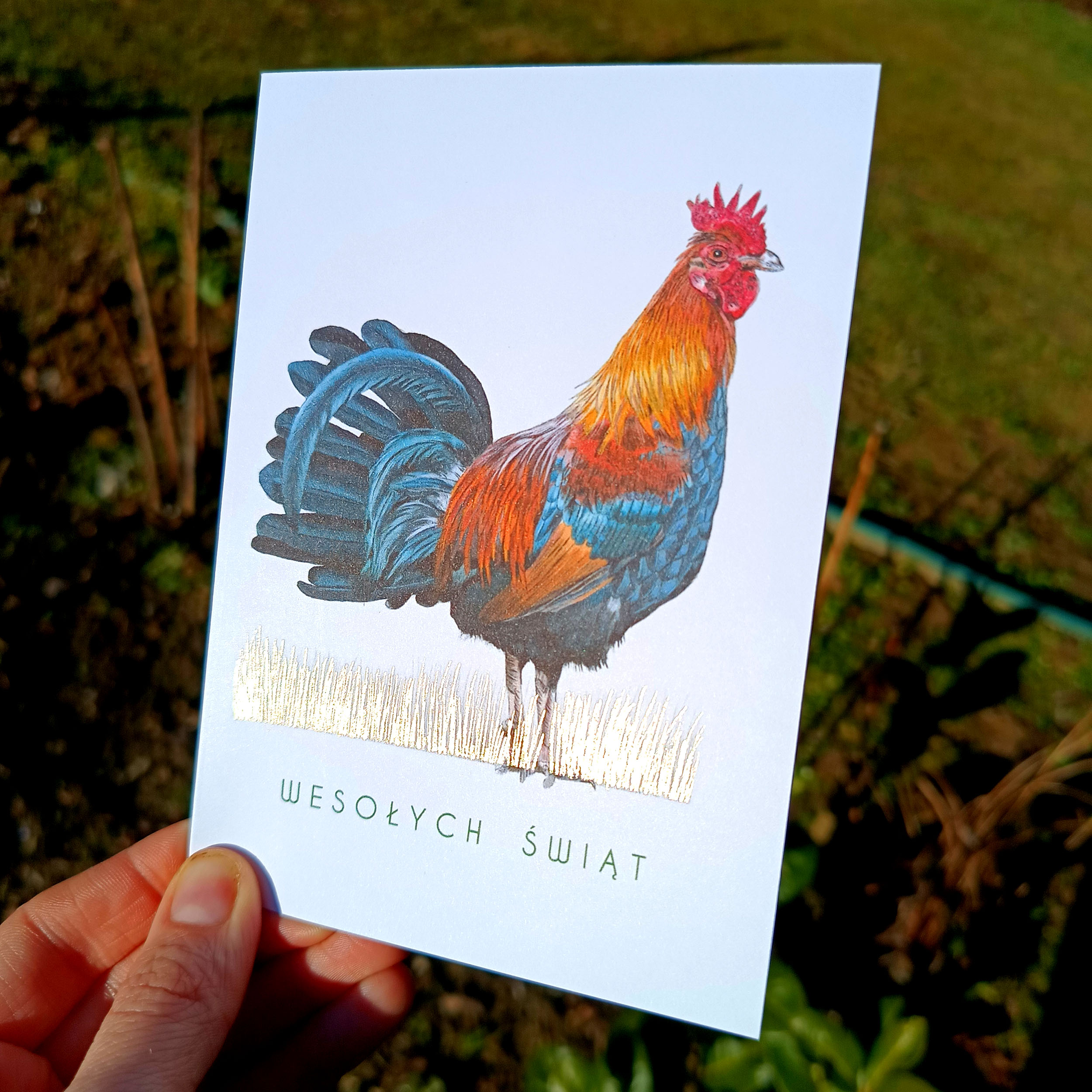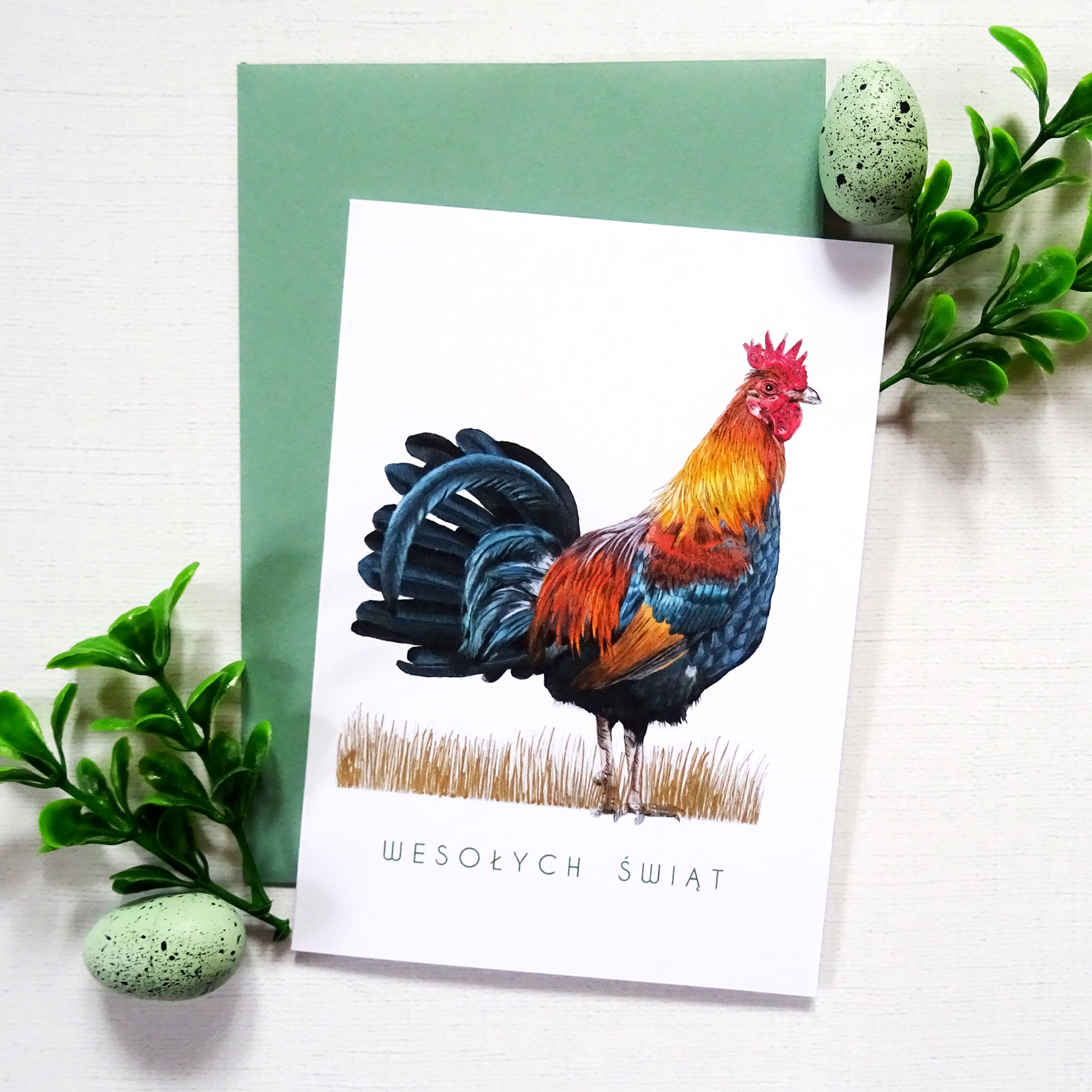 Głównym motywem kartki jest barwny, realistycznie przedstawiony kogut, kojarzony z budzącą się wiosną, światłem i nowym początkiem. Jego intensywne kolory przyciągają wzrok i nadają kartce charakteru, łącząc tradycję z nowoczesną estetyką.