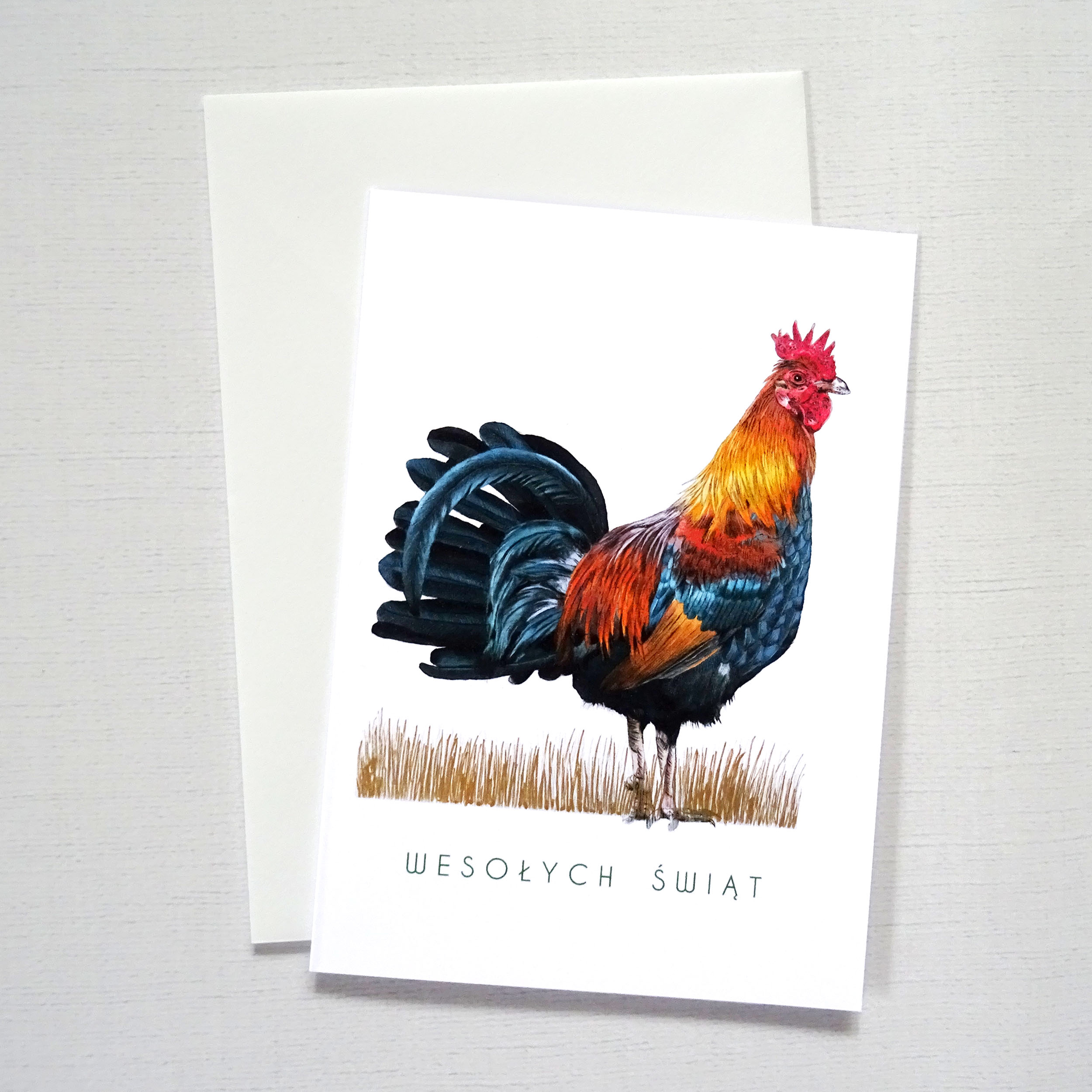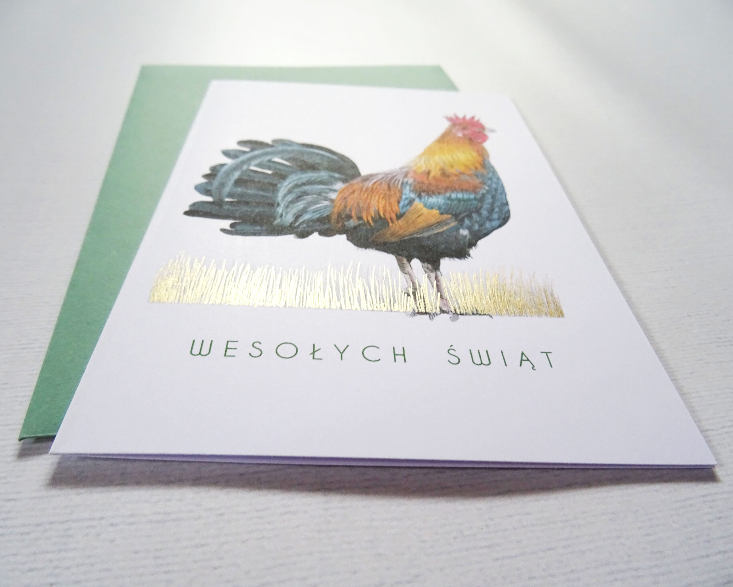 Kartka wielkanocna z kogutem, tradycyjna kartka wielkanocna to wyjątkowa forma świątecznych życzeń. Wyrazista ilustracja koguta, złote detale na trawie oraz napis „Wesołych Świąt” tworzą stylową kompozycję, która doskonale wpisuje się w klimat Wielkanocy.