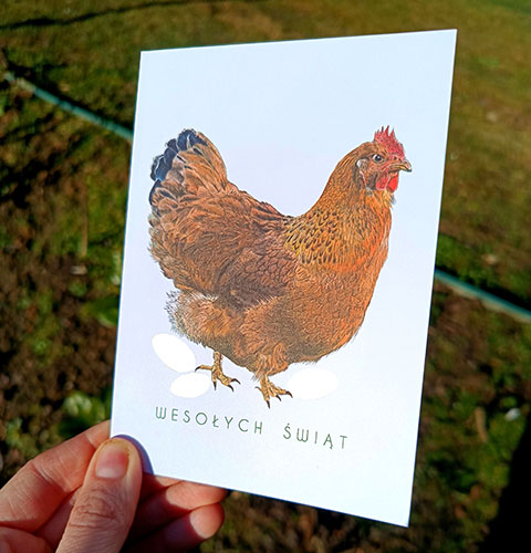 Kartka została wydrukowana na wysokiej jakości papierze o gramaturze 250 gsm, który podkreśla szczegóły ilustracji i nadaje elegancki wygląd. Napis „Wesołych Świąt” dodaje prostoty i świątecznego uroku.  Kartka po złożeniu wymiary 105 x 148 mm (format A6). Do kartki dołączona jest koperta do wyboru w trzech kolorach: biała, żółta i zielona  idealnie dopełnia naturalną estetykę projektu.