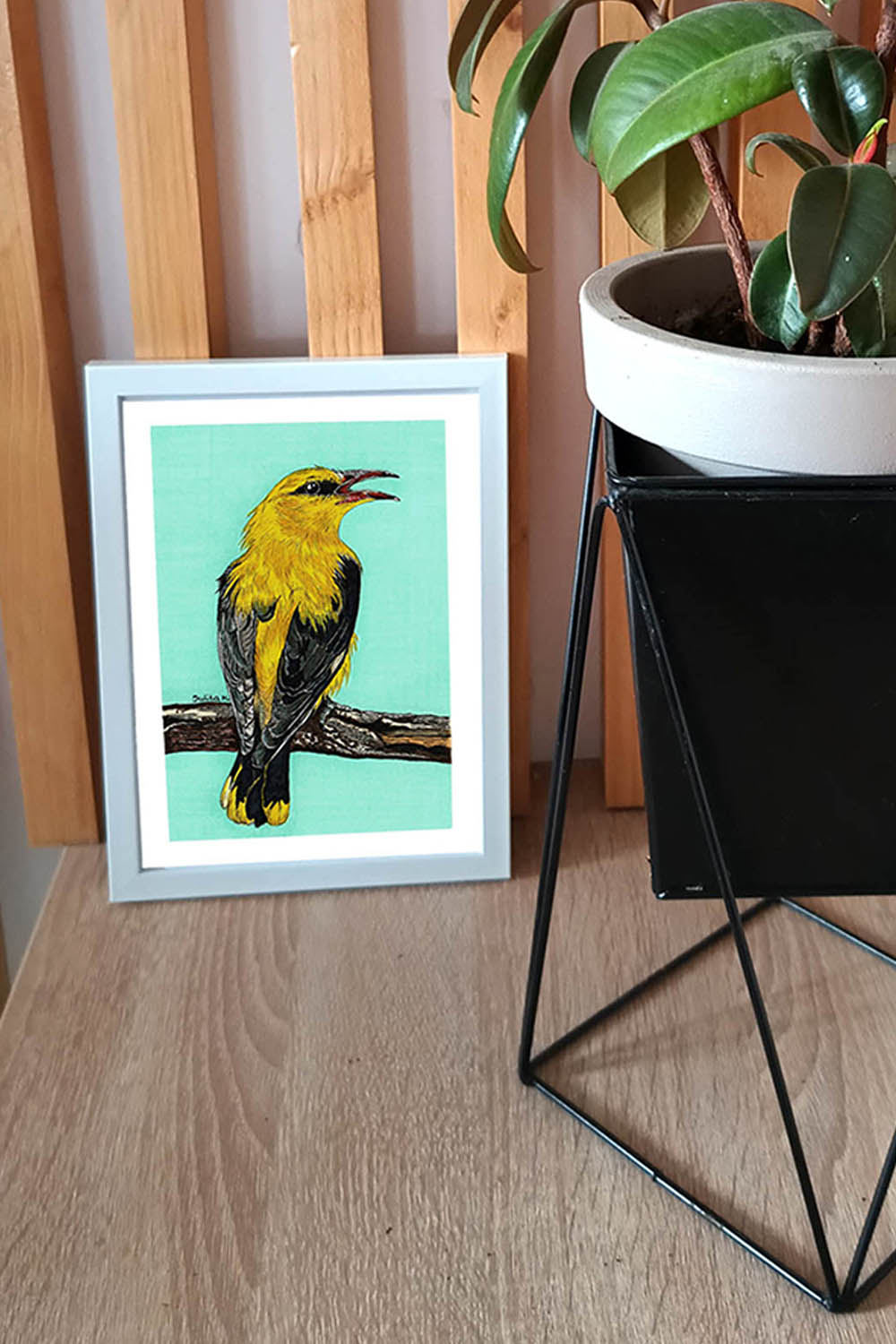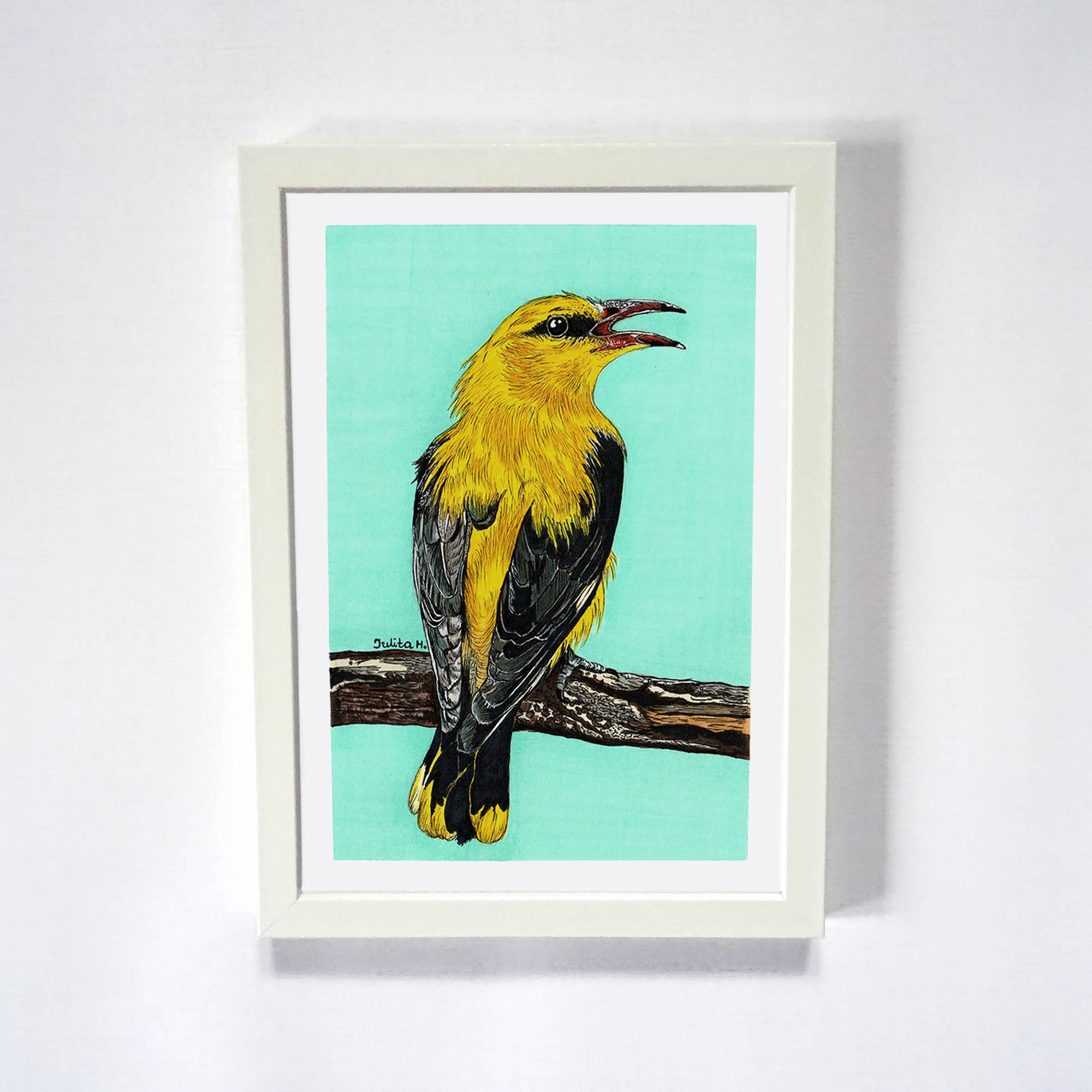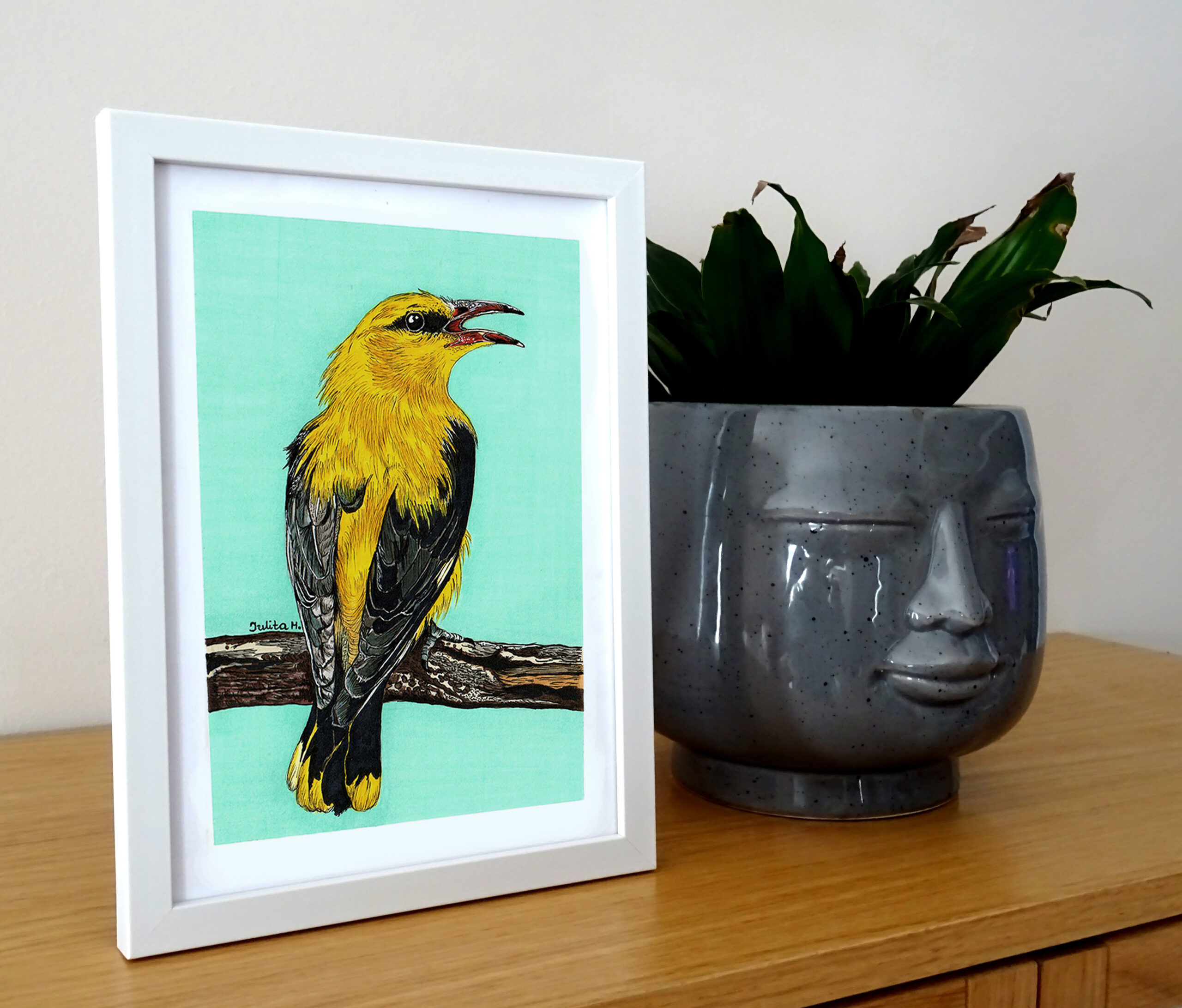Szukasz prezentu, który zachwyci bliską osobę? Ten obraz Wilgi to doskonały wybór dla fanów ptaków, miłośników natury lub każdego, kto ceni ręcznie wykonane dzieła sztuki. Idealny na urodziny, święta czy jako upominek „bez okazji”, ten rysunek to wyjątkowy sposób, by pokazać, że zależy Ci na obdarowanej osobie. Elegancka ramka w kolorze złamanej bieli podkreśla jego urok, czyniąc go gotowym do wręczenia.