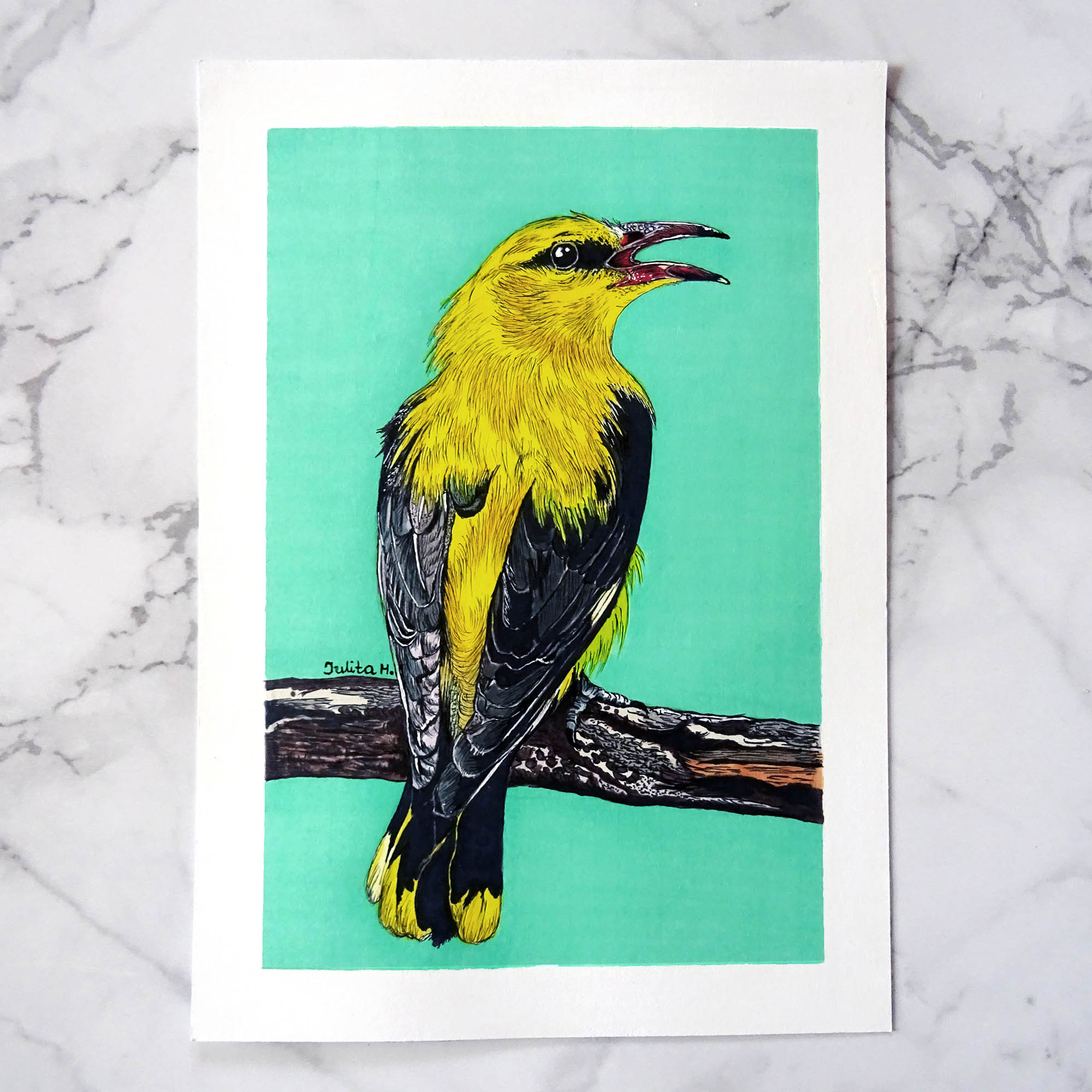 Przenieś piękno natury do swojego domu z tym oryginalnym obrazem Wilgi w formacie A5! Ręcznie wykonany na białym papierze 250 gsm techniką mieszaną (cienkopisy i promarkery), ten kolorowy rysunek to idealny prezent dla miłośników ptaków i natury. Dostępny z elegancką ramką w kolorze złamanej bieli lub bez oprawy, doskonale wpasuje się w rustykalne lub minimalistyczne wnętrza. Wesołe barwy Wilgi dodadzą radości i ciepła Twojej przestrzeni!