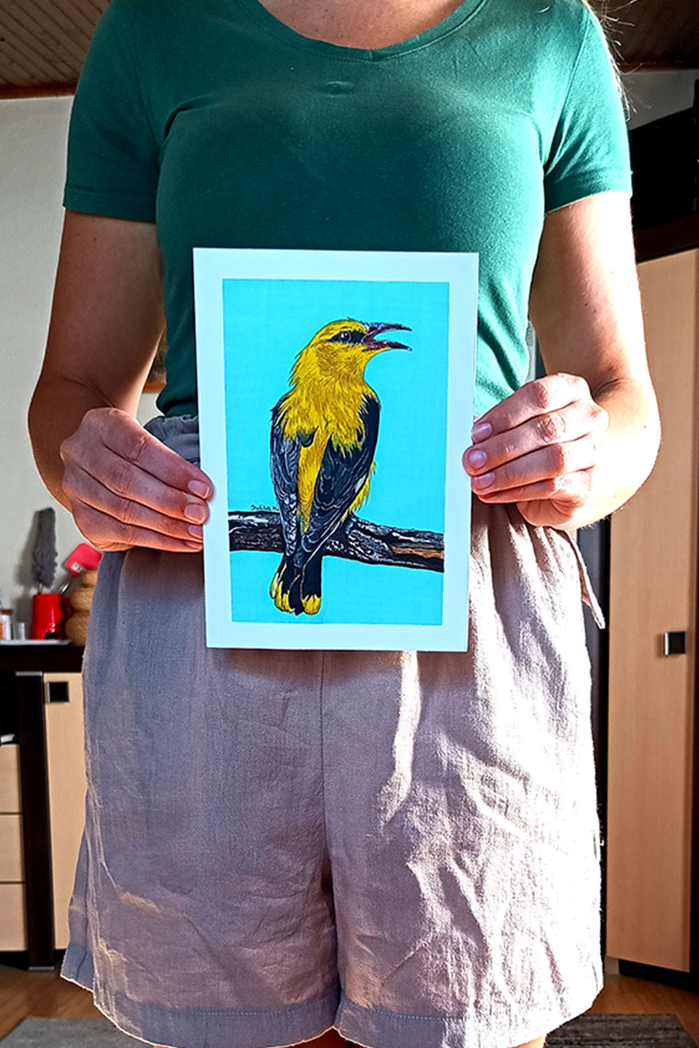 Ten ręcznie rysowany obraz Wilgi powstał z pasji do przyrody i miłości do ptaków. Żywe kolory promarkerów ożywiają każdy szczegół upierzenia, tworząc dzieło, które przyciąga wzrok i wywołuje uśmiech. Format A5 (14,8 x 21 cm) sprawia, że obraz jest idealny do powieszenia na ścianie lub postawienia na półce, dodając uroku Twojemu salonowi, sypialni czy kącikowi relaksu. Wybierz opcję z ramką, aby cieszyć się gotową dekoracją od razu po rozpakowaniu!