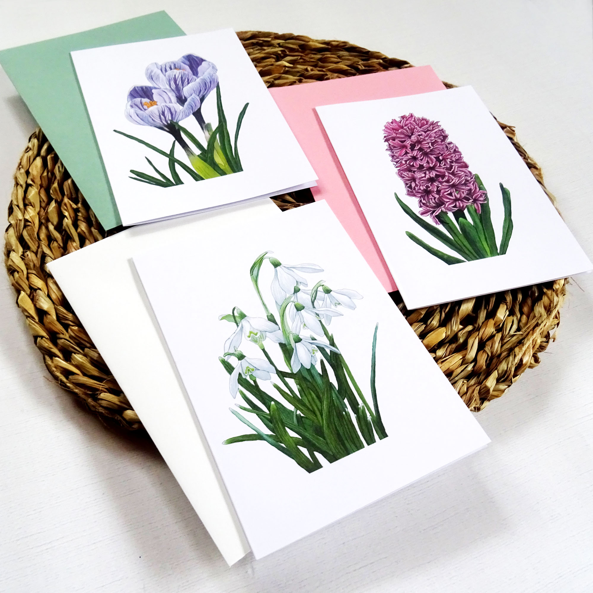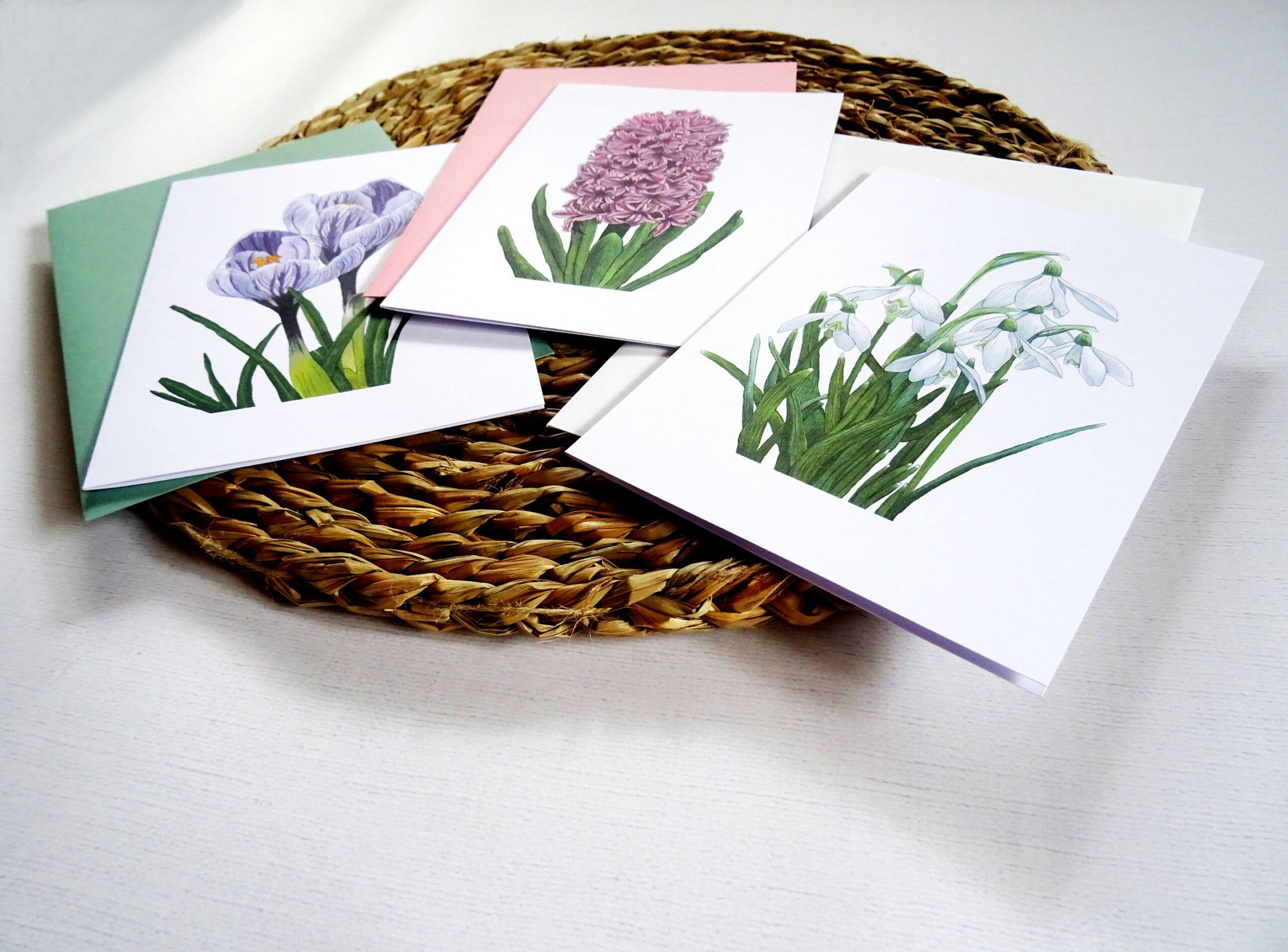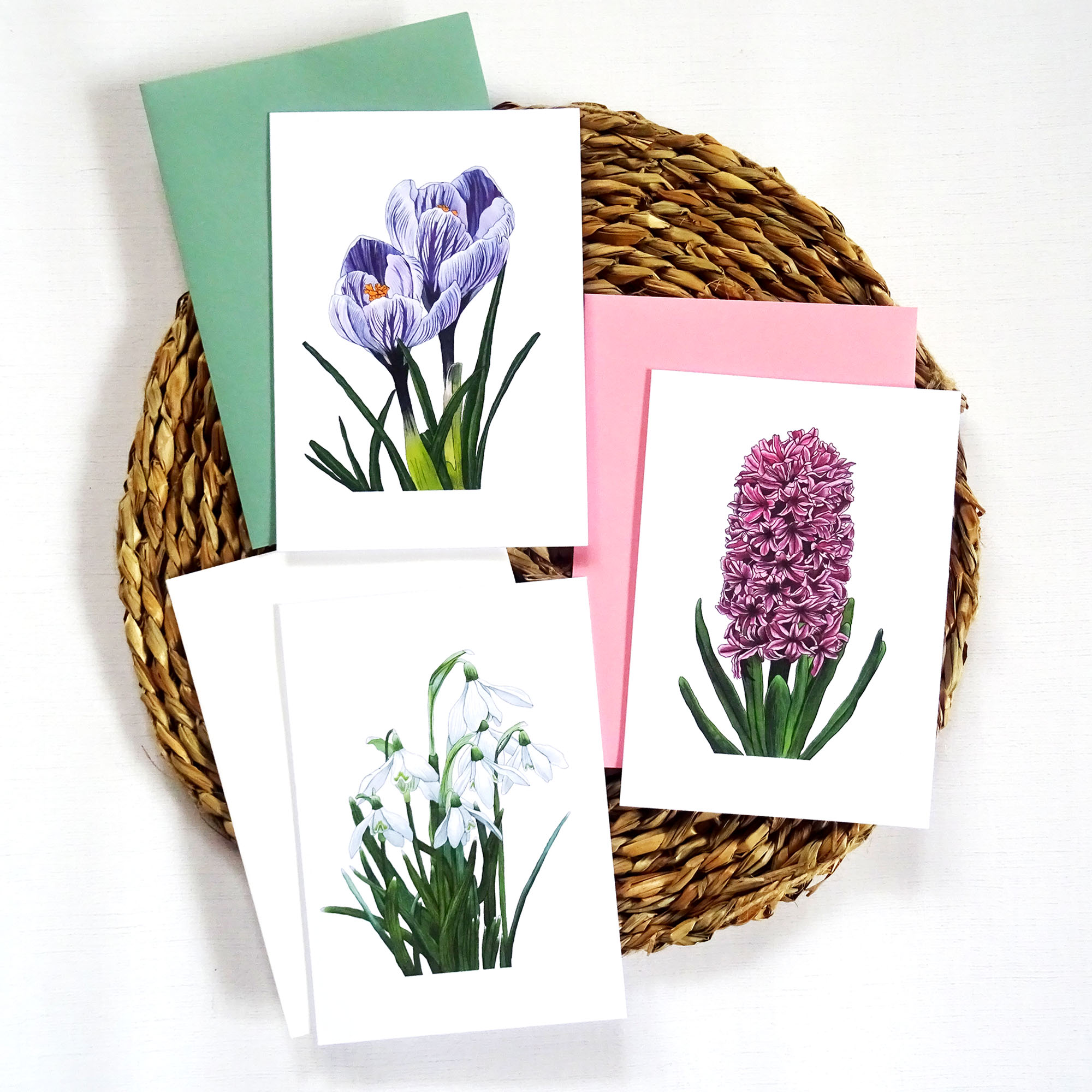 Wprowadź wiosenny nastrój dzięki ilustrowanym kartkom z motywem wiosennych kwiatów: Krokusami, Przebiśniegami i Hiacyntem. Idealne na Dzień Kobiet, Dzień Matki, Wielkanoc, urodziny lub imieniny.