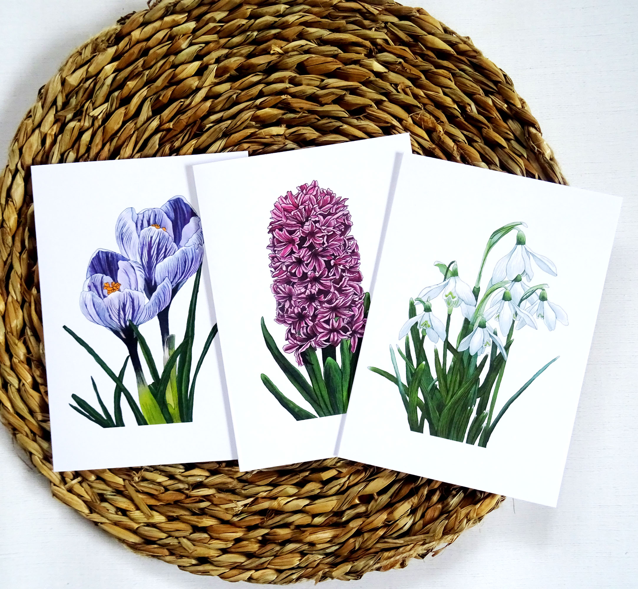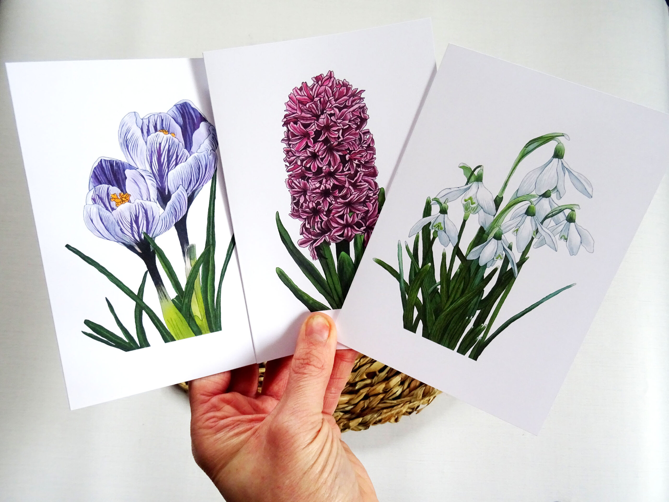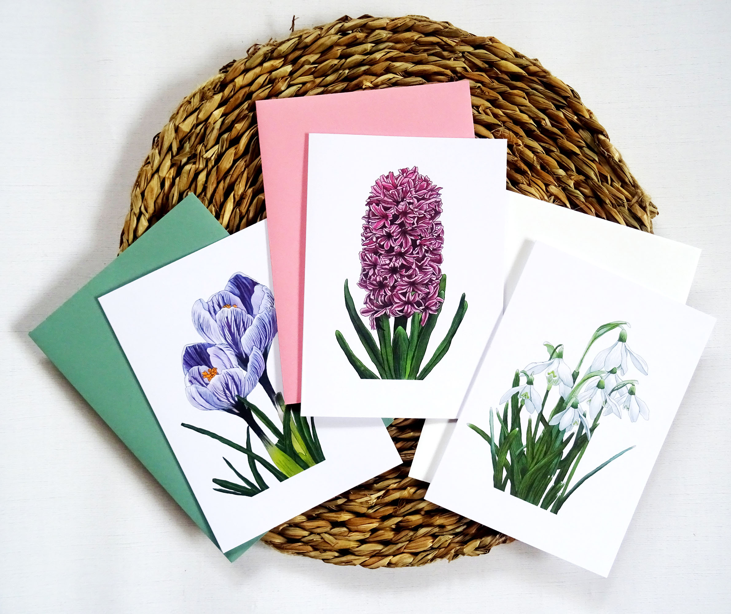 Wprowadź wiosenny nastrój dzięki ilustrowanym kartkom z motywem wiosennych kwiatów: Krokusami, Przebiśniegami i Hiacyntem. Idealne na Dzień Kobiet, Dzień Matki, Wielkanoc, urodziny lub imieniny.