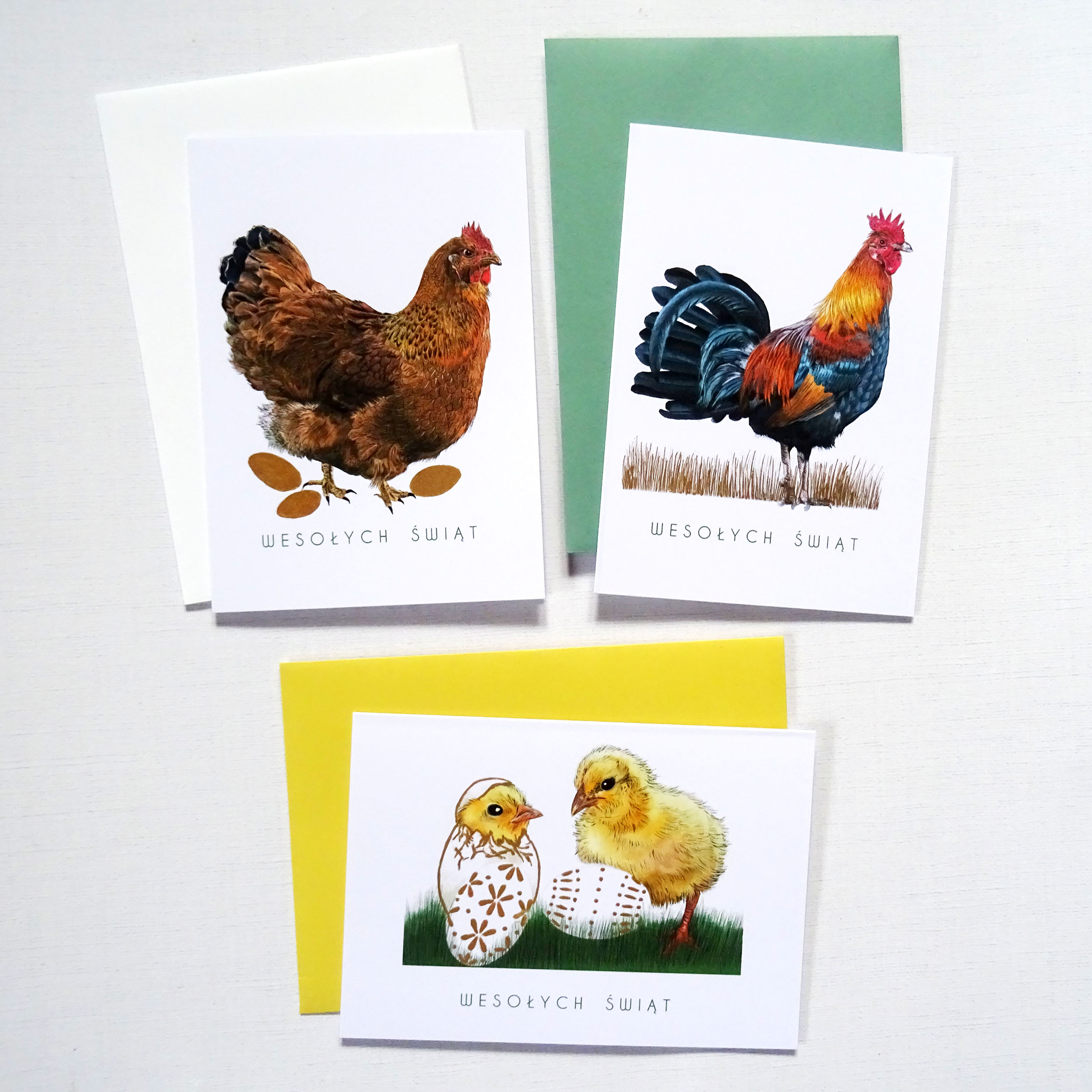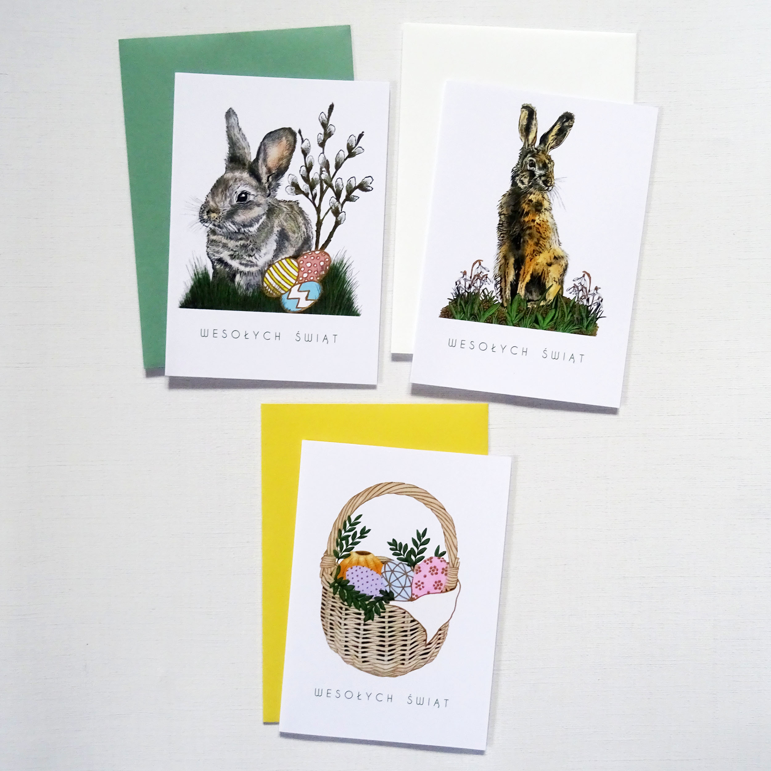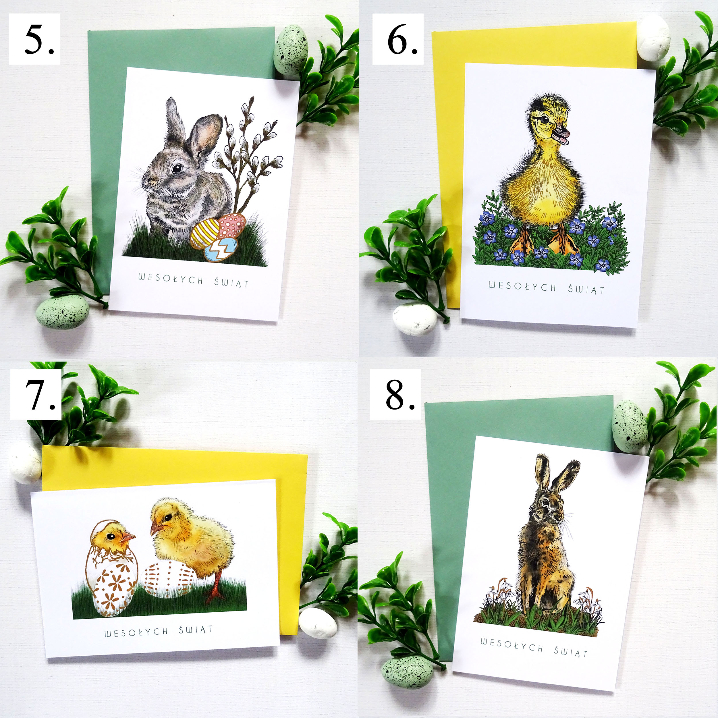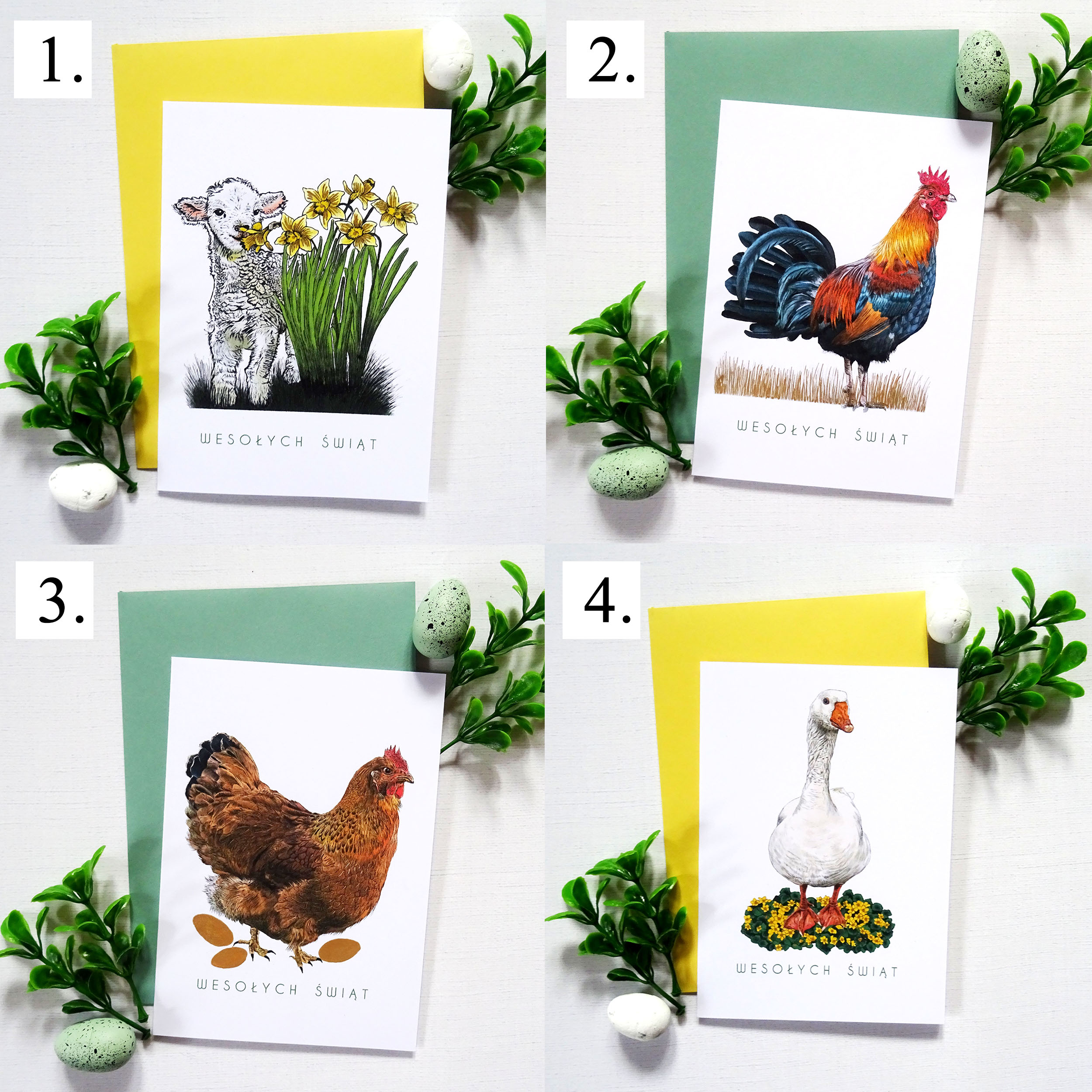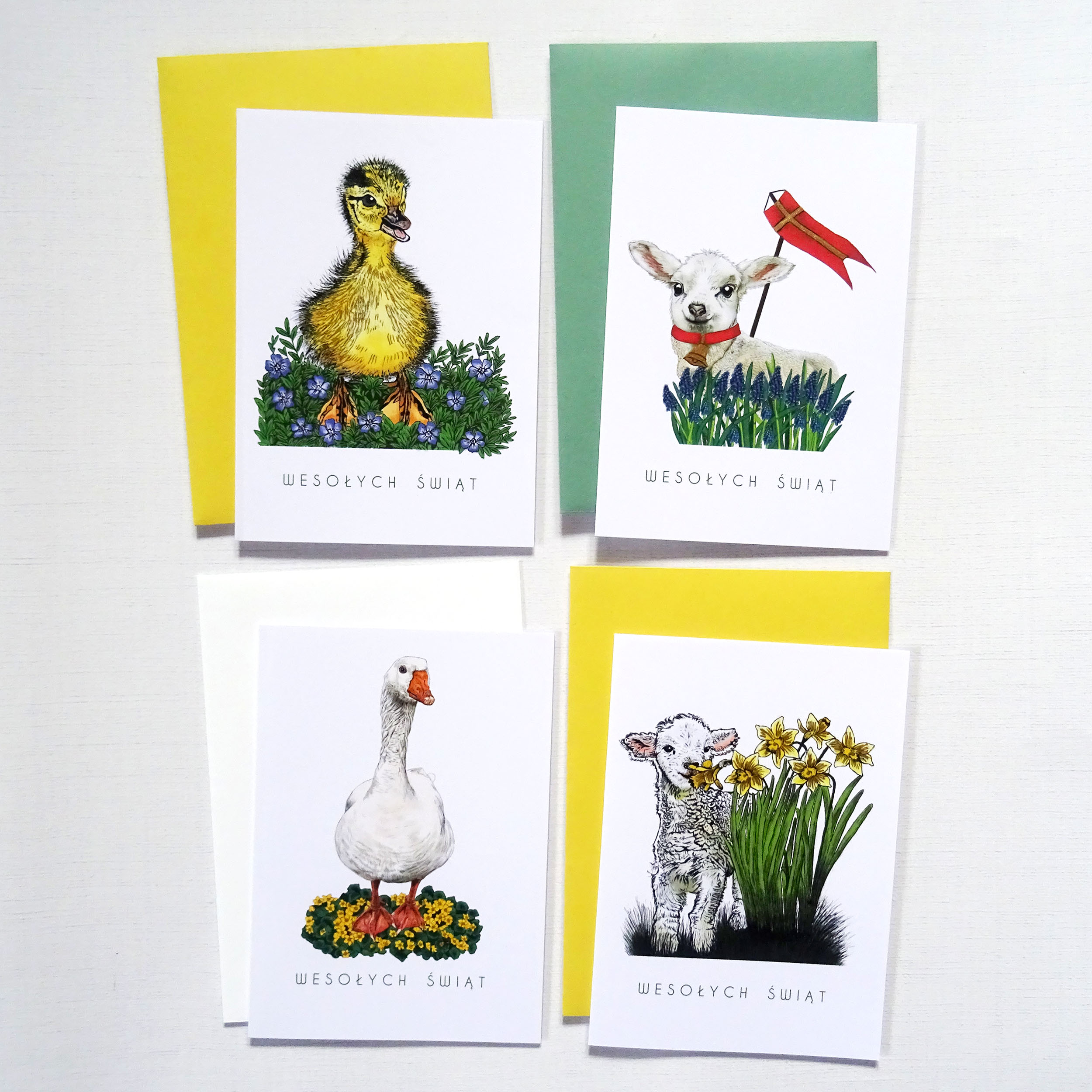 - Do każdej z wybranych kartek dołączona jest koperta do wyboru w trzech kolorach: zielonym, żółtym i białym. Jeśli wybierzesz kolor koperty np. zielony – w zestawie będą dołączone 4 zielone koperty do kartek.